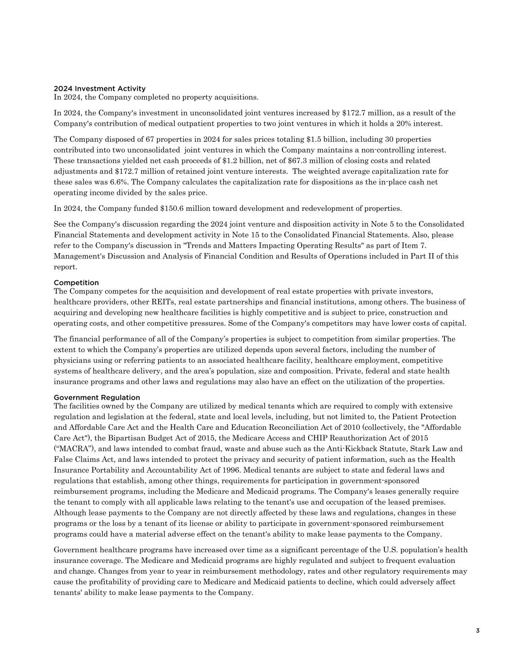 2024年投资活动2024年,公司未完成物业收购。2024年,公司对未合并合资企业的投资增加了1.727亿美元,这是由于公司向其持有20%权益的两家合资企业贡献了医疗门诊物业。该公司在2024年出售了67处房产,销售价格总计15亿美元,其中包括30处贡献给两家未合并的合资企业的房产,而该公司在其中保持着非控股权益。这些交易产生了12亿美元的净现金收益,扣除了6730万美元的交割成本和相关调整以及1.727亿美元的保留合资企业权益。这些销售的加权平均资本化率为6.6%。公司按照到位现金净营业收入除以销售价格计算处置资本化率。2024年,该公司为开发和重建物业提供了1.506亿美元的资金。请参阅公司在合并财务报表附注5中关于2024年合资和处置活动的讨论,以及在合并财务报表附注15中的开发活动。另外,请参阅公司在“影响经营业绩的趋势和事项”中的讨论,作为第7项的一部分。管理层对财务状况和经营成果的讨论和分析载于本报告第二部分。竞争公司与私人投资者、医疗保健提供商、其他REITs、房地产合伙企业和金融机构等竞争房地产物业的收购和开发。收购及发展新医疗设施的业务竞争激烈,受制于价格、建设及营运成本及其他竞争压力。公司的一些竞争对手可能有较低的资金成本。公司所有物业的财务表现受制于同类物业的竞争。公司物业的使用程度取决于几个因素,包括使用或转介患者到相关医疗机构的医生数量、医疗保健就业、竞争性医疗保健提供系统,以及该地区的人口、规模和构成。私人、联邦和州的健康保险计划和其他法律法规也可能对物业的利用产生影响。政府监管公司拥有的设施由医疗租户使用,这些租户需要遵守联邦、州和地方各级的广泛监管和立法,包括但不限于《患者保护和平价医疗法案》和2010年《医疗保健和教育和解法案》(统称为《平价医疗法案》)、2015年《两党预算法案》、2015年《医疗保险准入和CHIP重新授权法案》(“MCRA”),以及旨在打击欺诈、浪费和滥用的法律,如《反回扣法规》、《斯塔克法》和《虚假索赔法》,以及旨在保护患者信息隐私和安全的法律,例如1996年的《健康保险携带和责任法案》。医疗租户受州和联邦法律法规的约束,这些法律法规除其他外规定了参与政府资助的报销计划的要求,包括医疗保险和医疗补助计划。公司的租约一般要求租户遵守与租户使用和占用租赁场所有关的所有适用法律。尽管向公司支付的租赁付款不受这些法律法规的直接影响,但这些计划的变化或租户失去其参与政府赞助的报销计划的许可或能力可能会对租户向公司支付租赁付款的能力产生重大不利影响。随着时间的推移,政府的医疗保健项目在美国人口的医疗保险覆盖率中所占的比例越来越大。医疗保险和医疗补助计划受到高度监管,经常受到评估和改变。每年报销方法、费率和其他监管要求的变化可能会导致向医疗保险和医疗补助患者提供护理的盈利能力下降,这可能会对租户向公司支付租赁付款的能力产生不利影响。3