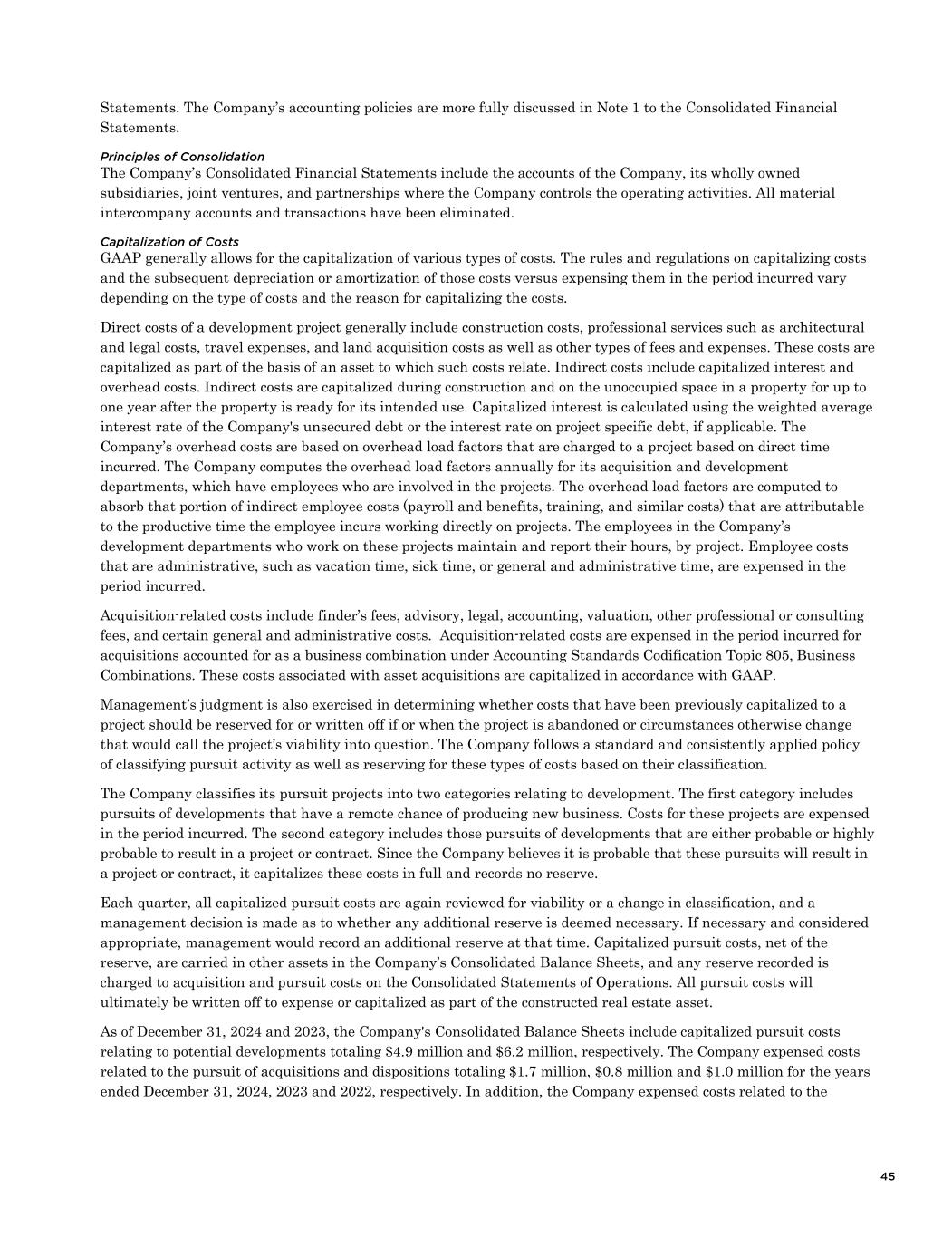 声明。公司的会计政策在合并财务报表附注1中进行了更全面的讨论。合并原则公司的合并财务报表包括公司、公司控制经营活动的全资子公司、合营企业和合伙企业的账目。所有重要的公司间账户和交易均已消除。成本资本化GAAP一般允许将各类成本资本化。关于将成本资本化以及这些成本的后续折旧或摊销与在发生期间将其费用化的规则和规定因成本类型和将成本资本化的原因而有所不同。开发项目的直接成本一般包括建设成本、建筑和法律费用等专业服务、差旅费、征地费用以及其他类型的费用和开支。这些成本被资本化,作为与这些成本相关的资产基础的一部分。间接成本包括资本化利息和间接费用。间接成本在建造期间以及在物业达到预定用途后长达一年的未占用空间上资本化。资本化利息采用公司无担保债务加权平均利率或项目特定债务利率(如适用)计算。公司的间接费用是基于间接负荷系数,根据直接发生的时间计入项目。该公司每年为其收购和开发部门计算架空负荷率,这些部门有参与项目的员工。计算间接费用负荷率是为了吸收间接员工成本(工资和福利、培训和类似成本)中可归因于员工直接在项目上工作所产生的生产时间的那部分。公司开发部门中从事这些项目的员工按项目维护和报告他们的工作时间。属于行政管理的雇员成本,如休假时间、病假时间或一般和行政时间,在发生期间费用化。收购相关成本包括finder的费用、咨询、法律、会计、估值、其他专业或咨询费用,以及某些一般和行政成本。根据会计准则编纂主题805,企业合并,作为企业合并入账的收购在发生期间计入与收购相关的成本。这些与资产收购相关的成本按照公认会计原则资本化。管理层的判断也适用于确定如果或当项目被放弃或情况发生其他变化会使项目的可行性受到质疑时,是否应为项目保留或注销先前已资本化的成本。公司遵循标准和一贯适用的政策,对追求活动进行分类,并根据其分类为这些类型的成本进行准备金。该公司将其追求的项目分为与发展相关的两类。第一类包括追求极有可能产生新业务的发展。这些项目的成本在发生期间计入费用。第二类包括那些很可能或极有可能导致项目或合同的发展追求。由于公司认为这些追求很可能会导致项目或合同,因此公司将这些成本全额资本化,并且不记录准备金。每个季度,所有资本化的追求成本都会再次审查其可行性或分类的变化,并就是否认为有必要增加任何额外储备作出管理层决定。如有必要且认为适当,管理层届时将记录额外准备金。资本化的追索成本(扣除准备金)在公司综合资产负债表的其他资产中列示,记录的任何准备金在综合经营报表中计入购置和追索成本。所有追讨成本最终将被冲销为费用或作为所构建房地产资产的一部分资本化。截至2024年12月31日和2023年12月31日,公司的合并资产负债表包括与潜在发展相关的资本化追求成本,总额分别为490万美元和620万美元。截至2024年12月31日、2023年和2022年12月31日止年度,公司将与收购和处置相关的费用分别计为170万美元、0.8百万美元和1.0百万美元。此外,公司费用化了与45
