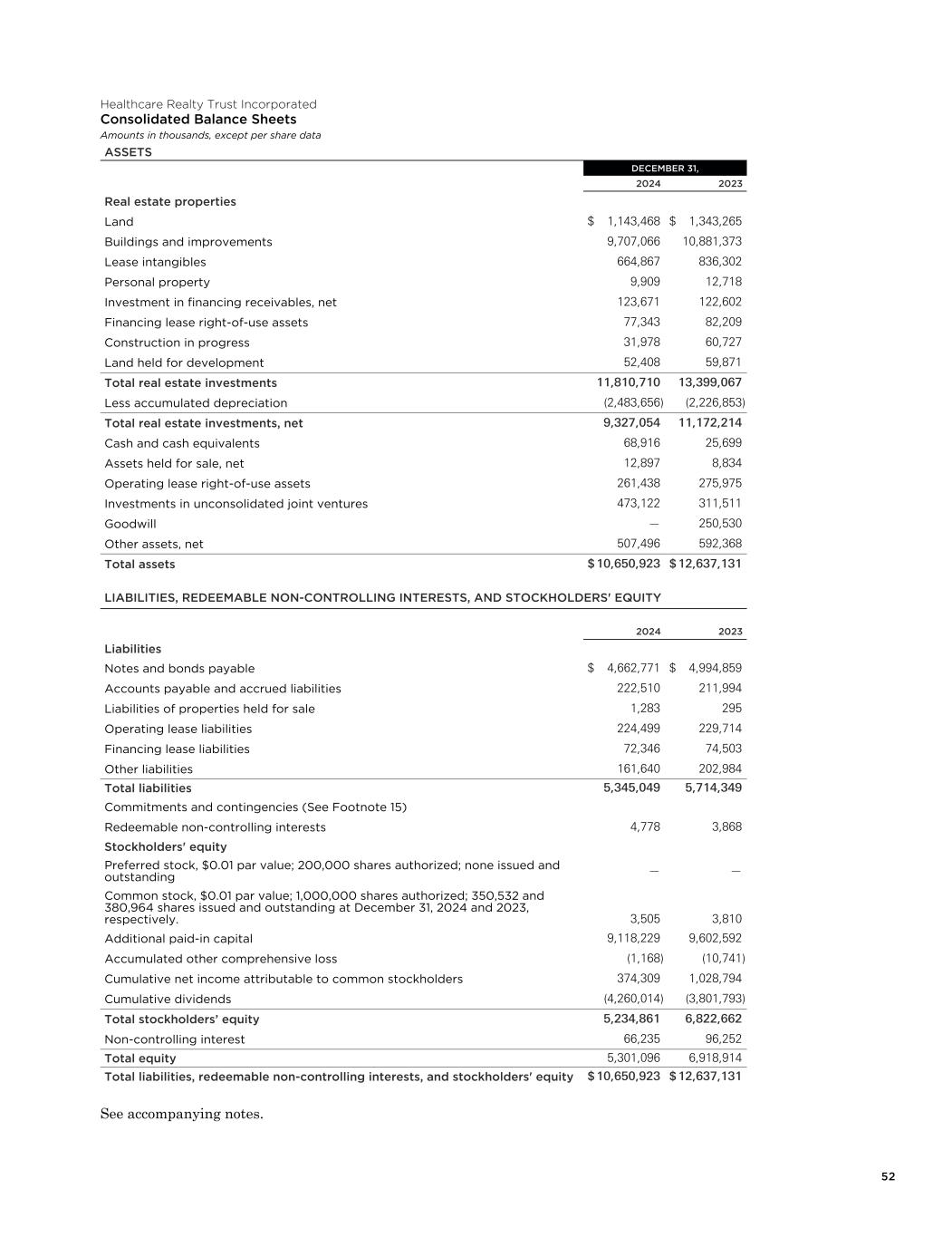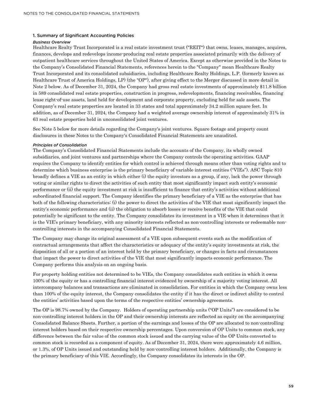 1.重要会计政策摘要业务概览Healthcare Realty Trust Incorporated是一家房地产投资信托基金(“REIT”),主要在美国各地拥有、租赁、管理、收购、融资、开发和再开发与提供门诊医疗保健服务相关的创收房地产。除公司合并财务报表附注另有规定外,此处提及“公司”是指在下文附注2中更详细讨论的合并生效后,Healthcare Realty Trust Incorporated及其合并子公司,包括Healthcare Realty Holdings,L.P.(原名Healthcare Trust of America Holdings,LP)(“OP”)。截至2024年12月31日,公司在589处综合房地产、在建工程、重建、融资应收账款、融资租赁使用权资产、为开发而持有的土地和公司财产中的房地产投资总额约为118亿美元,不包括持有待售资产。该公司的房地产位于33个州,总面积约为3420万平方英尺。此外,截至2024年12月31日,公司在未合并的合营企业中持有的63处房地产物业中拥有约31%的加权平均所有权权益。有关公司合营企业的更多详情,请参阅下文附注5。公司综合财务报表的这些附注中的平方英尺和财产数量披露未经审计。合并原则本公司的合并财务报表包括本公司、其全资附属公司以及本公司控制经营活动的合营企业和合伙企业的账目。GAAP要求公司确定通过投票权以外的方式实现控制权的实体,并确定哪个企业是可变利益实体(“VIE”)的主要受益人。ASC主题810广义地将VIE定义为:在其中(i)作为一个群体的股权投资者(如果有的话)缺乏通过投票权或类似权利来指导该实体对该实体的经济绩效产生最重大影响的活动的权力,或者(ii)存在风险的股权投资在没有额外次级财务支持的情况下不足以为该实体的活动提供资金的实体。公司将VIE的主要受益人确定为同时具有以下两个特征的企业:(i)有权指导对实体经济绩效影响最大的VIE活动,以及(ii)有义务吸收VIE可能对实体具有重大意义的损失或获得利益。当公司确定其为VIE的主要受益人时,公司将合并其对VIE的投资,任何少数股东权益在随附的合并财务报表中反映为非控制性权益或可赎回的非控制性权益。公司可能会在后续事件发生时改变其对VIE的原始评估,例如合同安排的修改会影响实体的风险股权投资的特征或充分性,主要受益人所持有的全部或部分权益的处置,或影响对经济绩效影响最大的VIE指导活动的权力的事实和情况的变化。公司持续进行这一分析。对于未被确定为VIE的财产持有实体,公司将其拥有100%股权或拥有控股财务权益的此类实体合并,证明其拥有多数投票权权益。所有公司间余额和交易在合并中消除。对于公司拥有低于100%股权的实体,如果公司有直接或间接能力根据各自实体所有权协议的条款控制实体的活动,则公司将合并该实体。OP由公司持有98.7%。经营合伙单位(“OP单位”)的持有人被视为OP的非控股权益持有人,其所有权权益在随附的综合资产负债表中反映为权益。此外,OP的部分收益和亏损将根据其各自的所有权百分比分配给非控股权益持有人。在将OP单位转换为普通股时,已发行普通股的公允价值与转换为普通股的OP单位的账面价值之间的任何差额将被记录为权益的组成部分。截至2024年12月31日,非控股权益持有人持有的已发行和未偿还的OP单位约为460万个,即1.3%。此外, 该公司是这一VIE的主要受益者。因此,公司合并其在OP中的权益。合并财务报表附注5 9