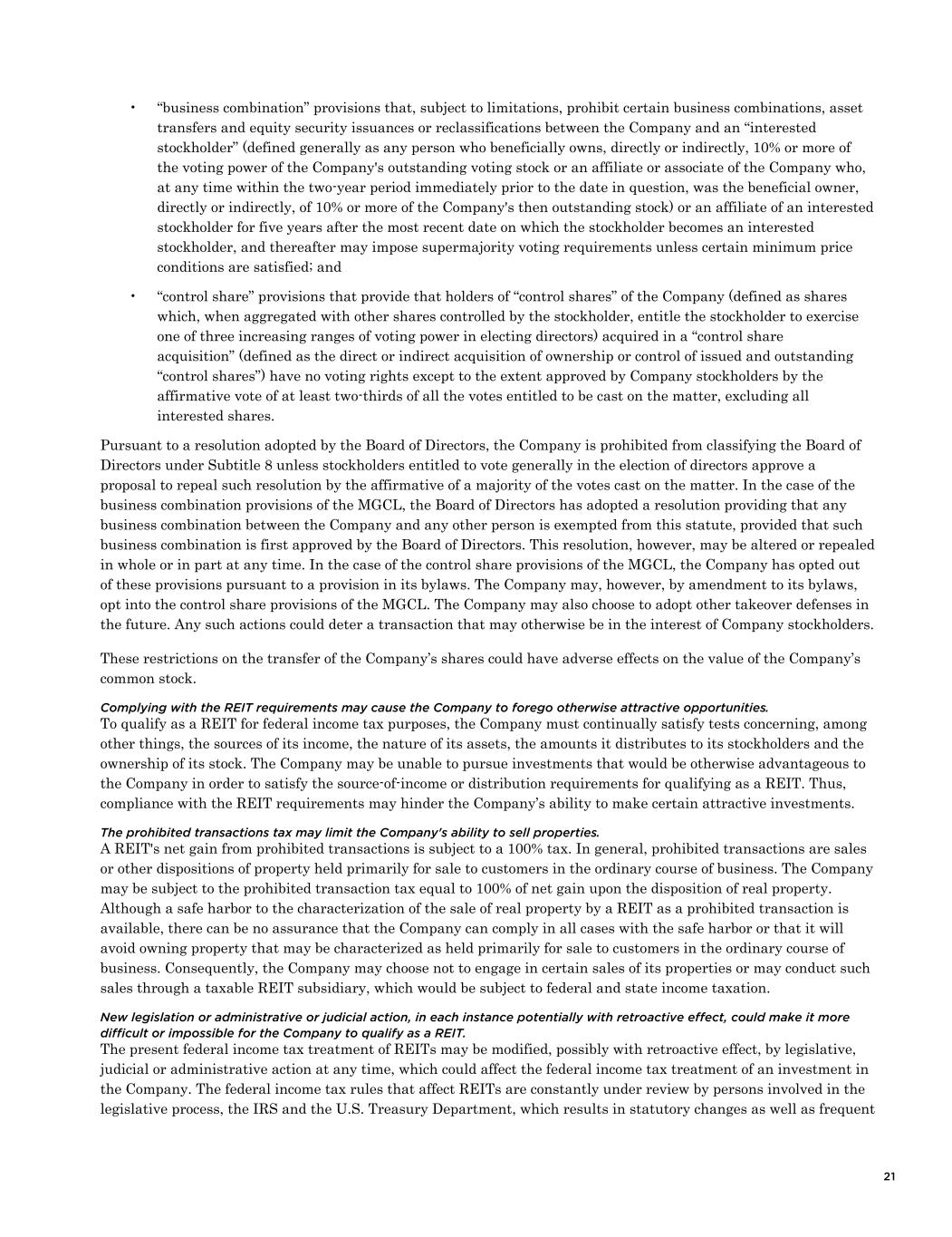 持续的要求。此外,公司能否满足符合REIT资格的要求部分取决于公司没有控制权或仅有有限影响力的第三方的行动,包括公司拥有被归类为美国联邦所得税目的合伙企业的实体的股权的情况。如果公司未能保持作为REIT的资格,公司将受到重大不利后果的影响,包括对其普通股的价值产生不利影响。该公司打算以允许其继续符合联邦所得税目的的REIT资格的方式运营。尽管该公司认为它有资格成为REIT,但它无法就联邦所得税目的提供任何关于它将继续有资格成为REIT的保证。公司作为REIT的持续资格将取决于在持续的基础上满足某些资产、收入、组织、分配、股东所有权和其他要求。公司满足资产测试的能力取决于其资产的特征和公平的市场价值。公司是否遵守REIT收入和季度资产要求还取决于公司是否有能力持续成功地管理公司收入和资产的构成。因此,无法保证美国国税局(“IRS”)不会辩称公司的运营方式违反了任何REIT要求。如果公司未能在任何纳税年度获得REIT资格,公司将按常规公司税率对其应税收入征收联邦所得税,并可能增加州和地方税(公司可能需要借钱或出售资产以支付任何此类税款)。此外,支付给公司股东的股息将不会被公司在计算其应纳税所得额时扣除。任何由此产生的公司纳税义务都可能是巨大的,并将减少可分配给公司股东的现金数量,进而可能对公司普通股的价值产生不利影响。此外,在这种情况下,公司将不再被要求支付股息以维持REIT地位,这可能会对公司普通股的价值产生不利影响。除非公司有权根据《国内税收法》的某些条款获得减免,否则公司也将在公司未能获得REIT资格的下一年的四个纳税年度继续被取消作为REIT的纳税资格。即使公司仍然有资格作为REIT纳税,公司仍须就其收入和资产缴纳某些联邦、州和地方税,包括任何未分配应税收入的税,以及州或地方收入、特许经营权、财产和转让税。这些税务负债将减少公司的现金流,并可能对公司普通股的价值产生不利影响。有关已缴纳的州所得税的更多具体信息,请参见合并财务报表附注16。公司的公司章程,以及MGCL的规定,包含对公司普通股可转让性的限制和限制,这可能会对公司普通股的价值产生不利影响。为了符合REIT的资格,在一个纳税年度的最后半年,不超过50%的公司已发行股份价值可能由五个或更少的个人(根据《国内税收法》的定义,包括某些实体)直接或间接拥有。为协助遵守这一REIT要求,公司的公司章程载有限制股份转让的条款,在此类转让后,受让方将拥有公司已发行股票数量或价值超过9.8%的股份。如果尽管有这一禁令,但获得的股票使受让人的所有权增加到已发行股票价值的9.8%以上,则超过这9.8%价值的股票被视为以信托方式持有以供转让,价格不超过所谓的受让人为股票支付的价格,并且在以信托方式持有的情况下,该股票无权获得股息或投票权。此外,在这些情况下,公司有权赎回这类股票。此外,适用于公司的MGCL的某些条款可能具有禁止或阻止第三方提出收购公司的提议或在可能为公司股东提供机会实现高于该等股份当时市场价格的溢价的情况下延迟或阻止控制权变更的效果,包括:• MGCL标题3副标题8中允许董事会的条款, 未经股东批准且无论公司章程或章程目前有何规定,实施一定的收购抗辩;20