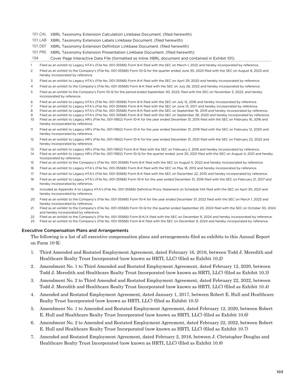 101.CAL XBRL分类学扩展计算linkbase文档。(随函归档)101.LAB XBRL分类学扩展标签Linkbase文档。(随函归档)101.DEF XBRL分类学扩展定义linkbase文档。(随函归档)101.PRE XBRL分类学扩展演示Linkbase文档。(随函归档)104封面页交互式数据文件(格式为内联XBRL文档,包含在附件 101中)。1作为Legacy HTA(文件编号:001-35568)于2022年3月1日向SEC提交的8-K表格的证据提交,并在此以引用方式并入。2作为公司于2023年8月8日向SEC提交的截至2023年6月30日的季度的10-Q表格(文件编号001-35568)的证据提交,特此以引用方式并入。3作为Legacy HTA(文件编号:001-35568)表格8-K于2020年4月29日向SEC提交的证据提交,并在此以引用方式并入。4作为公司于2022年7月26日向SEC提交的8-K表格(文件编号001-35568)的证据提交,特此通过引用并入。5作为截至2023年9月30日期间的公司表格10-Q的证据提交,于2023年11月3日向SEC提交,并在此通过引用并入。6作为Legacy HTA(文件编号:001-35568)表格8-K于2016年7月12日向SEC提交的证据提交,并在此通过引用并入。7作为Legacy HTA(文件编号001-35568)表格8-K于2017年6月13日向SEC提交的证据提交,并在此以引用方式并入。8作为Legacy HTA(文件编号001-35568)表格8-K于2019年9月16日向SEC提交的证据提交,并在此以引用方式并入。9作为Legacy HTA(文件编号:001-35568)表格8-K于2020年9月28日向SEC提交的证据提交,并在此以引用方式并入。10作为证物提交给Legacy HR(文件编号001-11852)于2016年2月16日向SEC提交的截至2015年12月31日止年度的10-K表格,并在此通过引用并入。11作为Legacy HR(文件编号001-11852)于2020年2月12日向SEC提交的截至2019年12月31日止年度的10-K表格的证据提交,并在此通过引用并入。12作为证物提交给Legacy HR(文件编号001-11852)于2022年2月22日向SEC提交的截至2021年12月31日止年度的10-K表格,并在此通过引用并入。13作为Legacy HR(文件编号001-11852)于2016年2月2日向SEC提交的8-K表格的证据提交,并在此通过引用并入。14作为Legacy HR(文件编号001-11852)于2021年8月4日向SEC提交的截至2021年6月30日的季度的10-Q表格的附件提交,特此通过引用并入。15作为公司于2022年8月5日向SEC提交的8-K表格(文件编号001-35568)的证据提交,特此通过引用并入。16作为Legacy HTA(文件编号:001-35568)表格8-K于2012年5月18日向SEC提交的证据提交,并在此以引用方式并入。17作为Legacy HTA(文件编号001-35568)表格8-K于2010年12月22日向SEC提交的证据提交,并在此通过引用并入。18作为Legacy HTA(文件编号001-35568)于2017年2月21日向SEC提交的截至2016年12月31日止年度的10-K表格的证据提交,并在此以引用方式并入。19包括在Legacy HTA(文件编号001-35568)于2021年4月30日向SEC提交的关于附表14A的最终委托书的附录A中,并在此以引用方式并入。20作为公司于2023年3月1日向美国证券交易委员会提交的截至2022年12月31日止年度的10-K表格(文件编号001-35568)的证据提交,特此以引用方式并入。21作为公司截至2024年9月20日的季度的10-Q表格(文件编号001-35568)的证据提交,于2024年10月30日向SEC提交,并在此通过引用并入。22作为证据提交给公司于2024年12月9日向SEC提交的(文件编号001-35568)表格8-K/A,并在此通过引用并入。23作为证据提交给公司(文件编号001-35568)于2024年12月9日向SEC提交的8-K表格,并在此通过引用并入。高管薪酬计划和安排以下是在表格10-K上作为证据提交给本年度报告的所有高管薪酬计划和安排的列表:1。第三次经修订和重述的雇佣协议,日期为2016年2月16日,由Todd J. Meredith与Healthcare Realty Trust Incorporated(现称为HRTI,LLC)(以附件 10.2提交)2。2020年2月12日Todd J. Meredith与Healthcare Realty Trust Incorporated(现称为HRTI,LLC)(以附件 10.3提交)之间的第三次经修订和重述的雇佣协议第1号修正案。2022年2月22日Todd J. Meredith与Healthcare Realty Trust Incorporated(现称为HRTI,LLC)(以附件 10.4提交)之间的第三次经修订和重述的雇佣协议的第2号修正案4。经修订及重订的雇佣协议,日期为2017年1月1日, Robert E. Hull和Healthcare Realty Trust Incorporated(现称为HRTI,LLC)(以附件 10.5提交)之间的协议5。2020年2月12日Robert E. Hull与Healthcare Realty Trust Incorporated(现称为HRTI,LLC)(以附件 10.6提交)之间经修订和重述的雇佣协议的第1号修正案6。2022年2月22日Robert E. Hull与Healthcare Realty Trust Incorporated(现称为HRTI,LLC)(以附件 10.7提交)对经修订和重述的雇佣协议进行的第2号修订7。2016年2月2日J. Christopher Douglas与Healthcare Realty Trust Incorporated(现称为HRTI,LLC)(以附件 10.8提交)签订的经修订和重述的雇佣协议103