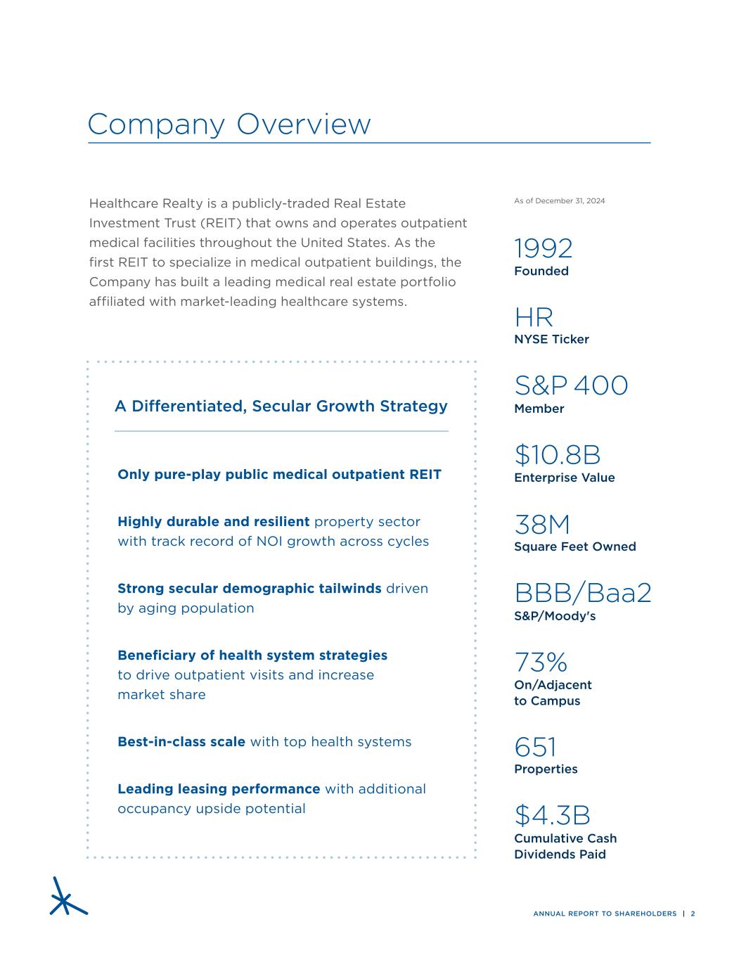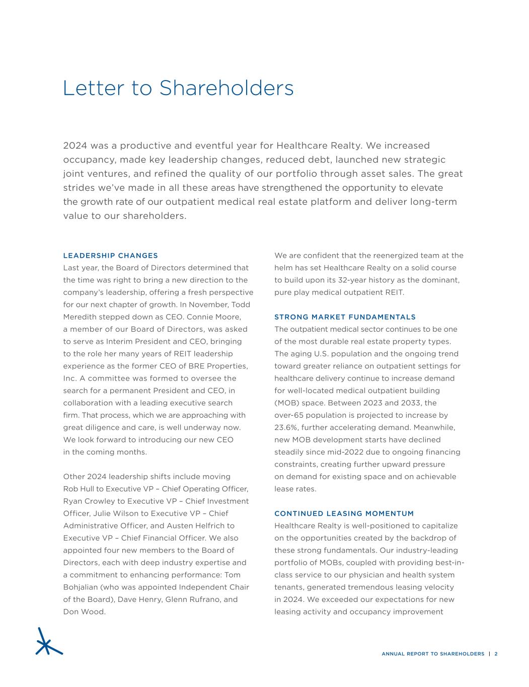 致股东的年度报告| 22024是Healthcare Realty丰硕多事的一年。我们增加了入住率,进行了关键的领导层变动,减少了债务,推出了新的战略合资企业,并通过资产出售来完善我们的投资组合质量。我们在所有这些领域取得的巨大进步,加强了提升我们门诊医疗地产平台增长率并为我们的股东带来长期价值的机会。致股东的信领导层变动去年,董事会认为时机成熟,为公司领导层带来了新的方向,为我们下一章的增长提供了全新的视角。11月,托德·梅雷迪思(Todd Meredith)辞去首席执行官一职。我们的董事会成员Connie Moore被要求担任临时总裁兼首席执行官,这让她作为不莱梅财产公司前首席执行官拥有多年的REIT领导经验。与一家领先的猎头公司合作,成立了一个委员会,负责监督寻找永久总裁兼首席执行官的工作。我们正以极大的勤奋和谨慎接近这一进程,目前这一进程正在顺利进行中。我们期待着在未来几个月内引入我们的新CEO。2024年的其他领导层变动包括将Rob Hull调至执行副总裁–首席运营官、Ryan Crowley调至执行副总裁–首席投资官、Julie Wilson调至执行副总裁–首席行政官,以及Austen Helfrich调至执行副总裁– 首席财务官。我们还任命了四名新的董事会成员,他们都拥有深厚的行业专业知识,并致力于提升业绩:Tom Bohjalian(被任命为董事会独立主席)、Dave Henry、Glenn Rufrano和Don Wood。我们有信心,这支重新焕发活力的掌舵团队,已经让Healthcare Realty走上了一条坚实的道路,以其32年的历史作为一家独大、纯玩医疗门诊REIT的基础上再接再厉。强劲的市场基础门诊医疗板块继续是最持久的房地产物业类型之一。美国人口老龄化以及医疗服务越来越依赖门诊环境的持续趋势,继续增加了对位置优越的医疗门诊大楼(MOB)空间的需求。2023年至2033年期间,65岁以上人口预计将增长23.6%,进一步加速需求。与此同时,由于持续的融资限制,MOB新开发开工量自2022年年中以来稳步下降,这对现有空间的需求和可实现的租赁利率造成了进一步的上行压力。持续租赁势头Healthcare Realty处于有利位置,可以利用这些强劲基本面背景下创造的机会。我们行业领先的MOB组合,加上为我们的医生和卫生系统租户提供一流的服务,在2024年产生了巨大的租赁速度。我们在新租赁活动和入住率改善方面超出了我们的预期