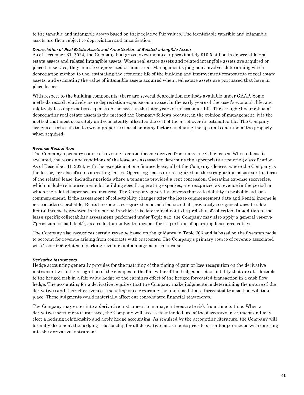 以有形资产和无形资产的相对公允价值为基础。可辨认的有形和无形资产,然后进行折旧和摊销。房地产资产折旧和相关无形资产摊销截至2024年12月31日,公司在可折旧房地产资产和相关无形资产方面的投资总额约为105亿美元。不动产资产及相关无形资产取得或者投入使用时,必须进行折旧或者摊销。管理层的判断涉及确定采用哪种折旧方法,估计房地产资产的建筑物和改善部分的经济寿命,以及估计购买具有未到位租赁的房地产资产时获得的无形资产的价值。关于建筑部件,在GAAP下有几种折旧方法可用。有些方法在资产的经济寿命早期记录的资产折旧费用相对较多,而在其经济寿命的后期记录的资产折旧费用相对较少。房地产资产折旧直线法是公司遵循的方法,因为在管理层看来,这是最准确、最一致地在资产的估计寿命内分配成本的方法。公司根据许多因素,包括物业在收购时的年龄和状况,为其拥有的物业分配使用寿命。收入确认公司的主要收入来源是来自不可撤销租约的租金收入。在执行租赁时,对租赁条款和条件进行评估,以确定适当的会计分类。截至2024年12月31日,除一项融资租赁外,公司作为出租人的所有租赁均归类为经营租赁。经营租赁在相关租赁期限内按直线法确认,包括向租户提供租金优惠的期间。运营费用回收,包括建筑物特定运营费用的报销,在相关费用发生期间确认为收入。公司一般预计,在租赁开始时很可能会有可收回性。如果租赁开始日后可收回性评估发生变化,认为租金收入不大可能发生,则以收付实现制确认租金收入,并在确定不太可能发生收回的期间冲回之前确认的所有无法收回的租金收入。除了根据主题842进行的特定租赁可收回性评估外,公司还可能对其经营租赁应收款组合应用一般准备金(“坏账准备”),作为租金收入的减少。公司还根据主题606中的指引确认一定的收入,并基于五步模型对与客户的合同产生的收入进行会计处理。公司与主题606相关的主要收入来源涉及停车收入和管理费收入。衍生工具套期会计一般规定衍生工具损益确认的时点与公允价值套期中确认归属于被套期风险的被套期资产或负债公允价值变动或现金流量套期中确认被套期预测交易的收益影响相匹配。衍生工具的会计核算要求公司在确定衍生工具的性质及其有效性时做出判断,包括关于预测交易发生的可能性的判断。这些判断可能会对我们的合并财务报表产生重大影响。本公司可能不时订立衍生工具以管理利率风险。当衍生工具发起时,公司将评估其对衍生工具的预期用途,并可能选择套期关系并应用套期会计。根据会计文献的要求,公司将在订立衍生工具之前或同时正式记录所有衍生工具的套期保值关系。48
