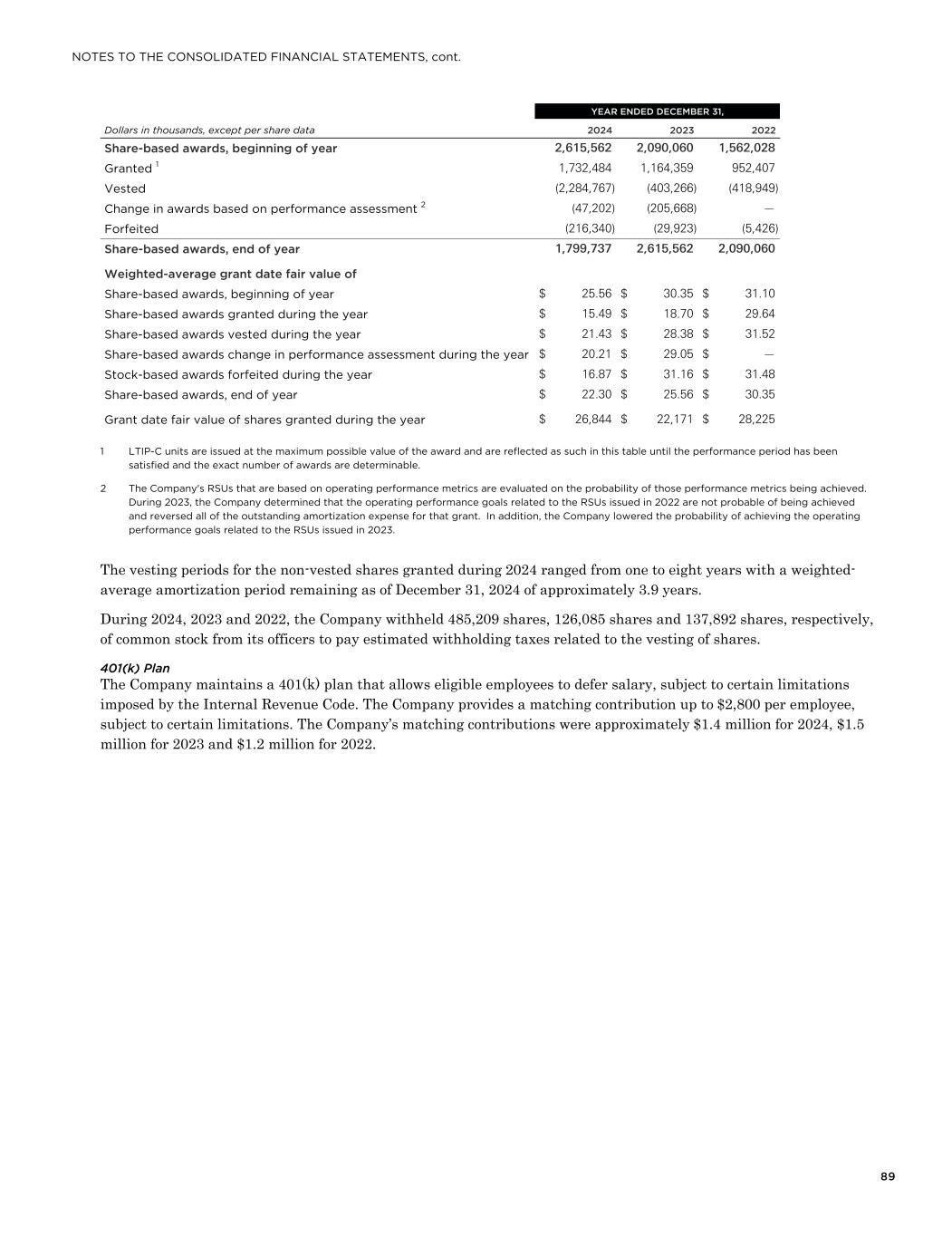工资递延计划该公司的工资递延计划允许其某些高级管理人员选择以受长期归属约束的非既得股份的形式递延至多50%的基本工资。股份数量将通过公司匹配增加,具体取决于高级职员选择的归属期长度。军官归属期选择为:30%匹配三年;50%匹配五年;100%匹配八年。在2024年、2023年和2022年期间,公司通过薪酬递延计划分别向高级职员发行了29,902股、31,792股和17,381股。2024年度、2023年度和2022年度,因向高级职员摊销非既得股份授予而产生的补偿费用分别约为110万美元、90万美元和90万美元。非雇员董事激励计划公司根据激励计划向其非雇员董事授予非既得股份奖励。董事的奖励通常有一年的归属期,在董事服务终止时可在该日期之前被没收,公司无需支付任何费用。在2024年、2023年和2022年的每一年,由向董事摊销的非既得股份授予产生的补偿费用分别约为240万美元、210万美元和150万美元。•在2024年第二季度,公司向某些独立董事授予了非归属股票奖励,授予日公允价值为0.9百万美元,其中包括总计58,910股非归属股票,归属期为一年。•在2024年第二季度,公司还向某些独立董事授予了OP中的LTIP-D单位,授予公允价值为0.8百万美元,其中包括总计45,982个非归属单位,归属期为一年。其他授予公司向高级管理层的其他成员授予了总计51,884股非归属股票,授予日公允价值总计为90万美元,归属期为三年。2024年,公司向临时首席执行官授予了69,022股非归属股票,授予日公允价值为120万美元,归属于任命永久首席执行官或一年中较早者。公司于2016年发行了与执行管理层过渡相关的一次性非归属股份授予。对于2024年、2023年和2022年,这些非既得股份授予高级管理人员的摊销产生的补偿费用约为220万美元、80万美元和80万美元。该公司加速摊销这些未偿还的奖励,包括与其首席执行官和首席财务官无故终止有关的奖励,总额为160万美元。下表为截至2024年12月31日、2023年和2022年12月31日止年度激励计划下的非既得股份奖励(包括限制性股票、RSU、LTIP-C单位和LTIP-D单位)及相关信息摘要:合并财务报表附注,续。88