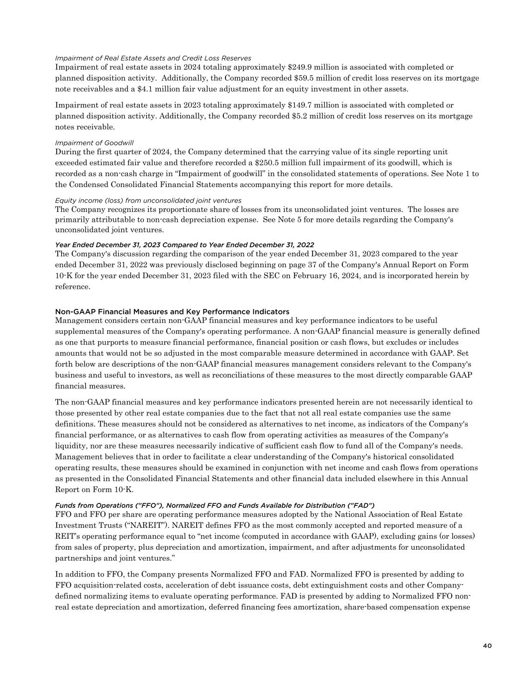 房地产资产减值和信贷损失准备金2024年房地产资产减值总额约为2.499亿美元,与已完成或计划的处置活动有关。此外,该公司在其应收抵押票据上记录了5950万美元的信用损失准备金,并为其他资产的股权投资进行了410万美元的公允价值调整。2023年房地产资产减值总额约为1.497亿美元,与已完成或计划的处置活动有关。此外,该公司在其应收抵押票据上记录了520万美元的信用损失准备金。商誉减值在2024年第一季度,公司确定其单一报告单位的账面价值超过了估计的公允价值,因此记录了2.505亿美元的商誉全额减值,在综合经营报表的“商誉减值”中作为非现金费用入账。有关更多详情,请参阅本报告随附的简明综合财务报表附注1。来自未合并合营企业的股权收益(亏损)本公司确认其按比例分担的来自其未合并合营企业的亏损。亏损主要归因于非现金折旧费用。有关公司未合并合营企业的更多详情,请参阅附注5。截至2023年12月31日止年度与截至2022年12月31日止年度比较公司有关截至2023年12月31日止年度与截至2022年12月31日止年度比较的讨论先前已于公司于2024年2月16日向SEC提交的截至2023年12月31日止年度的10-K表格年度报告第37页开始披露,并以引用方式并入本文。非GAAP财务指标和关键绩效指标管理层认为某些非GAAP财务指标和关键绩效指标是公司经营业绩的有用补充指标。非GAAP财务指标通常被定义为旨在衡量财务业绩、财务状况或现金流量,但不包括或包括根据GAAP确定的最具可比性的衡量标准中不会如此调整的金额。下文列出了管理层认为与公司业务相关且对投资者有用的非GAAP财务指标的描述,以及这些指标与最直接可比的GAAP财务指标的对账。由于并非所有房地产公司都使用相同的定义,本文介绍的非GAAP财务指标和关键业绩指标不一定与其他房地产公司介绍的相同。这些衡量指标不应被视为净收入的替代方案,不应被视为公司财务业绩的指标,也不应被视为经营活动现金流的替代方案,作为公司流动性的衡量指标,这些衡量指标也不一定表明有足够的现金流为公司的所有需求提供资金。管理层认为,为了便于清楚了解公司的历史综合经营业绩,这些衡量标准应与合并财务报表中列报的净收入和经营活动现金流量以及本年度报告10-K表其他部分中包含的其他财务数据一起审查。运营资金(“FFO”)、标准化FFO和可供分配资金(“FAD”)FFO和每股FFO是美国全国房地产投资信托协会(“NAREIT”)采用的经营业绩衡量标准。NAREIT将FFO定义为最普遍接受和报告的衡量REIT经营业绩的指标,等于“净收入(按照公认会计原则计算),不包括出售财产的收益(或损失),加上折旧和摊销、减值,以及对未合并的合伙企业和合资企业进行调整后”。除FFO外,公司呈现常态化FFO和FAD。标准化FFO是通过将FFO收购相关成本、债务发行加速成本、债务清偿成本和其他公司定义的标准化项目相加来呈现,以评估经营业绩。FAD通过加入常态化FFO非房地产折旧摊销、递延融资费用摊销、股权激励费用40