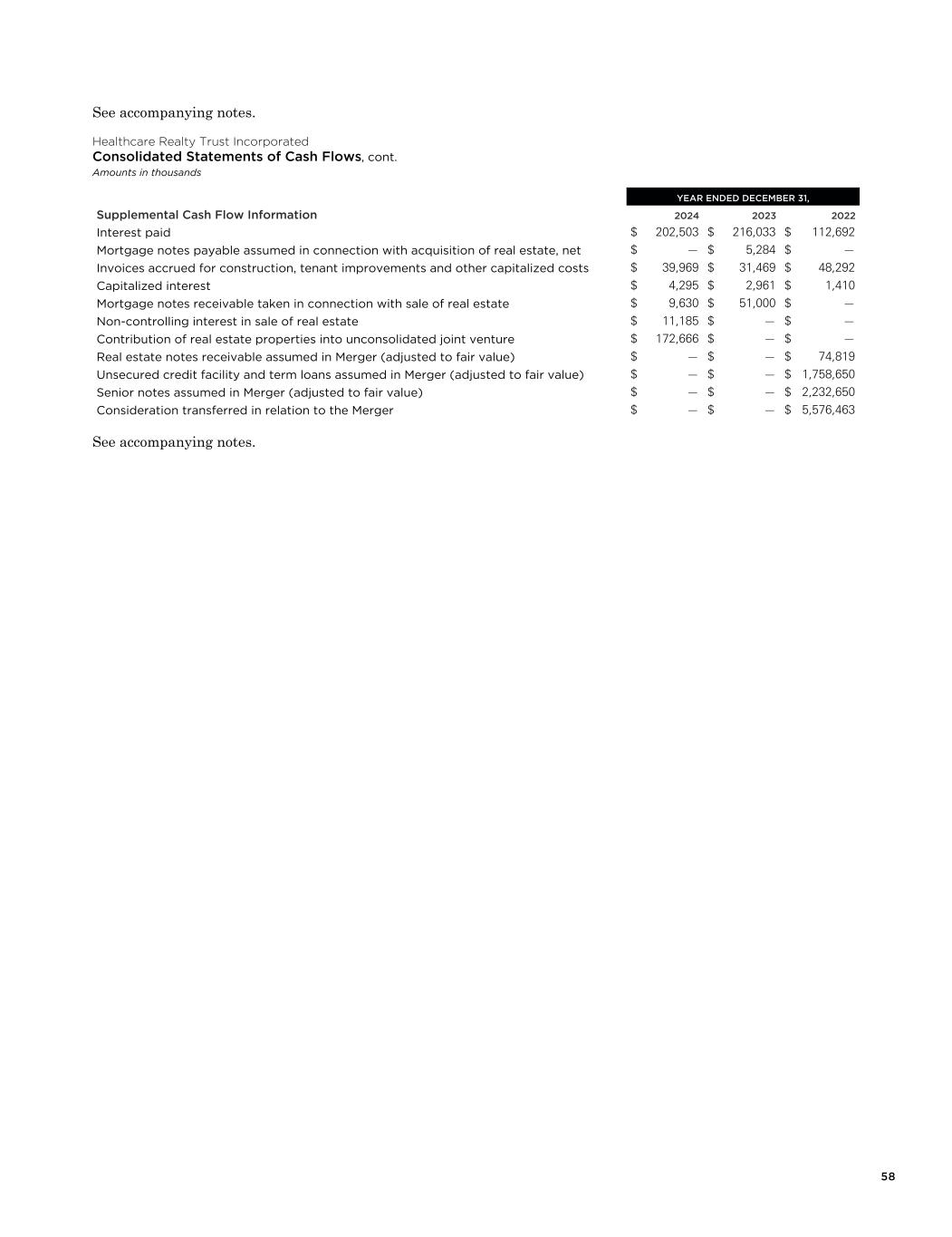 见附注。Healthcare Realty Trust Incorporated合并现金流量表(续)以千年为单位的金额截至12月31日,补充现金流信息202420232022已付利息202,503美元216,033美元112,692美元与购置房地产有关的假定应付抵押票据,净额—— 5,284美元——建筑应计发票,租户改善和其他资本化成本39,969美元31,469美元48,292美元资本化利息4,295美元2,961美元1,410美元与出售房地产有关的应收抵押票据9,630美元51,000美元——出售房地产的非控股权益11,185美元——向未合并的合资企业提供房地产资产172,666美元——合并中承担的应收房地产票据(按公允价值调整)—— 74,819美元无担保信贷额度合并中承担的定期贷款(调整为公允价值)$ — $ — 1,758,650美元合并中承担的优先票据(调整为公允价值)$ — $ — 2,232,650美元与合并相关的转让对价$ — $ — 5,576,463见附注。58