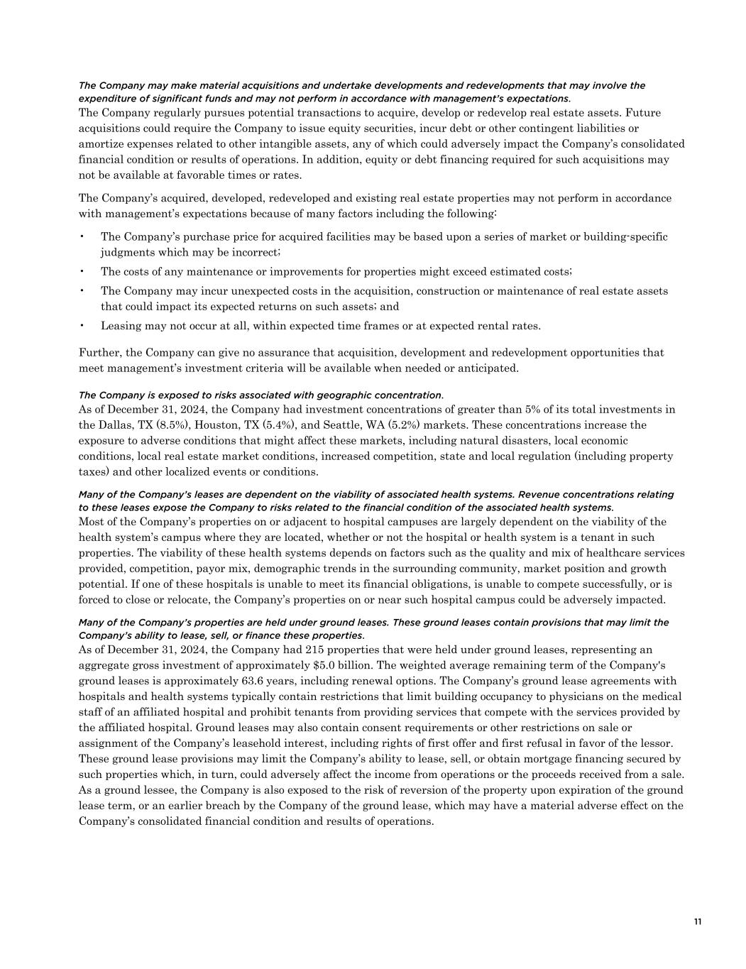 公司可能会进行重大收购,并进行可能涉及大量资金支出且业绩可能不符合管理层预期的开发和再开发。公司定期寻求潜在交易以收购、开发或再开发房地产资产。未来的收购可能要求公司发行股本证券、产生债务或其他或有负债或摊销与其他无形资产相关的费用,其中任何一项都可能对公司的综合财务状况或经营业绩产生不利影响。此外,此类收购所需的股权或债务融资可能无法以优惠的时间或利率获得。公司收购、开发、再开发及现有房地产物业的表现可能不符合管理层的预期,原因包括以下诸多因素:•公司对收购设施的购买价格可能基于一系列可能不正确的市场或建筑物特定判断;•物业的任何维护或改进的成本可能超过估计成本;•公司在收购、建造或维护房地产资产方面可能会产生可能影响其对此类资产的预期回报的意外成本;•租赁可能根本不会发生,在预期的时间范围内或按预期的租金价格。此外,公司无法保证满足管理层投资标准的收购、开发和再开发机会将在需要或预期时提供。公司面临与地域集中相关的风险。截至2024年12月31日,该公司在德克萨斯州达拉斯(8.5%)、德克萨斯州休斯顿(5.4%)和华盛顿州西雅图(5.2%)市场的投资集中度超过其总投资的5%。这些集中增加了可能影响这些市场的不利条件的风险敞口,包括自然灾害、当地经济状况、当地房地产市场状况、竞争加剧、州和地方监管(包括财产税)以及其他局部事件或条件。该公司的许多租约都取决于相关卫生系统的可行性。与这些租赁相关的收入集中使公司面临与相关卫生系统的财务状况相关的风险。公司位于或毗邻医院校园的大部分物业在很大程度上取决于其所在的卫生系统校园的可行性,无论医院或卫生系统是否是此类物业的租户。这些卫生系统的可行性取决于所提供的医疗保健服务的质量和组合、竞争、付款人组合、周边社区的人口趋势、市场地位和增长潜力等因素。如果其中一家医院无法履行其财务义务、无法成功竞争或被迫关闭或搬迁,公司在该医院园区内或附近的物业可能会受到不利影响。该公司的许多物业是根据地面租赁持有的。这些地面租赁包含可能限制公司租赁、出售或融资这些物业的能力的条款。截至2024年12月31日,该公司拥有215处根据地面租赁持有的物业,总投资约为50亿美元。公司地面租赁的加权平均剩余期限约为63.6年,包括续期选择权。该公司与医院和卫生系统的地面租赁协议通常包含限制,将附属医院医务人员的建筑物占用限制为医生,并禁止租户提供与附属医院提供的服务相竞争的服务。地面租赁还可能包含同意要求或对出售或转让公司租赁权益的其他限制,包括有利于出租人的优先要约权和优先购买权。这些地面租赁条款可能会限制公司租赁、出售或获得由此类物业担保的抵押融资的能力,这反过来可能会对运营收入或出售所得收益产生不利影响。作为地租承租人,公司亦面临地租期限届满时物业被收回的风险,或公司较早违反地租,可能对公司的综合财务状况及经营业绩造成重大不利影响。11
