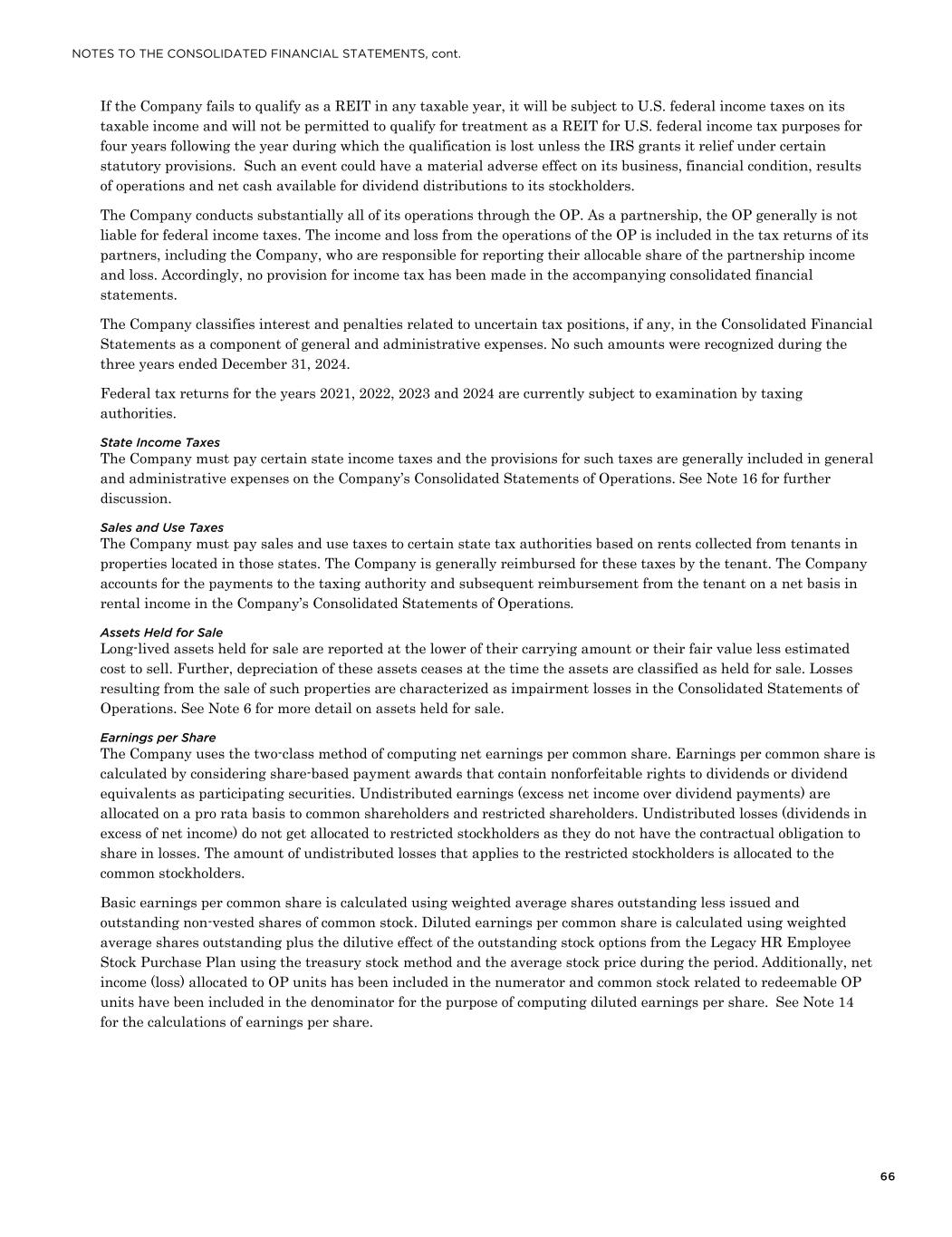 如果公司未能在任何纳税年度获得REIT资格,它将就其应税收入缴纳美国联邦所得税,并且在资格丧失的年度之后的四年内将不被允许有资格作为REIT用于美国联邦所得税目的,除非美国国税局根据某些法定条款授予其减免。此类事件可能对其业务、财务状况、经营业绩和可用于向股东分配股息的净现金产生重大不利影响。该公司基本上通过OP开展所有业务。作为合伙企业,OP一般不承担联邦所得税。来自OP运营的收入和损失包含在其合伙人的纳税申报表中,包括公司,这些合伙人负责报告其在合伙企业收入和损失中的可分配份额。因此,在随附的综合财务报表中并无计提所得税拨备。公司在综合财务报表中将与不确定的税务状况(如果有的话)相关的利息和罚款分类为一般和管理费用的组成部分。截至2024年12月31日止三年期间,未确认此类金额。2021年、2022年、2023年和2024年的联邦纳税申报表目前需要接受税务机关的审查。州所得税公司必须缴纳一定的州所得税,此类税款的准备金一般包含在公司综合经营报表的一般和管理费用中。进一步讨论见附注16。销售和使用税公司必须根据向位于这些州的物业的租户收取的租金向某些州税务机关缴纳销售和使用税。公司一般由租户偿还这些税款。公司在公司的综合运营报表中将支付给税务机关的款项和租户随后的补偿按净额计入租金收入。持有待售资产持有待售的长期资产按其账面值或公允价值减去估计出售成本后的较低者列报。此外,这些资产的折旧在资产分类为持有待售时停止。出售这类物业产生的损失在综合经营报表中被定性为减值损失。关于持有待售资产的更多详情,请参见附注6。每股收益公司采用两类法计算每股普通股净收益。每股普通股收益的计算方法是考虑以股份为基础的支付奖励,其中包含不可没收的股息或股息等价物权利作为参与证券。未分配收益(超过股息支付的超额净收入)按比例分配给普通股股东和限制性股东。未分配亏损(超过净收益的股息)不分配给限制性股东,因为他们没有分担亏损的合同义务。适用于受限制股东的未分配亏损金额分配给普通股股东。每股普通股基本收益的计算方法是加权平均已发行股份减去已发行和已发行的非归属普通股股份。稀释后的每股普通股收益是使用加权平均流通股加上使用库存股法的Legacy HR员工股票购买计划的未行使股票期权的稀释效应和期间的平均股价计算得出的。此外,分配给OP单位的净收入(亏损)已计入分子,与可赎回OP单位相关的普通股已计入分母,以计算稀释每股收益。每股收益的计算见附注14。合并财务报表附注,续。66