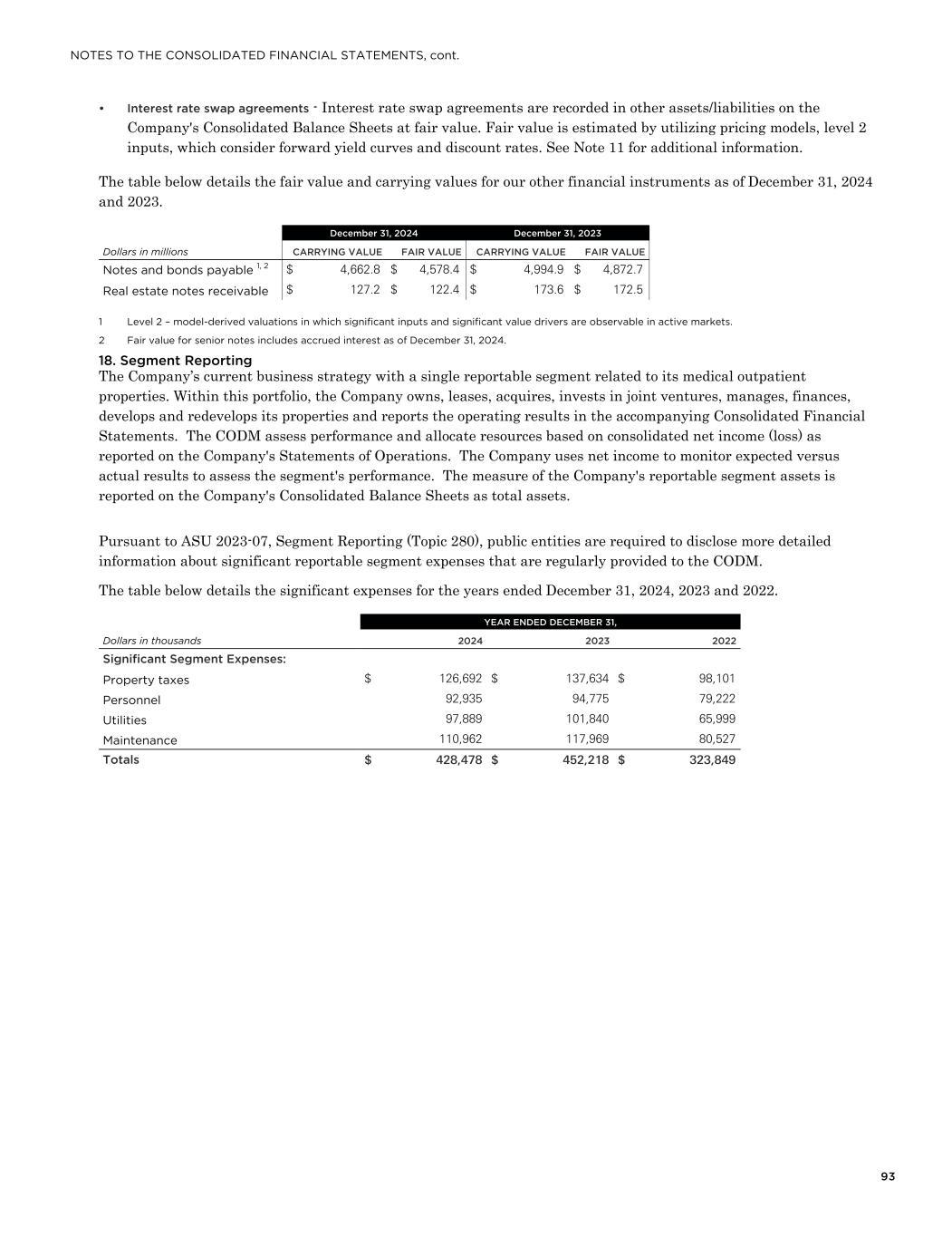 •利率互换协议-利率互换协议按公允价值记入公司合并资产负债表的其他资产/负债。公允价值是利用定价模型估算的,2级输入,其中考虑了远期收益率曲线和贴现率。更多信息见附注11。下表详细列出了截至2024年12月31日和2023年12月31日我们其他金融工具的公允价值和账面价值。2024年12月31日2023年12月31日百万美元账面价值公允价值账面价值公允价值应付票据和债券1,2 $ 4,66 2.8 $ 4,578.4 $ 4,994.9 $ 4,872.7房地产应收票据$ 127.2 $ 122.4 $ 173.6 $ 17 2.51 Level 2 –模型得出的估值,其中在活跃市场中可以观察到重要的投入和重要的价值驱动因素。2优先票据的公允价值包括截至2024年12月31日的应计利息。18.分部报告公司目前的业务战略与单一可报告分部相关的医疗门诊物业。在这个投资组合中,公司拥有、租赁、收购、投资于合资企业、管理、融资、开发和再开发其物业,并在随附的综合财务报表中报告经营业绩。主要经营决策者根据公司经营报表中报告的综合净收入(亏损)评估业绩并分配资源。该公司使用净收入来监测预期与实际结果,以评估该部门的业绩。公司报告分部资产的计量在公司合并资产负债表中以总资产列报。根据ASU2023-07,分部报告(主题280),公共实体必须披露有关定期向主要经营决策者提供的重大可报告分部费用的更详细信息。下表详细列出截至2024年12月31日、2023年和2022年12月31日止年度的重大开支。截至12月31日止年度,单位:千美元202420232022重要分部费用:财产税126,692美元137,634美元98,101美元人员92,93594,77579,222公用事业97,889 101,84065,999维修110,962117,96980,527总计428,478美元452,218美元323,849美元合并财务报表附注,续。93