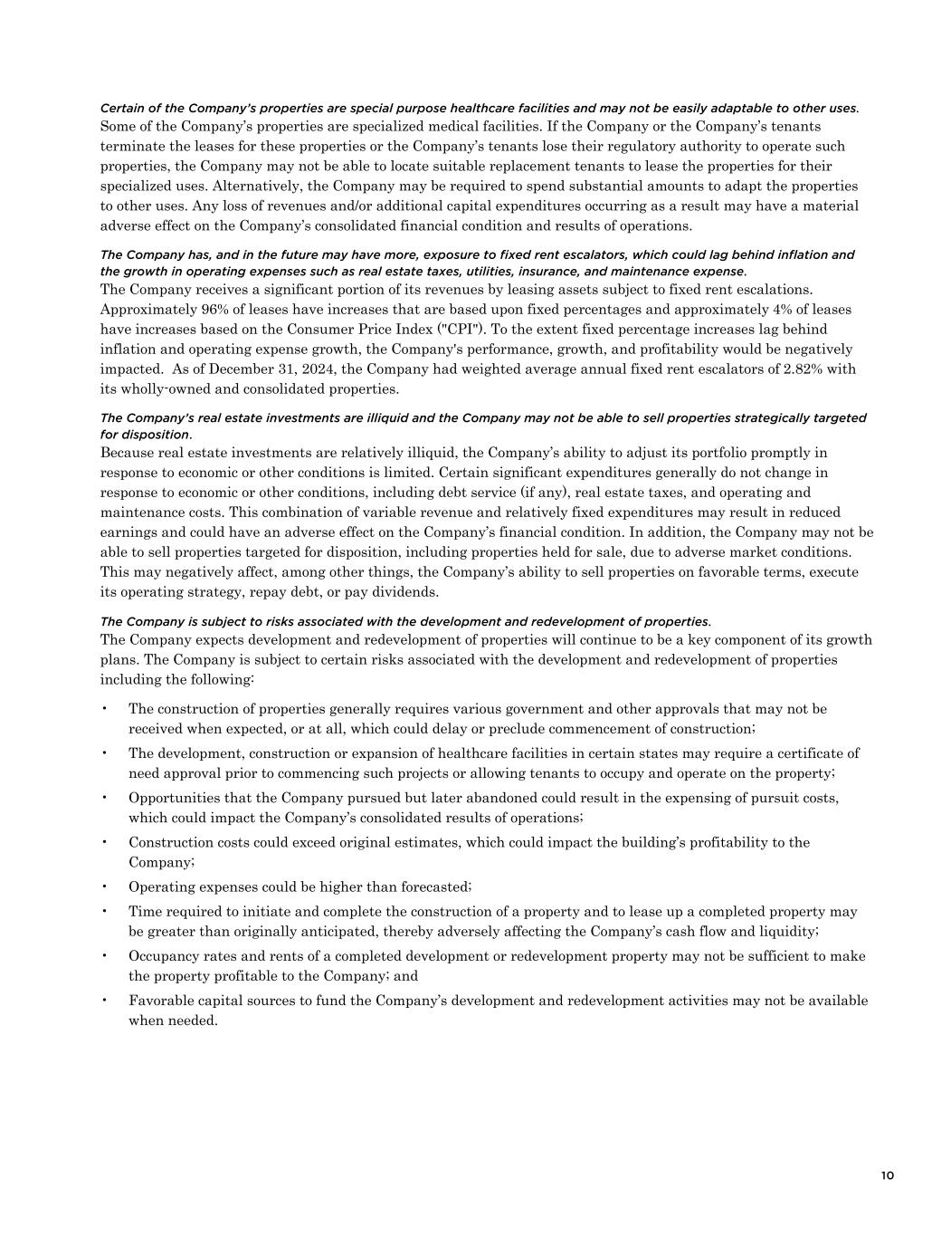 公司的某些物业是特殊用途的医疗设施,可能不容易适应其他用途。该公司的一些物业是专门的医疗设施。若公司或公司租户终止该等物业的租约,或公司租户失去经营该等物业的监管权限,公司可能无法找到合适的替代租户租赁该等物业用于其专门用途。或者,公司可能需要花费大量资金,以使物业适应其他用途。因此发生的任何收入损失和/或额外资本支出可能对公司的综合财务状况和经营业绩产生重大不利影响。该公司有,而且未来可能会有更多,固定租金自动扶梯的风险敞口,这可能会滞后于通货膨胀和房地产税、公用事业、保险和维护费用等运营费用的增长。该公司通过租赁受固定租金上涨影响的资产获得了很大一部分收入。大约96%的租约的涨幅是基于固定百分比,大约4%的租约的涨幅是基于消费者价格指数(“CPI”)。如果固定百分比增长滞后于通胀和运营费用增长,公司的业绩、增长和盈利能力将受到负面影响。截至2024年12月31日,公司以全资及合并物业加权平均年租金为2.82%的自动扶梯。公司的房地产投资缺乏流动性,公司可能无法出售具有战略针对性的处置物业。由于房地产投资相对缺乏流动性,公司根据经济或其他情况及时调整投资组合的能力有限。某些重大支出通常不会因应经济或其他条件而改变,包括还本付息(如果有的话)、房地产税以及运营和维护成本。这种可变收入和相对固定支出的组合可能会导致收益减少,并可能对公司的财务状况产生不利影响。此外,由于不利的市场条件,公司可能无法出售目标为处置的物业,包括持有待售物业。这可能会对(其中包括)公司以优惠条件出售物业、执行经营战略、偿还债务或支付股息的能力产生负面影响。公司面临与物业开发及再开发相关的风险。该公司预计,开发和再开发物业将继续成为其增长计划的关键组成部分。公司面对与发展及重建物业有关的若干风险,包括以下风险:•建设物业一般需要政府及其他各种批准,而这些批准可能无法在预期时收到,或根本无法收到,这可能会延迟或阻止开工;•发展,在某些州建造或扩建医疗设施可能需要在开始此类项目或允许租户占用并经营该物业之前获得需求批准证明;•公司追求但后来放弃的机会可能会导致追求成本的支出,这可能会影响公司的综合经营业绩;•建设成本可能会超过最初的估计,这可能会影响该建筑物对公司的盈利能力;•运营费用可能高于预测;•启动和完成物业建设以及出租已完工物业所需的时间可能比最初预期的要长,从而对公司的现金流和流动性产生不利影响;•已完成开发或再开发物业的出租率和租金可能不足以使该物业对公司产生盈利;•在需要时可能无法获得为公司的开发和再开发活动提供资金的有利资金来源。10