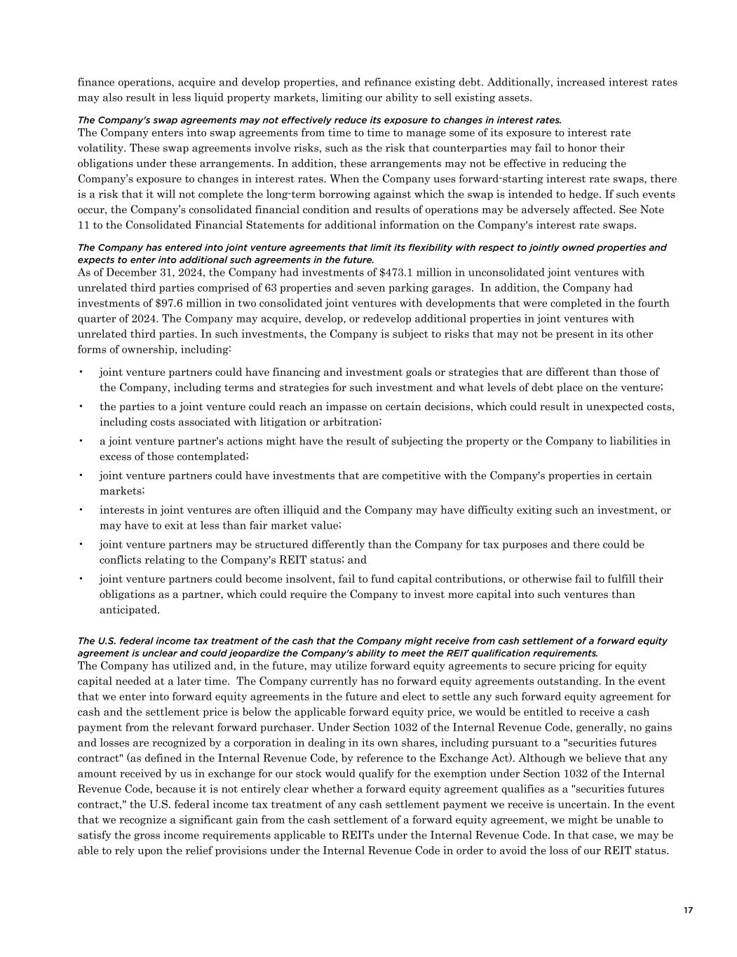 融资运营、收购和开发物业、现有债务再融资。此外,利率上升也可能导致房地产市场流动性降低,限制了我们出售现有资产的能力。公司的互换协议可能无法有效降低其对利率变化的风险敞口。公司不时订立掉期协议,以管理部分利率波动风险。这些互换协议涉及风险,例如交易对手可能无法履行其在这些安排下的义务的风险。此外,这些安排可能无法有效降低公司对利率变化的风险敞口。公司在使用远期起始式利率互换时,存在无法完成互换拟对冲的长期借款的风险。如果发生此类事件,公司的综合财务状况和经营业绩可能会受到不利影响。有关公司利率掉期的更多信息,请参见综合财务报表附注11。公司已订立合营协议,限制其在共同拥有物业方面的灵活性,并预期未来将订立更多该等协议。截至2024年12月31日,该公司在与非关联第三方的未合并合资企业中的投资为4.731亿美元,包括63处房产和7个停车库。此外,该公司还对两家合并后的合资企业进行了9760万美元的投资,其开发项目已于2024年第四季度完成。公司可能会在与非关联第三方的合资公司中收购、开发或再开发额外的物业。在此类投资中,公司面临其他形式所有权可能不存在的风险,包括:•合资伙伴的融资和投资目标或战略可能与公司不同,包括此类投资的条款和战略以及对企业的债务水平;•合资各方可能会在某些决定上陷入僵局,这可能会导致意想不到的成本,包括与诉讼或仲裁相关的费用;•合资伙伴的行动可能会导致使财产或公司承担超出预期的负债;•合资伙伴可能拥有在某些市场上与公司财产具有竞争力的投资;•合资企业的权益通常缺乏流动性,公司可能难以退出此类投资,或可能不得不以低于公允市场价值的价格退出;•出于税收目的,合资伙伴的结构可能与公司不同,并且可能存在与公司REIT地位相关的冲突;•合资伙伴可能破产、未能出资或以其他方式未能履行其作为合伙人的义务,这可能要求公司向此类企业投入比预期更多的资金。美国联邦所得税对公司可能从远期股权协议的现金结算中获得的现金的处理不明确,可能危及公司满足REIT资格要求的能力。公司已利用并在未来可能利用远期股权协议来确保以后所需股权资本的定价。公司目前没有未完成的远期股权协议。如果我们在未来订立远期股权协议并选择以现金结算任何此类远期股权协议且结算价格低于适用的远期股权价格,我们将有权从相关远期买方收取现金付款。根据《国内税收法》第1032条,一般来说,公司在交易自己的股票时不承认任何收益和损失,包括根据“证券期货合约”(如《国内税收法》中的定义,参照《交易法》)。尽管我们认为,我们为换取我们的股票而收到的任何金额都符合《国内税收法》第1032条规定的豁免条件,但由于不完全清楚远期股权协议是否符合“证券期货合约”的条件,我们收到的任何现金结算付款的美国联邦所得税处理方式是不确定的。如果我们确认从远期股权协议的现金结算中获得重大收益,我们可能无法满足《国内税收法》下适用于REITs的总收入要求。在这种情况下,我们或许可以依赖《国内税收法》下的救济条款,以避免失去我们的REIT地位。17