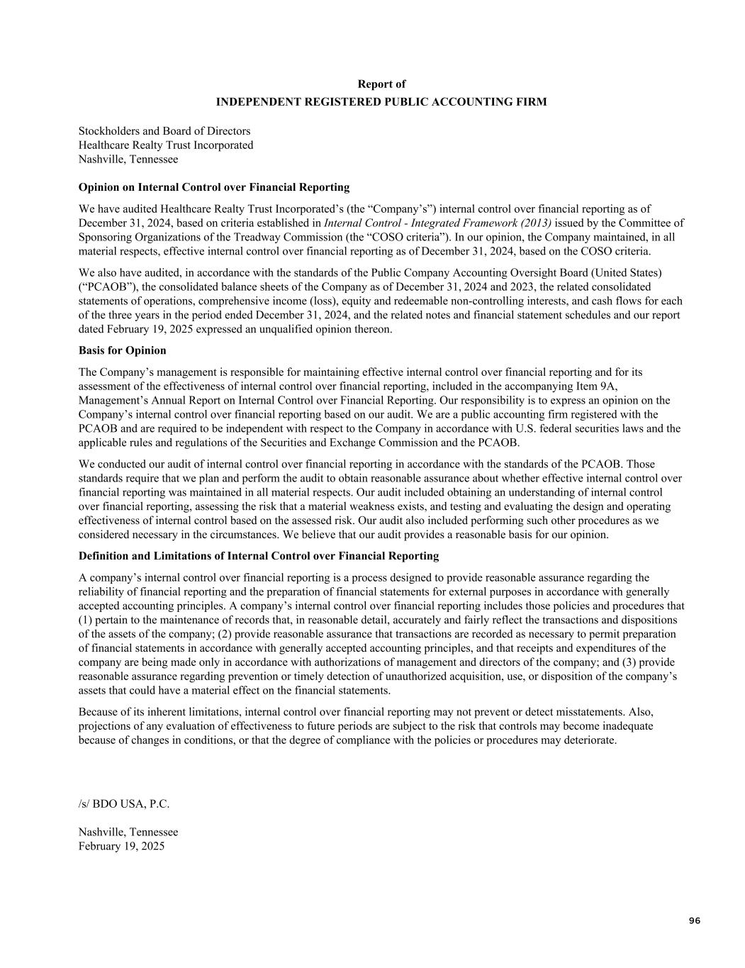 独立注册公共会计公司股东和董事会的报告Healthcare Realty Trust Incorporated田纳西州纳什维尔关于财务报告内部控制的意见我们根据Treadway委员会发起组织委员会发布的内部控制-综合框架(2013)中确立的标准(“COSO标准”),审计了截至2024年12月31日Healthcare Realty Trust Incorporated(“公司”)的财务报告内部控制。我们认为,截至2024年12月31日,公司在所有重大方面根据COSO标准保持了有效的财务报告内部控制。我们亦按照美国公众公司会计监督委员会(“PCAOB”)的标准,审计了公司截至2024年12月31日及2023年12月31日的合并资产负债表、截至2024年12月31日止三个年度的相关合并经营报表、综合收益(亏损)、权益及可赎回非控股权益、现金流量,以及相关附注和财务报表附表以及我们日期为2025年2月19日的报告对此发表了无保留意见。意见依据公司管理层负责维持有效的财务报告内部控制,并负责评估财务报告内部控制的有效性,包括在随附的项目9a,管理层关于财务报告内部控制的年度报告中。我们的责任是在我们审计的基础上,对公司财务报告内部控制发表意见。我们是一家在PCAOB注册的公共会计师事务所,根据美国联邦证券法以及美国证券交易委员会和PCAOB的适用规则和条例,我们被要求对公司具有独立性。我们按照PCAOB的标准对财务报告内部控制进行了审计。这些准则要求我们计划和执行审计,以就是否在所有重大方面保持了有效的财务报告内部控制获得合理保证。我们的审计包括了解财务报告内部控制,评估存在重大缺陷的风险,并根据评估的风险测试和评估内部控制的设计和运行有效性。我们的审计还包括执行我们认为在当时情况下必要的其他程序。我们认为,我们的审计为我们的意见提供了合理的依据。财务报告内部控制的定义和限制公司的财务报告内部控制是一个旨在根据公认会计原则为财务报告的可靠性和为外部目的编制财务报表提供合理保证的过程。公司对财务报告的内部控制包括:(1)与保持记录有关的政策和程序,这些记录以合理的细节准确和公平地反映公司资产的交易和处置;(2)提供合理保证,交易记录是必要的,以允许按照公认会计原则编制财务报表,并且公司的收支只是根据公司管理层和董事的授权进行的;以及(3)就防止或及时发现未经授权的获取、使用、或处置可能对财务报表产生重大影响的公司资产。财务报告内部控制由于其固有的局限性,可能无法防止或发现错报。此外,对未来期间的任何有效性评估的预测都受到以下风险的影响:由于条件的变化,控制可能变得不充分,或者政策或程序的遵守程度可能恶化。/s/BDO USA,P.C.田纳西州纳什维尔2025年2月19日96