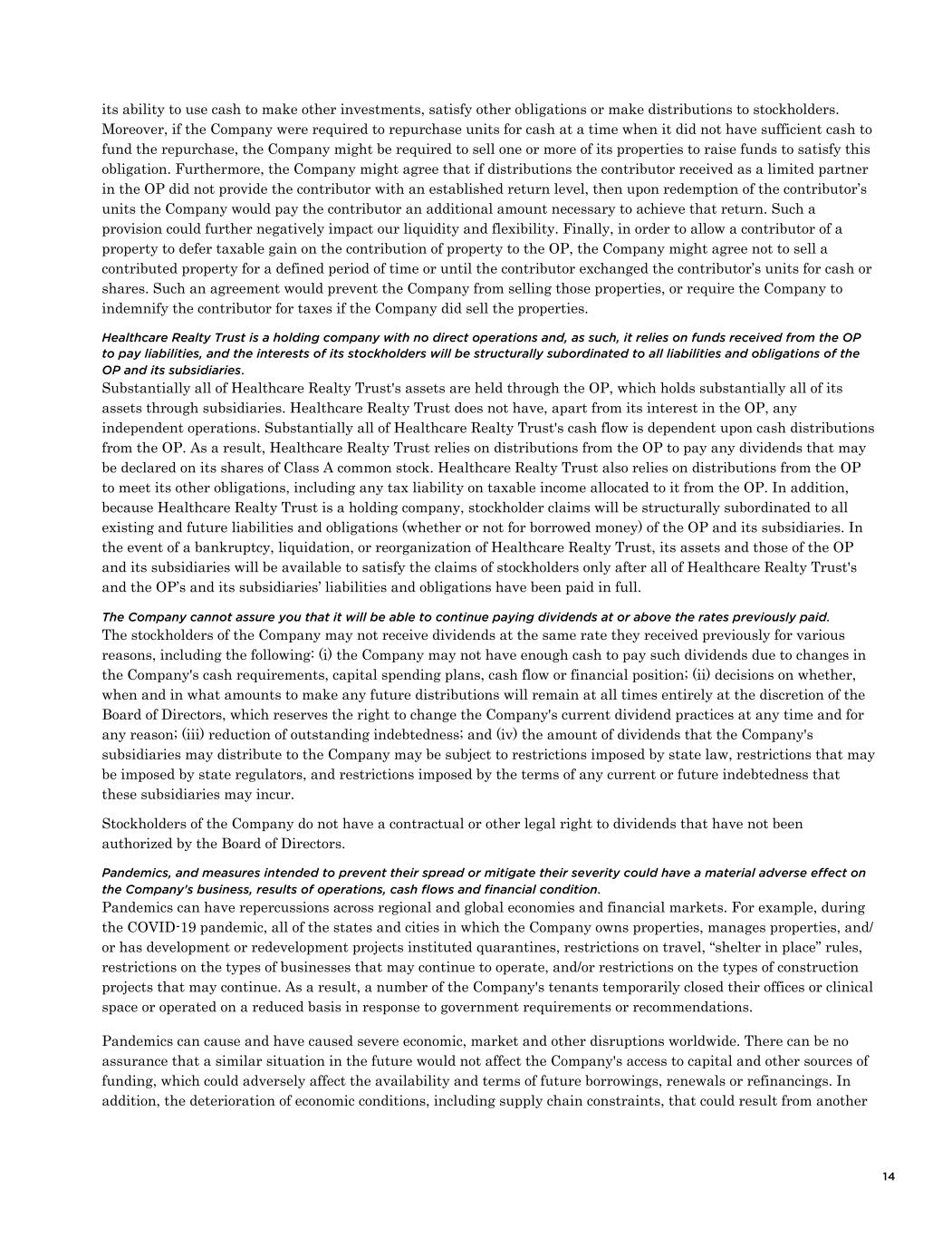 其使用现金进行其他投资、履行其他义务或向股东进行分配的能力。此外,如果公司在没有足够现金为回购提供资金的时候被要求以现金回购单位,公司可能会被要求出售其一处或多处物业以筹集资金来履行这一义务。此外,公司可能同意,如果出资人作为OP中的有限合伙人收到的分配没有为出资人提供既定的回报水平,那么在赎回出资人的单位时,公司将向出资人支付实现该回报所需的额外金额。这样的规定可能会进一步对我们的流动性和灵活性产生负面影响。最后,为了允许财产的贡献者将财产贡献的应税收益递延给OP,公司可能同意在规定的一段时间内或直到贡献者将贡献者的单位交换为现金或股份之前不出售贡献的财产。这样的协议将阻止公司出售这些财产,或者如果公司确实出售了这些财产,则要求公司赔偿供款人的税款。医疗保健房地产信托是一家没有直接经营的控股公司,因此,它依赖从OP收到的资金来支付负债,其股东的利益将在结构上从属于OP及其子公司的所有负债和义务。医疗保健房地产信托的几乎所有资产都是通过OP持有,OP通过子公司持有其几乎所有资产。医疗保健房地产信托除了在OP中拥有权益外,没有任何独立运营。医疗保健房地产信托的几乎所有现金流都依赖于来自OP的现金分配。因此,医疗保健房地产信托依赖于OP的分配来支付可能就其A类普通股股份宣布的任何股息。医疗保健房地产信托还依赖于OP的分配来履行其其他义务,包括对从OP分配给它的应税收入的任何纳税义务。此外,由于医疗保健房地产信托是一家控股公司,股东的债权将在结构上从属于OP及其子公司的所有现有和未来的负债和义务(无论是否为所借资金)。而在医疗保健房地产信托发生破产、清算、重整等情况时,其资产以及欧浦尔及其子公司的资产,只有在足额偿付医疗保健房地产信托及欧浦尔及其子公司的负债和义务后,才能用于满足股东的债权。公司无法向您保证,它将能够继续以或高于先前支付的利率支付股息。由于各种原因,公司股东可能无法按照之前获得的相同比率获得股息,包括:(i)由于公司的现金需求、资本支出计划、现金流或财务状况的变化,公司可能没有足够的现金来支付此类股息;(ii)是否、何时以及以何种金额进行任何未来分配的决定将始终完全由董事会酌情决定,其保留随时以任何理由改变公司现行股息做法的权利;(iii)减少未偿债务;及(iv)公司附属公司可能向公司分配的股息金额可能受州法律施加的限制、州监管机构可能施加的限制,以及这些附属公司可能产生的任何当前或未来债务的条款施加的限制。公司股东不享有未经董事会授权的合同或其他合法分红权利。大流行,以及旨在防止其传播或减轻其严重性的措施可能会对公司的业务、经营业绩、现金流和财务状况产生重大不利影响。大流行可能对区域和全球经济以及金融市场产生影响。例如,在新冠疫情期间,公司拥有物业、管理物业和/或有开发或再开发项目的所有州和城市都实施了隔离、旅行限制、“就地避难”规则、对可能继续经营的业务类型的限制和/或对可能继续进行的建设项目类型的限制。因此,公司的一些租户根据政府的要求或建议暂时关闭了他们的办公室或临床空间或减少了运营。大流行可能导致并已经造成严重的经济, 全球范围内的市场和其他干扰。无法保证未来的类似情况不会影响公司获得资本和其他资金来源,从而可能对未来借款、展期或再融资的可用性和条款产生不利影响。此外,经济状况的恶化,包括供应链限制,可能会导致另外14