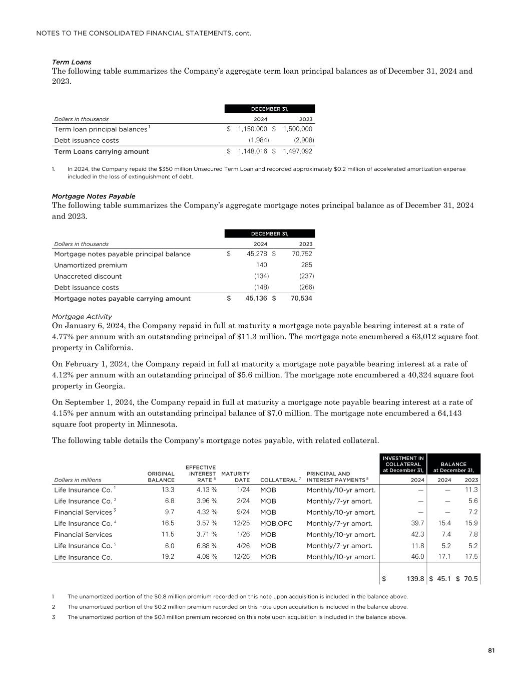 定期贷款下表汇总了公司截至2024年12月31日和2023年12月31日的总定期贷款本金余额。12月31日,单位:千美元20242023定期贷款本金余额1美元1,150,000美元1,500,000美元发债成本(1,984)(2,908)定期贷款账面金额1,148,016美元1,497,0921美元。2024年,公司偿还了3.5亿美元的无抵押定期贷款,并记录了约20万美元的加速摊销费用,包括在债务清偿损失中。应付抵押票据下表汇总了公司截至2024年12月31日和2023年12月31日的总抵押票据本金余额。12月31日,单位:千美元20242023应付抵押票据本金余额45,278美元70,752美元未摊销溢价140285未增值折价(134)(237)发债成本(148)(266)应付抵押票据账面金额45,136美元70,534美元抵押活动2024年1月6日,公司在到期时全额偿还了一笔按年利率4.77%计息的应付抵押票据,未偿本金为1,130万美元。抵押票据抵押了加州一处63012平方英尺的房产。2024年2月1日,公司在到期时全额偿还了一笔按年利率4.12%计息的应付抵押票据,未偿本金为560万美元。抵押票据抵押了佐治亚州一处40,324平方英尺的房产。于2024年9月1日,公司于到期时全额偿还了一笔按年利率4.15%计息、未偿还本金余额为700万美元的应付抵押票据。抵押票据抵押了明尼苏达州一处64,143平方英尺的房产。下表详细列出了公司的应付抵押票据,并附有相关抵押品。原始余额有效利率6到期日抵押7本金及利息支付8投资于12月31日抵押,12月31日余额,百万美元202420242023人寿保险有限公司113.3 4.13% 1/24 MOB月/10年期金额。—— 11.3人寿保险有限公司26.8 3.96% 2/24 MOB月/7年摊销。—— 5.6金融服务39.7 4.32% 9/24 MOB月度/10年金额。— — 7.2人寿保险股份有限公司416.5 3.57% 12/25 MOB,OFC按月/7年摊销。39.7 15.4 15.9金融服务11.5 3.71% 1/26 MOB月度/10年金额。42.37.47.8人寿保险有限公司56.06.88% 4/26 MOB月/7年金额。11.85.25.2人寿保险有限公司19.24.08% 12/26 MOB月度/10年摊销。46.01 7.11 7.5美元139.8美元45.1美元70.51本票据在购置时记录的0.8百万美元溢价的未摊销部分包括在上述余额中。2本票据在收购时记录的20万美元溢价的未摊销部分包含在上述余额中。3本票据在收购时记录的10万美元溢价的未摊销部分包含在上述余额中。合并财务报表附注,续。81