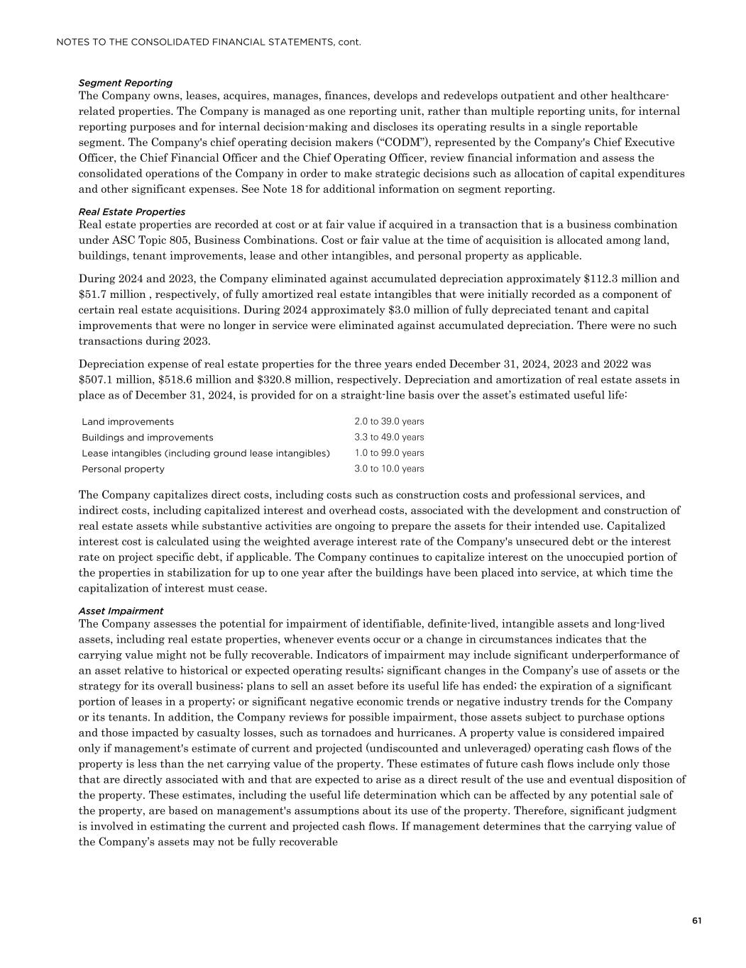 分部报告公司拥有、租赁、收购、管理、融资、开发和再开发门诊和其他与医疗保健相关的物业。公司作为一个报告单位而不是多个报告单位进行管理,用于内部报告目的和内部决策,并在单一可报告分部中披露其经营业绩。由公司首席执行官、首席财务官和首席运营官代表的公司首席运营决策者(“CODM”)审查财务信息并评估公司的综合经营情况,以便做出战略决策,例如分配资本支出和其他重大费用。有关分部报告的更多信息,见附注18。房地产物业根据ASC主题805,企业合并,如果在属于企业合并的交易中获得,则房地产物业按成本或公允价值入账。购置时的成本或公允价值在土地、建筑物、租户改善、租赁和其他无形资产以及适用的个人财产之间分配。在2024年和2023年期间,公司分别消除了最初作为某些房地产收购的组成部分入账的完全摊销的房地产无形资产的累计折旧约1.123亿美元和5170万美元。在2024年期间,已完全折旧的租户和不再使用的资本改进约300万美元从累计折旧中消除。2023年期间没有此类交易。截至2024年12月31日、2023年和2022年12月31日止三个年度的不动产折旧费用分别为5.071亿美元、5.186亿美元和3.208亿美元。截至2024年12月31日已到位的不动产资产的折旧和摊销,在资产的预计使用寿命内按直线法计提:土地改良2.0至39.0年建筑物和改良3.3至49.0年租赁无形资产(包括地租无形资产)1.0至99.0年个人财产3.0至10.0年公司将直接成本,包括建造成本和专业服务等成本,以及间接成本,包括资本化的利息和间接费用资本化,与房地产资产的开发和建设相关,同时正在进行实质性活动,以使资产为其预期用途做好准备。资本化利息成本采用公司无担保债务加权平均利率或项目特定债务利率(如适用)计算。公司在建筑物投入使用后,继续将稳定物业的未占用部分的利息资本化长达一年,届时利息的资本化必须停止。资产减值每当发生事件或情况变化表明账面价值可能无法完全收回时,公司会评估可识别、使用寿命有限、无形资产和长期资产(包括不动产)的减值可能性。减值指标可能包括一项资产相对于历史或预期经营业绩的显着表现不佳;公司对资产的使用或其整体业务的战略发生重大变化;计划在某项资产的使用寿命结束之前出售该资产;某项物业的很大一部分租约到期;或对公司或其租户而言重大的负面经济趋势或负面行业趋势。此外,公司还会审查可能的减值、受购买选择权约束的资产以及受龙卷风和飓风等伤亡损失影响的资产。只有当管理层对该物业当前和预计(未贴现和无杠杆)经营现金流的估计低于该物业的账面净值时,该物业价值才被视为减值。这些对未来现金流量的估计仅包括与财产的使用和最终处置直接相关和预计将产生的那些估计数。这些估计,包括可能受到任何潜在出售物业影响的使用寿命确定,是基于管理层对其使用物业的假设。因此,在估计当前和预计的现金流量时涉及重大判断。如果管理层确定公司资产的账面价值可能无法完全收回合并财务报表附注,续。61
