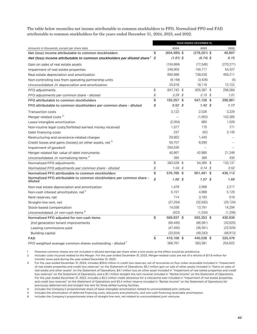 下表对截至2024年12月31日、2024年、2023年和2022年12月31日止年度归属于普通股股东的FFO、正常化FFO和FAD的净利润进行了核对。截至12月31日止年度,金额以千计,每股数据除外202420232022归属于普通股股东的净(亏损)收入$(654,485)$(278,261)$ 40,897归属于稀释后每股普通股股东的净(亏损)收入1 $(1.81)$(0.74)$ 0.15出售房地产资产收益(104,684)(77,546)(270,271)房地产资产减值249,909149,71754,427房地产折旧和摊销690,988738,526459,211来自经营合伙单位的非控制性亏损(9,149)(3,426)(5)未合并的合资企业折旧和摊销20,67818,11612,722 FFO调整847,742美元825,387美元256,084美元每股普通股FFO调整-稀释后2.29美元2.15美元1.01美元归属于普通股股东的FFO 193,257美元547,126美元296,981美元归属于普通股股东的FFO-稀释后0.52美元1.43美元1.17美元—交易成本3,1222,0263,229合并相关成本2 —(1,952)103,380租赁无形摊销(2,054)8601,028非日常法律费用/收到的没收定金1,077175771债务融资成本237(62)3,145重组和遣散相关费用29,8521,445 —信用损失其他资产的收益(损失)净额359,7078,599 —商誉减值250,530 ——债务工具与合并相关的公允价值40,66742,88521,248未合并的合资企业正常化项目4390389330正常化FFO调整383,528美元54,365美元133,131美元每普通股正常化FFO调整-稀释后1.04美元0.14美元0.52美元归属于普通股股东的正常化FFO 576,785美元601,491美元430,112美元归属于普通股股东的正常化FFO-稀释后1.56美元1.57美元1.69美元非房地产折旧和摊销1,4782,5662,217非现金利息摊销,净55,1014,9685,129租金准备金,净7143,163516直线租金,净额(27,254)(32,592)(20,124)基于股票的补偿14,03613,79114,294未合并的合资企业非现金项目6(923)(1,034)(1,206)根据非现金项目调整的正常化FFO $ 569,937 $ 592,353 $ 430,938第二代租户改进(69,445)(66,081)(33,620)支付的租赁佣金(47,450)(36,391)(22,929)建筑资本(33,934)(49,343)(48,913)FAD $ 419,108 $ 440,538 $ 325,476 FFO加权平均已发行普通股-稀释7369,767383,381潜在普通股不包括在稀释每股收益中,因为2包括与合并相关的费用。截至2023年12月31日止年度,与合并相关的成本已扣除截至2022年12月31日止年度支付的转让税退款1780万美元。3截至2024年12月31日止年度,包括5960万美元的信用损失准备金,扣除运营报表中“房地产资产减值和信用损失准备金”中包含的四笔应收票据的回收款,510万美元的出售其他资产收益包含在运营报表中“出售房地产和其他资产的收益”中,410万美元的其他资产损失包含在运营报表中“房地产资产减值和信用损失准备金”中,以及运营报表“租金收入”中包含的110万美元直线租金冲销。截至2023年12月31日止年度,包括运营报表“房地产资产减值和信用损失准备金”中包含的夹层贷款的520万美元信贷准备金,以及运营报表“租金收入”中包含的340万美元准备金,用于此前递延的租金和三个熟练护理设施的直线租金。4包括公司按比例分摊的与未合并合资企业相关的租赁无形摊销。5包括递延融资成本摊销、折溢价、非现金融资应收款摊销。6包括公司按比例分摊的直线租金,与未合并的合资企业相关的净额。42