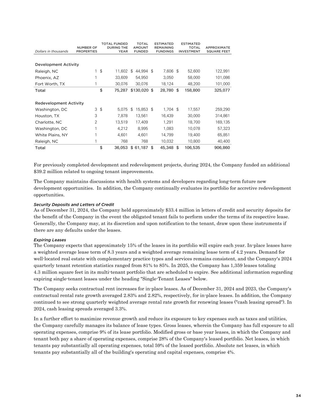估计剩余资金估计总投资约方英尺千元年内资金总额的财产总数资助的发展活动北卡罗来纳州罗利市1 $ 11,602 $ 44,994 $ 7,606 $ 52,600122,991 Phoenix,AZ 1 33,60954,9503,05058,000101,086 Fort Worth,TX 1 30,07630,07618,12448,200101,000 total $ 75,287 $ 130,020 $ 28,780 $ 158,800325,077重建活动华盛顿特区3 $ 5,075 $ 15,853 $ 1,704 $ 17,557259,290休斯顿DC 14,2128,9951,08310,07857,323 White Plains,NY 14,6014,60114,79919,40065,851 Raleigh,NC 1768768 10,03210,80040,400总计36,053美元61,187美元45,348美元106,535906,860美元用于先前完成的开发和再开发项目。在2024年期间,公司为与正在进行的租户改善相关的额外资金3920万美元。公司与卫生系统和开发商就长期的未来新发展机会保持讨论。此外,该公司不断评估其投资组合以寻找增值再开发机会。截至2024年12月31日,公司为公司的利益持有约3340万美元的信用证和保证金,以防承付租户未能根据其各自的租赁条款履行义务。一般而言,公司可酌情并在通知租户后,在租约项下有任何违约情况时动用这些文书。到期租约公司预计,其投资组合中每年将有约15%的租约到期。就地租赁的加权平均租期为8.3年,加权平均剩余租期为4.2年。对位置优越、实践类型和服务互补的房地产的需求保持一致,该公司2024年季度租户保留率统计数据介于81%至85%之间。2025年,该公司在其多租户组合中有1,359份租约,总计430万平方英尺,计划到期。有关即将到期的单租户租约的更多信息,请见下文“单租户租约”标题下。该公司寻求就地租赁的合同租金上涨。截至2024年12月31日和2023年12月31日,公司就地租赁的合同租金增长率平均分别为2.83%和2.82%。此外,公司继续看到续租的强劲季度加权平均租金增长率(“现金租赁价差”)。2024年,现金租赁利差平均为3.3%。为了进一步努力最大限度地提高收入增长并减少其在税收和公用事业等关键费用方面的风险,该公司谨慎管理其租赁类型的余额。总租赁,其中公司对所有运营费用承担全部风险,占其租赁组合的9%。修改后的毛额或基准年租约,其中公司和租户都支付一部分运营费用,占公司租赁组合的28%。净租赁,其中租户支付了几乎所有的运营费用,总计占租赁组合的59%。绝对净租赁,其中租户支付大楼几乎所有的运营和资本费用,占4%。34