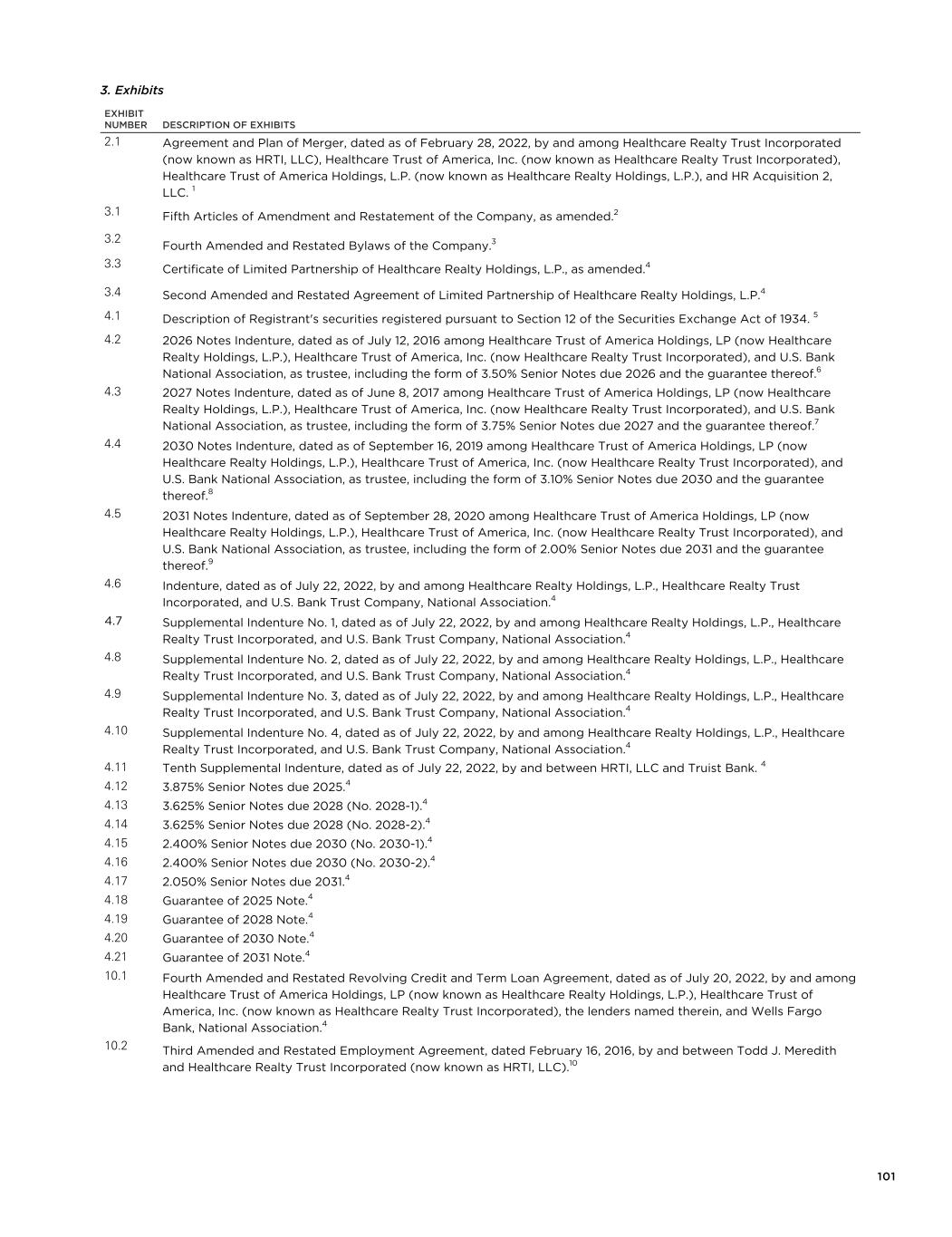 3.展品编号描述截至2022年2月28日由Healthcare Realty Trust Incorporated(现称为HRTI,LLC)、Healthcare Trust of America,Inc.(现称为Healthcare Realty Trust Incorporated)、Healthcare Trust of America Holdings,L.P.(现称为Healthcare Realty Holdings,L.P.)和HR Acquisition 2,LLC签署的ExhibITS 2.1协议和合并计划。13.1经修订的公司第五条修订及重述条款。23.2经修订及重述的公司章程第4条。33.3经修订的Healthcare Realty Holdings,L.P.有限合伙证书。43.4经第二次修订及重述的Healthcare RealtyHoldings有限合伙协议,L.P.4 4.1根据1934年证券交易法第12条登记的注册人证券的说明。54.22026年票据契约,日期为2016年7月12日,由Healthcare Trust of America Holdings,LP(现为Healthcare Realty Holdings,L.P.)、Healthcare Trust of America,Inc.(现为Healthcare Realty Trust Incorporated)和U.S. Bank National Association作为受托人,包括2026年到期的3.50%优先票据的形式及其担保。64.32027票据契约,日期为2017年6月8日,由Healthcare Trust of America Holdings,LP(现为Healthcare Realty Holdings,L.P.)、Healthcare Trust of America,Inc.(现为Healthcare Realty Trust Incorporated)和U.S. Bank National Association作为受托人,包括2027年到期的3.75%优先票据的形式及其担保。74.42030年票据契约,日期为2019年9月16日,由Healthcare Trust of America Holdings,LP(现为Healthcare Realty Holdings,L.P.)、Healthcare Trust of America,Inc.(现为Healthcare Realty Trust Incorporated)和U.S. Bank National Association作为受托人,包括2030年到期的3.10%优先票据的形式及其担保。84.5 2031票据契约,日期为2020年9月28日,由Healthcare Trust of America Holdings,LP(现为Healthcare Realty Trust Incorporated)、Healthcare Trust of America,Inc.(现为TERM3,和U.S. Bank National Association作为受托人,包括2031年到期的2.00%优先票据的形式及其担保。94.6截至2022年7月22日由Healthcare Realty Holdings,L.P.、Healthcare Realty Trust Incorporated和U.S. Bank Trust Company,National Association签署的契约。44.7截至2022年7月22日由Healthcare Realty Holdings,L.P.、Healthcare Realty Trust Incorporated和U.S. Bank Trust Company,National Association签署的第1号补充契约。44.8截至2022年7月22日由Healthcare Realty Holdings,L.P.、Healthcare Realty Trust Incorporated,和U.S. Bank Trust Company,National Association.4 4.9 Supplemental Indenture No. 3,日期为2022年7月22日,由Healthcare Realty Holdings,L.P.、Healthcare Realty Trust Incorporated、U.S. Bank Trust Company,National Association.4 4.10 Supplemental Indenture No. 4,日期为2022年7月22日,由Healthcare Realty Holdings,L.P.、Healthcare Realty Trust IncorporatedTERM3,以及U.S. Bank Trust Company,National Association.4 4.11 HRTI,LLC和Truist Bank,日期为2022年7月22日。44.12 3.875% 2025.4 4.13 3.625% 2028年到期优先票据(第2028-1号)。44.14 3.625% 2028年到期优先票据(第2028-2号)。44.15 2.400% 2030年到期优先票据(第2030-1号)。44.16 2.400% 2030年到期优先票据(第2030-2号)。44.17 2.050% 2031.4 4.18 2025年到期优先票据的担保。44.19 2028票据的担保。44.20 2030票据的担保。44.21 2031年票据的担保。410.1 Healthcare Trust of America Holdings,LP(现称为Healthcare Realty Holdings,L.P.)于2022年7月20日签署的第四次经修订和重述的循环信贷和定期贷款协议,Healthcare Trust of America,Inc.(现称为Healthcare Realty Trust Incorporated),其中指定的贷方,与富国银行银行,全国协会。410.2 2016年2月16日由Healthcare Realty Trust Incorporated(现称为HRTI,LLC)由Todd J. Meredith和TERM3(现称为HRTI,LLC)签订的第三次修订和重述的雇佣协议。10 101