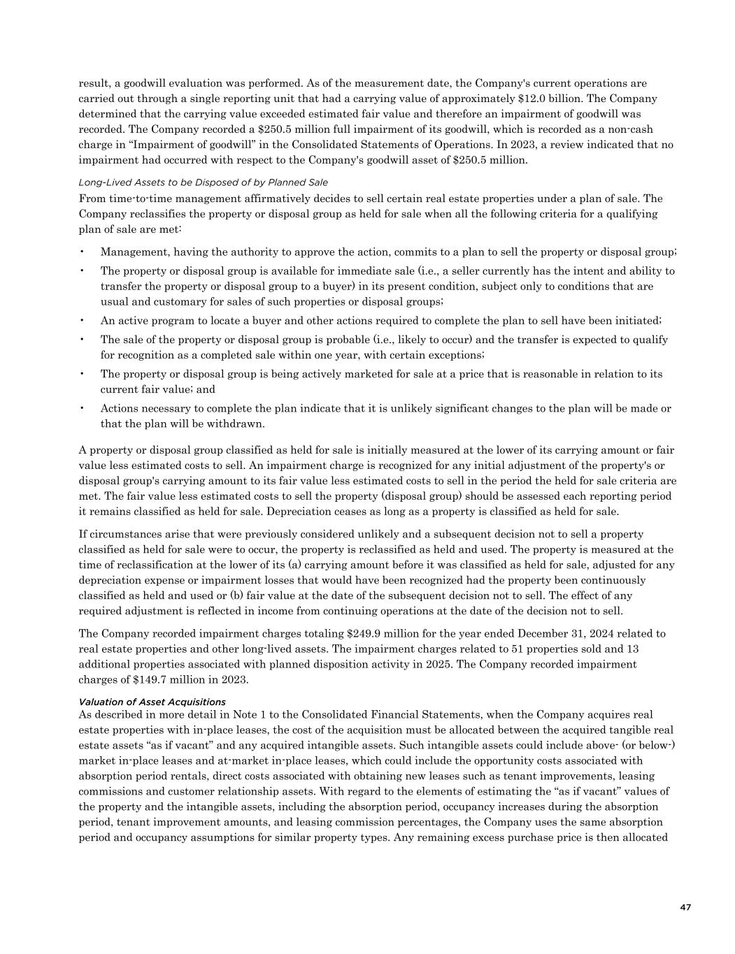 结果,进行了商誉评估。截至计量日,公司目前的运营是通过一个账面价值约为120亿美元的单一报告单位进行的。公司确定账面价值超过估计公允价值,因此录得商誉减值。该公司录得2.505亿美元的商誉全额减值,在综合经营报表的“商誉减值”中作为非现金费用入账。2023年的审查显示,公司2.505亿美元的商誉资产没有发生减值。拟以计划出售方式处置的长期资产由管理层不时肯定地决定根据出售计划出售若干房地产物业。当符合资格销售计划的以下所有标准均得到满足时,公司将该物业或处置组重新分类为持有待售:•管理层有权批准该行动,承诺一项出售该物业或处置组的计划;•该物业或处置组可供立即出售(即卖方目前有将该物业或处置组转让给买方的意图和能力)在其当前状况下,仅受制于此类物业或处置组的销售通常和惯常的条件;•已启动寻找买方的积极计划和完成销售计划所需的其他行动;•物业或处置组的销售很可能(即很可能发生),预计转让有资格在一年内被确认为已完成的销售,除某些例外情况外;•该物业或处置集团正以相对于其当前公允价值而言合理的价格积极进行市场销售;以及•为完成该计划而采取的必要行动表明,不太可能对该计划作出重大改变或该计划将被撤回。分类为持有待售的物业或处置组按其账面值或公允价值减去估计出售成本后的较低者进行初始计量。就物业或处置组的账面值按其公允价值减估计出售成本的任何初步调整确认减值费用,该期间持有待售标准得到满足。出售物业(处置组)的公允价值减去估计成本后,应在其保持分类为持有待售的每个报告期进行评估。只要一处房产被归类为持有待售,折旧就会停止。如果出现了以前认为不太可能的情况,随后发生了不出售归类为持有待售的财产的决定,则该财产被重新归类为持有和使用。该物业在重新分类时按其(a)在分类为持有待售前的账面值中的较低者计量,并根据如果该物业被持续分类为持有和使用将会确认的任何折旧费用或减值损失或(b)在随后决定不出售之日的公允价值进行调整。任何必要调整的影响反映在决定不出售之日的持续经营收入中。截至2024年12月31日止年度,该公司录得与房地产物业和其他长期资产相关的减值费用总计2.499亿美元。与2025年计划处置活动相关的51处已售物业和13处额外物业相关的减值费用。该公司在2023年录得1.497亿美元的减值费用。资产收购的估值如综合财务报表附注1中更详细描述,当公司收购具有就地租赁的房地产物业时,收购成本必须在收购的有形房地产资产“如同空置”与任何收购的无形资产之间进行分配。此类无形资产可包括上述(或以下)市场就地租赁和市场就地租赁,其中可包括与吸收期租金相关的机会成本、与获得新租赁相关的直接成本,例如租户改善、租赁佣金和客户关系资产。关于估计物业和无形资产“仿佛空置”价值的要素,包括吸收期、吸收期内占用增加、租户改善金额、租赁佣金百分比等,公司对类似物业类型采用相同的吸收期和占用假设。然后分配任何剩余的超额购买价格47
