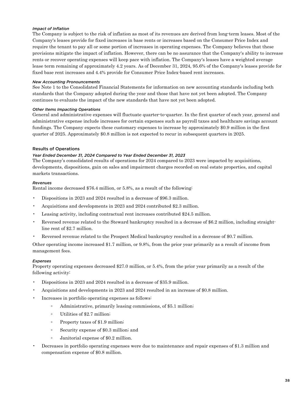 通货膨胀的影响由于公司的大部分收入来自长期租赁,因此公司面临通货膨胀的风险。公司的大部分租约规定固定增加基本租金或基于消费者物价指数的增加,并要求租户支付全部或部分增加的运营费用。该公司认为,这些规定减轻了通货膨胀的影响。然而,无法保证公司提高租金或收回经营开支的能力将与通胀保持同步。公司租赁的加权平均租赁期限剩余约4.2年。截至2024年12月31日,公司95.6%的租赁提供了固定的基本租金上涨,4.4%提供了基于消费者价格指数的租金上涨。新会计公告见综合财务报表附注1,有关新会计准则的资料,包括公司于年内采纳的准则及尚未采纳的准则。公司继续评估尚未采用的新标准的影响。其他影响运营的项目一般和管理费用将按季度波动。在每年第一季度,一般和管理费用包括某些费用的增加,例如工资税和医疗保健储蓄账户资金。该公司预计,这些惯常费用将在2025年第一季度增加约90万美元。预计2025年随后几个季度不会再发生约80万美元的支出。经营业绩截至2024年12月31日止年度与截至2023年12月31日止年度相比公司2024年与2023年相比的综合经营业绩受到收购、开发、处置、销售收益和房地产物业记录的减值费用以及资本市场交易的影响。收入租金收入减少7640万美元,即5.8%,原因如下:• 2023年和2024年的处置导致减少9630万美元。• 2023和2024年的收购和发展贡献了230万美元。•包括合同租金增加在内的租赁活动贡献了2450万美元。•与管家破产相关的反向收入导致减少620万美元,其中包括270万美元的直线租金。•与Prospect Medical破产相关的反向收入导致减少0.7百万美元。其他营业收入较上年增加170万美元,即9.8%,这主要是由于管理费收入所致。费用物业运营费用较上年减少27.0百万美元,即5.4%,主要是由于以下活动:• 2023和2024年的处置导致减少3590万美元。• 2023和2024年的收购和发展导致增加了0.8百万美元。•投资组合运营费用增加如下:⑤行政费用,主要是租赁佣金,510万美元;⑤水电费270万美元;⑤财产税190万美元;⑤安保费用30万美元;⑤看管费用20万美元。•投资组合运营费用减少的原因是维护和维修费用为130万美元,补偿费用为80万美元。38