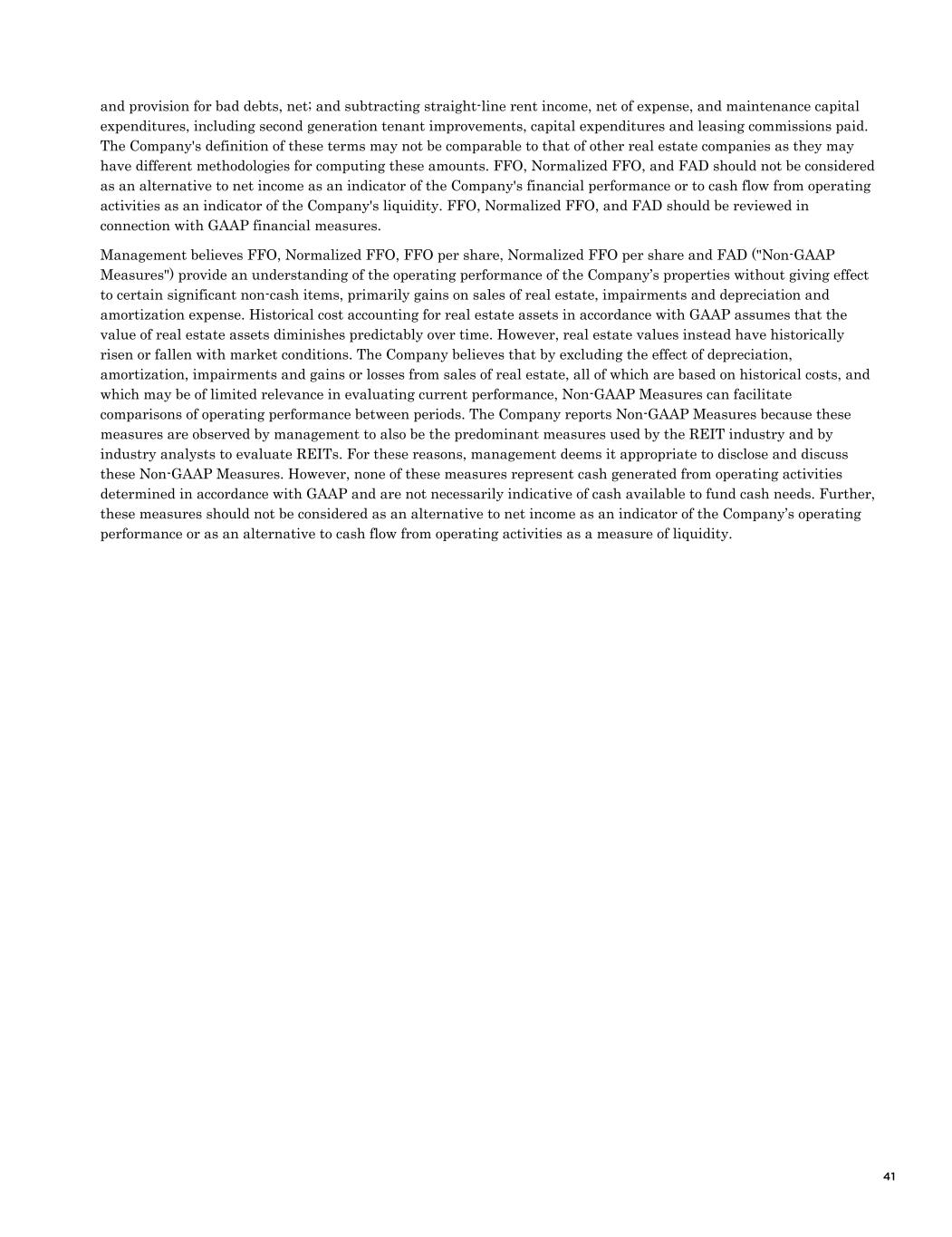 和坏账准备,净额;并减去直线租金收入,扣除费用,以及维护资本支出,包括第二代租户改善,资本支出和支付的租赁佣金。公司对这些术语的定义可能无法与其他房地产公司进行比较,因为它们可能有不同的计算这些金额的方法。FFO、正常化FFO和FAD不应被视为替代净收入作为公司财务业绩的指标或替代经营活动现金流作为公司流动性的指标。应结合GAAP财务指标对FFO、标准化FFO和FAD进行审查。管理层认为,FFO、正常化FFO、每股FFO、每股正常化FFO和FAD(“非公认会计准则措施”)提供了对公司物业经营业绩的理解,而不会影响某些重要的非现金项目,主要是房地产销售收益、减值以及折旧和摊销费用。根据公认会计原则对房地产资产进行的历史成本核算假设房地产资产的价值随着时间的推移而可预测地减少。然而,房地产价值反而在历史上随市场状况而上升或下降。该公司认为,通过排除折旧、摊销、减值和房地产销售损益的影响,所有这些都是基于历史成本,对评估当前业绩的相关性可能有限,非公认会计准则措施可以促进不同时期的经营业绩比较。该公司报告非GAAP衡量标准,因为管理层观察到这些衡量标准也是REIT行业和行业分析师评估REIT所使用的主要衡量标准。出于这些原因,管理层认为披露和讨论这些非公认会计原则措施是合适的。然而,这些衡量标准都不代表根据公认会计原则确定的经营活动产生的现金,也不一定表明可用于满足现金需求的现金。此外,这些措施不应被视为作为衡量公司经营业绩指标的净收入的替代措施,也不应被视为作为流动性衡量标准的经营活动现金流量的替代措施。41