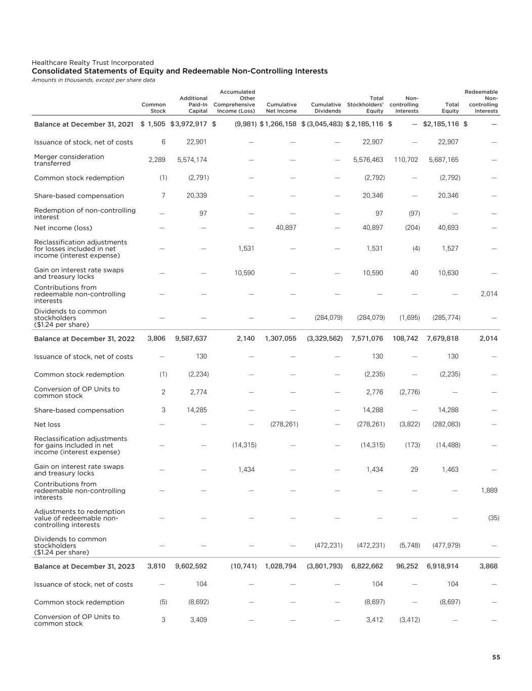 Healthcare Realty Trust Incorporated合并权益和可赎回非控股权益报表除每股数据外的金额以千为单位的普通股额外实收资本累计其他综合收益(亏损)累计净收益累计股息股东权益非控股权益总额权益可赎回非控股权益余额2021年12月31日1,505美元3,972,917美元(9,981)1,266,158美元(3,045,483)2,185,116美元— 2,185,116美元—发行股票,扣除成本622,901 ———— 22,907 — 22,907 —合并对价转让2,2895,574,174 ———— 5,576,463110,7025,687,165 —普通股赎回(1)(2,791)————(2,792)—(2,792)—股份补偿720,339 ———— 20,346 — 20,346 —赎回非控股权益— 97 ———— 97(97)——净收入(亏损)———— 40,897 — 40,897(204)40,693 ——计入净收入(利息支出)的亏损的重分类调整—— 1,531 —— 1,531(4)1,527 ——利率掉期收益和国库锁定—— 10,590 —— 10,5904010,630 ——来自可赎回非控股权益的贡献———————— 2,0 14普通股股东股息(每股1.24美元)————(284,079)(284,079)(1,695)(285,774)—— 2022年12月31日余额3,8069,587,6372,1401,307,055(3,329,562)7,571,076108,7427,679,8182,0 14发行股票,扣除成本—— 130 —— 130 —— 130 ——普通股赎回(1)(2,234)————(2,235)——(2,235)——将OP单位转换为普通股22,774 —— 2,776(2,776)——以股份为基础的报酬314,285 —— 14,288 —— 14,288 ——净亏损————(278,261)——(278,261)(3,822)(282,083)——计入净收入(利息支出)的收益的重新分类调整——(14,315)——(14,315)(173)(14,488)——利率掉期收益和国库锁定—— 1,434 —— 1,434291,463 ——可赎回非控股权益的贡献———————— 1,889可赎回非控股权益赎回价值的调整————————(35)普通股股东的股息(每股1.24美元)————(472,231)(472,231)(5,748)(477,979)—— 2023年12月31日余额3,8109,602,592(10,741)1,028,794(3,801,793)6,822,66296,2526,918,9143,868发行股票,扣除成本— 104 ———— 104 —— 104 ——普通股赎回(5)(8,692)————(8,697)——(8,697)—— OP单位转换为普通股33,409 ———— 3,412(3,412)—— 55