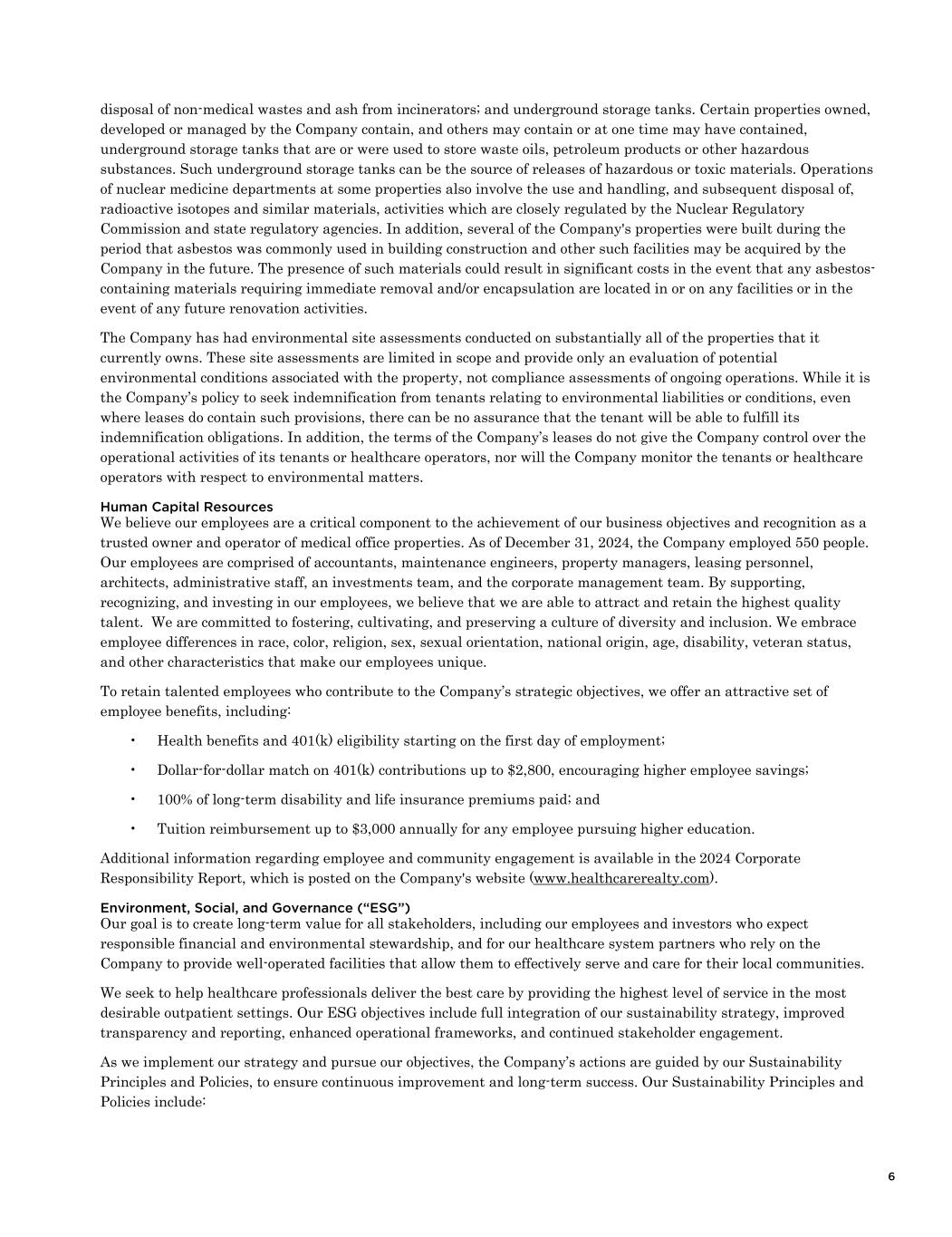 处置焚烧炉产生的非医疗废物和灰渣;以及地下储罐。公司拥有、开发或管理的某些物业包含,而其他物业可能包含或曾经包含地下储罐,这些储罐现在或曾经用于储存废油、石油产品或其他有害物质。这种地下储罐可能是危险或有毒物质释放的来源。核医学部门在一些物业的操作还涉及放射性同位素和类似材料的使用和处理以及后续处置,这些活动受到核管理委员会和国家监管机构的密切监管。此外,公司的若干物业是在建筑施工普遍使用石棉期间建造的,公司未来可能会收购其他此类设施。如果需要立即清除和/或封装的任何含石棉材料位于任何设施内或设施上,或者在未来进行任何翻新活动时,此类材料的存在可能会导致巨额成本。该公司已对其目前拥有的几乎所有物业进行了环境现场评估。这些场地评估的范围有限,仅提供与物业相关的潜在环境条件评估,而不是正在进行的运营的合规评估。虽然公司的政策是就环境责任或条件向租户寻求赔偿,但即使租约确实包含此类规定,也无法保证租户将能够履行其赔偿义务。此外,公司的租约条款并未赋予公司对其租户或医疗保健运营商的运营活动的控制权,公司也不会就环境问题对租户或医疗保健运营商进行监控。人力资本资源我们相信,我们的员工是实现我们的业务目标和作为医疗办公物业值得信赖的所有者和运营商的认可的关键组成部分。截至2024年12月31日,公司雇佣了550人。我们的员工由会计、维修工程师、物业经理、租赁人员、建筑师、行政人员、投资团队、企业管理团队组成。通过支持、认可和投资我们的员工,我们相信我们能够吸引并留住最优质的人才。我们致力于培育、培育和维护多元包容的文化。我们拥抱员工在种族、肤色、宗教、性别、性取向、国籍、年龄、残疾、退伍军人身份以及其他使我们的员工与众不同的特征方面的差异。为了留住为公司战略目标做出贡献的有才华的员工,我们提供了一套有吸引力的员工福利,包括:•从入职第一天开始,健康福利和401(k)资格;• 401(k)供款的美元对美元匹配高达2800美元,鼓励提高员工储蓄;• 100%支付长期残疾和人寿保险保费;•任何追求高等教育的员工每年可获得高达3,000美元的学费报销。有关员工和社区参与的更多信息,请参阅2024年企业责任报告,该报告发布在公司网站(www.healthcarerealty.com)上。环境、社会和治理(“ESG”)我们的目标是为所有利益相关者创造长期价值,包括我们的员工和投资者,他们期望得到负责任的财务和环境管理,并为我们的医疗保健系统合作伙伴创造长期价值,这些合作伙伴依赖公司提供运营良好的设施,使他们能够有效地服务和关心当地社区。我们寻求通过在最理想的门诊环境中提供最高水平的服务来帮助医疗保健专业人员提供最好的护理。我们的ESG目标包括全面整合我们的可持续发展战略、提高透明度和报告、加强运营框架以及持续的利益相关者参与。在我们实施战略和追求目标的过程中,公司的行动以我们的可持续发展原则和政策为指导,以确保持续改进和长期成功。我们的可持续发展原则和政策包括:6