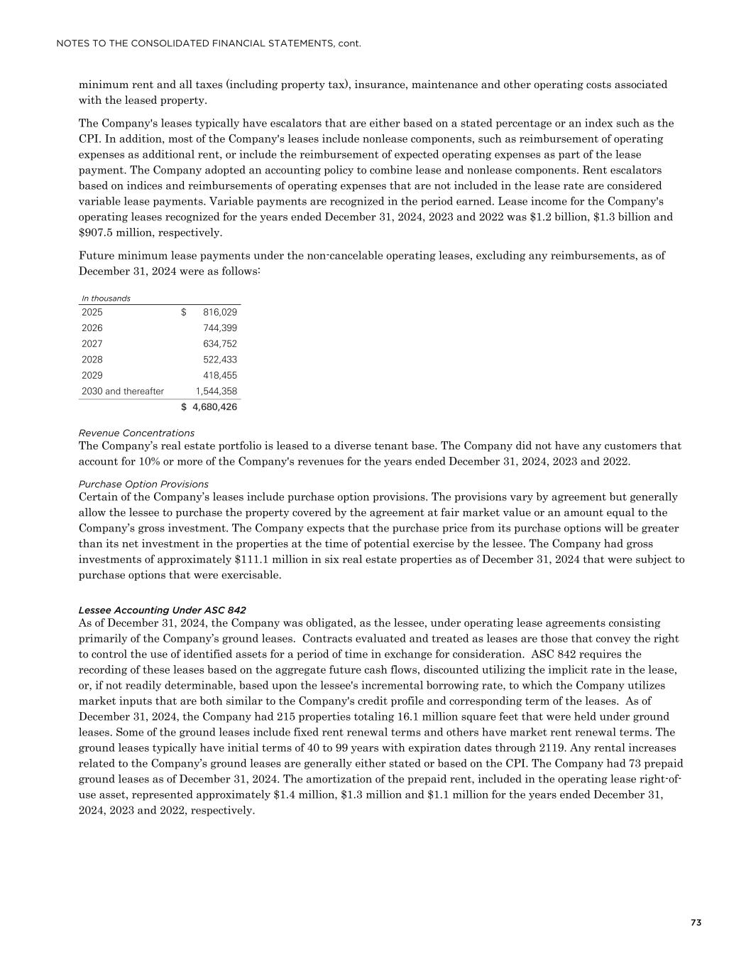 最低租金以及与租赁物业相关的所有税费(包括物业税)、保险、维护和其他运营成本。该公司的租约通常有自动扶梯,这些自动扶梯要么基于规定的百分比,要么基于CPI等指数。此外,公司的大部分租赁包含非租赁部分,例如作为额外租金偿还运营费用,或将预期运营费用的偿还作为租赁付款的一部分。公司采用了将租赁和非租赁部分合并的会计政策。基于指数的租赁自动扶梯以及不计入租赁费率的运营费用报销被视为可变租赁付款。可变款项在赚取的期间内确认。公司截至2024年12月31日、2023年和2022年12月31日止年度确认的经营租赁的租赁收入分别为12亿美元、13亿美元和9.075亿美元。截至2024年12月31日,不可撤销经营租赁项下的未来最低租赁付款(不包括任何补偿)如下:以千计2025816,0292026744,3992027634,7522028522,4332029418,4552030及其后的1,544,358美元4,680,426收入集中公司的房地产投资组合出租给不同的租户基础。截至2024年12月31日、2023年和2022年12月31日止年度,公司没有任何客户占公司收入的10%或以上。购买选择权条款公司的某些租赁包括购买选择权条款。条款因协议而异,但一般允许承租人以公允市场价值或等于公司投资总额的金额购买协议涵盖的物业。公司预计,其购买期权的购买价格将高于其在承租人潜在行使时对物业的净投资。截至2024年12月31日,该公司在六处房地产上的总投资约为1.111亿美元,这些房地产受制于可行使的购买期权。ASC 842下的承租人会计核算截至2024年12月31日,公司作为承租人根据主要由公司地面租赁组成的经营租赁协议承担义务。经评估并作为租赁处理的合同,是指在一段时间内转让对已识别资产使用控制权以换取对价的合同。ASC 842要求根据未来现金流总额记录这些租赁,并使用租赁中的隐含利率进行贴现,或者,如果不是很容易确定,则根据承租人的增量借款利率,公司利用与公司信用状况和租赁相应期限相似的市场投入来记录该利率。截至2024年12月31日,公司根据地面租赁持有215处物业,总面积1610万平方英尺。部分地租包括固定租金续租条款,其他则有市场租金续租条款。地面租约的初始期限通常为40至99年,到期日至2119年。任何与公司地面租赁相关的租金上涨通常要么说明,要么基于CPI。截至2024年12月31日,该公司有73个预付地租。截至2024年12月31日、2023年和2022年12月31日止年度,包括在经营租赁使用权资产中的预付租金摊销分别约为140万美元、130万美元和110万美元。合并财务报表附注,续。73