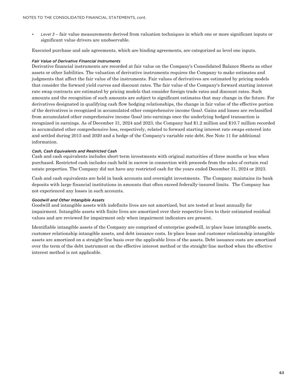 •第3级–源自估值技术的公允价值计量,其中一个或多个重要输入或重要价值驱动因素是不可观察的。已执行的购买和销售协议,这是具有约束力的协议,被归类为第一级投入。衍生金融工具公允价值衍生金融工具在公司合并资产负债表中作为其他资产或其他负债以公允价值入账。衍生工具的估值需要公司做出影响工具公允价值的估计和判断。衍生工具的公允价值通过考虑远期收益率曲线和贴现率的定价模型进行估算。公司远期起始利率互换合约的公允价值采用考虑外贸费率和贴现率的定价模型进行估算。此类金额和此类金额的确认取决于未来可能发生变化的重大估计。对于指定为符合条件的现金流量套期关系的衍生工具,衍生工具有效部分的公允价值变动计入累计其他综合收益(损失)。一旦标的被套期交易在收益中确认,损益从累计其他综合收益(损失)中重新分类为收益。截至2024年12月31日和2023年12月31日,公司分别有120万美元和1070万美元的累计其他综合损失,与2015年和2020年期间订立和结算的远期起始利率掉期以及公司浮动利率债务的对冲有关。更多信息见附注11。现金、现金等价物和受限制现金现金及现金等价物包括购买时原到期日为三个月或更短的短期投资。受限制现金包括与出售某些房地产物业的收益有关的托管现金。截至2024年12月31日或2023年12月31日止年度,公司并无任何受限制现金。现金和现金等价物存放在银行账户和隔夜投资中。该公司在大型金融机构的银行存款金额经常超过联邦保险限额。本公司在该等帐目中并无出现任何亏损。商誉和其他无形资产商誉和使用寿命不确定的无形资产不进行摊销,但至少每年进行减值测试。使用寿命有限的无形资产在其各自使用寿命内摊销至其估计残值,并仅在存在减值指标时进行减值审查。公司可辨认无形资产由企业商誉、就地租赁无形资产、客户关系无形资产、发债成本构成。就地租赁和客户关系无形资产在资产适用年限内按直线法摊销。发债费用在不适用实际利率法的情况下,按实际利率法或直线法在债务工具期限内摊销。合并财务报表附注,续。63