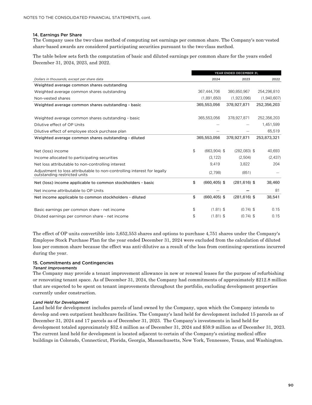 14.每股收益公司采用两类法计算每股普通股净收益。根据两级法,公司的非既得股份奖励被视为参与证券。下表列出了截至2024年12月31日、2023年和2022年12月31日止年度的基本和稀释每股普通股收益的计算方法。截至12月31日止年度,以千美元计,每股数据除外202420232022加权平均已发行普通股加权平均已发行普通股367,444,706380,850,967254,296,810非既得股(1,891,650)(1,923,096)(1,940,607)加权平均已发行普通股-基本365,553,056378,927,871252,356,203加权平均已发行普通股-基本365,553,056378,927,871252,356,203 OP单位的稀释效应—— 1,451,599员工购股计划的稀释效应—— 65,519加权平均已发行普通股-稀释365,553,056378,927,871253,873,321净(亏损)收入$(663,904)$(28归属于合法未偿还受限制单位的非控股权益的亏损(2,798)(851)—适用于普通股股东的净(亏损)收入-基本$(660,405)$(281,616)$ 38,460归属于OP单位的净利润—— 81适用于普通股股东的净利润-稀释后$(660,405)$(281,616)$ 38,541每股基本收益-净收益$(1.81)$(0.74)$ 0.15稀释后每股普通股收益-净收益$(1.81)$(0.74)$ 0.15可转换为3,652,553股的OP单位的影响根据公司截至2024年12月31日止年度的员工股票购买计划购买4,751股股份的期权被排除在稀释后每股普通股亏损的计算之外,因为该影响是反稀释的,因为该年度产生了持续经营业务的亏损。15.承诺和或有事项租户改善本公司可在新租约或续租租约中提供租户改善津贴,以翻新或翻新租户空间。截至2024年12月31日,该公司的承付款约为2.128亿美元,预计将用于整个投资组合的租户改善,不包括目前在建的开发物业。为发展而持有的土地为发展而持有的土地包括公司拥有的宗地,公司拟在该宗地上发展及拥有门诊医疗设施。公司持作发展的土地包括截至2024年12月31日的15宗地及截至2023年12月31日的17宗地。截至2024年12月31日,该公司对持有用于开发的土地的投资总额约为5240万美元,截至2023年12月31日为5990万美元。目前持有待开发的土地位于公司位于科罗拉多州、康涅狄格州、佛罗里达州、乔治亚州、马萨诸塞州、纽约州、田纳西州、德克萨斯州和华盛顿州的某些现有医疗办公楼附近。合并财务报表附注,续。90