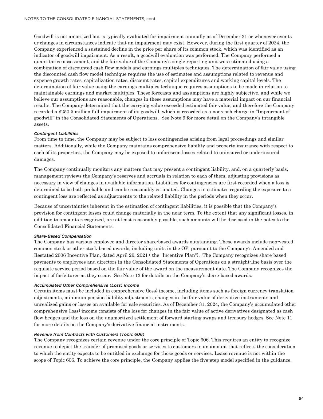 商誉不摊销,但通常在截至12月31日的年度或每当事件或情况变化表明可能存在减值时进行减值评估。然而,在2024年第一季度,公司经历了普通股每股价格的持续下跌,这被确定为商誉减值的一个指标。因此,进行了商誉评估。公司进行了量化评估,采用贴现现金流模型和收益倍数技术相结合的方法对公司单一报告单位的公允价值进行了估算。使用贴现现金流模型技术确定公允价值需要使用与收入和费用增长率、资本化率、贴现率、资本支出和营运资本水平相关的估计和假设。使用收益倍数技术确定公允价值需要对可维持收益和市场倍数做出假设。这些预测和假设具有高度主观性,虽然我们认为我们的假设是合理的,但这些假设的变化可能会对我们的财务业绩产生重大影响。公司确定账面价值超过了估计的公允价值,因此公司记录了2.505亿美元的商誉全额减值,在综合经营报表的“商誉减值”中作为非现金费用入账。有关公司无形资产的更多详细信息,请参见附注9。或有负债公司不时可能会因法律程序及类似事项而产生或有亏损。此外,虽然公司就其每项财产维持全面责任和财产保险,但公司可能会面临与未投保或未投保损害有关的意外损失。公司持续监控任何可能产生或有负债的事项,管理层每季度审查公司与每一项相关的准备金和应计项目,并根据可用信息的变化酌情调整拨备。或有事项负债首先在确定损失既可能发生又可以合理估计时入账。有关或有损失风险的估计变动在发生期间反映为对相关负债的调整。由于估计或有负债所固有的不确定性,公司的或有损失拨备可能在近期内发生重大变化。如果除已确认的金额外,任何重大损失至少是合理可能的,则这些金额将在综合财务报表附注中披露。以股份为基础的薪酬公司有各种员工和董事以股份为基础的奖励尚未兑现。根据公司日期为2021年4月29日的经修订和重述的2006年激励计划(“激励计划”),这些奖励包括非既得普通股或其他基于股票的奖励,包括OP中的单位。公司根据计量日的奖励公允价值在必要的服务期内以直线法在综合经营报表中确认以股份为基础的支付给员工和董事的款项。公司在没收发生时确认其影响。有关公司股份奖励的详情,请参阅附注13。累计其他综合(亏损)收益某些项目必须计入综合(亏损)收益,包括外币折算调整、最低养老金负债调整、衍生工具公允价值变动和可供出售证券的未实现损益等项目。截至2024年12月31日,公司累计其他综合(亏损)收益由指定为现金流量套期的主动衍生工具公允价值变动损失和远期起始掉期和国库套期未摊销结算损失组成。有关公司衍生金融工具的更多详情,请参阅附注11。客户合同收入(主题606)公司根据主题606的核心原则确认一定的收入。这要求一个实体确认收入,以描述向客户转让承诺的商品或服务的金额,该金额反映了该实体预期有权获得以换取这些商品或服务的对价。租赁收入不在主题606范围内。为实现核心原则,公司应用指导意见中规定的五步走模式。合并财务报表附注,续。64