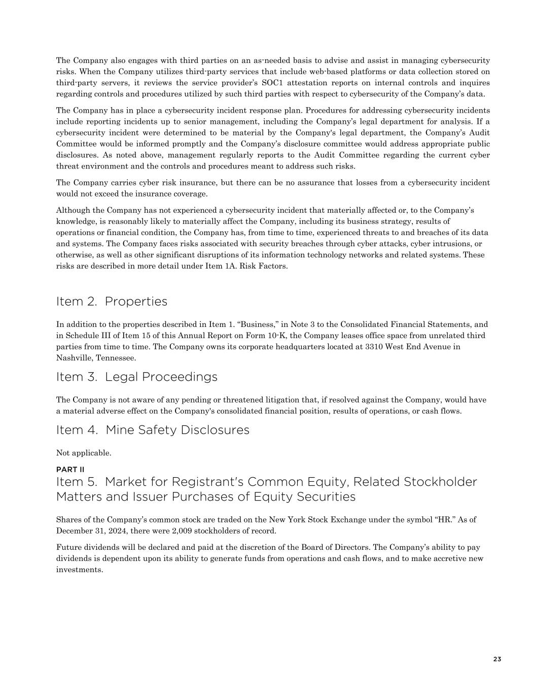 该公司还根据需要与第三方合作,为管理网络安全风险提供建议和协助。当公司使用第三方服务时,包括基于网络的平台或存储在第三方服务器上的数据收集,它会审查服务提供商关于内部控制的SOC1认证报告,并询问此类第三方在公司数据的网络安全方面使用的控制和程序。公司已制定网络安全事件应对计划。处理网络安全事件的程序包括向高级管理层报告事件,包括公司的法律部门进行分析。如果网络安全事件被公司法律部门确定为重大事件,公司的审计委员会将被及时告知,公司的披露委员会将处理适当的公开披露。如上所述,管理层定期向审计委员会报告当前的网络威胁环境以及旨在应对此类风险的控制和程序。该公司承保网络风险保险,但无法保证网络安全事故造成的损失不会超过保险范围。尽管公司没有经历过对公司产生重大影响或据公司所知有合理可能对公司产生重大影响的网络安全事件,包括其业务战略、经营业绩或财务状况,但公司不时经历对其数据和系统的威胁和破坏。该公司面临与通过网络攻击、网络入侵或其他方式的安全漏洞相关的风险,以及其信息技术网络和相关系统的其他重大中断。这些风险在项目1a下有更详细的描述。风险因素。项目2。除了项目1中描述的属性之外的属性。“业务”,在合并财务报表附注3中,以及在本年度报告表格10-K的项目15的附表III中,公司不时向非关联第三方租赁办公空间。该公司拥有位于田纳西州纳什维尔西区大道3310号的公司总部。项目3。法律程序本公司并不知悉任何未决或威胁诉讼,如果针对本公司的解决将对本公司的综合财务状况、经营业绩或现金流量产生重大不利影响。项目4。矿山安全披露不适用。第二部分第5项。注册人普通股市场、相关股东事项和发行人购买公司普通股的股本证券股份在纽约证券交易所交易,代码为“HR”。截至2024年12月31日,在册股东共2,009户。未来的股息将由董事会酌情宣布和支付。该公司支付股息的能力取决于其从运营和现金流中产生资金的能力,以及进行增值新投资的能力。23