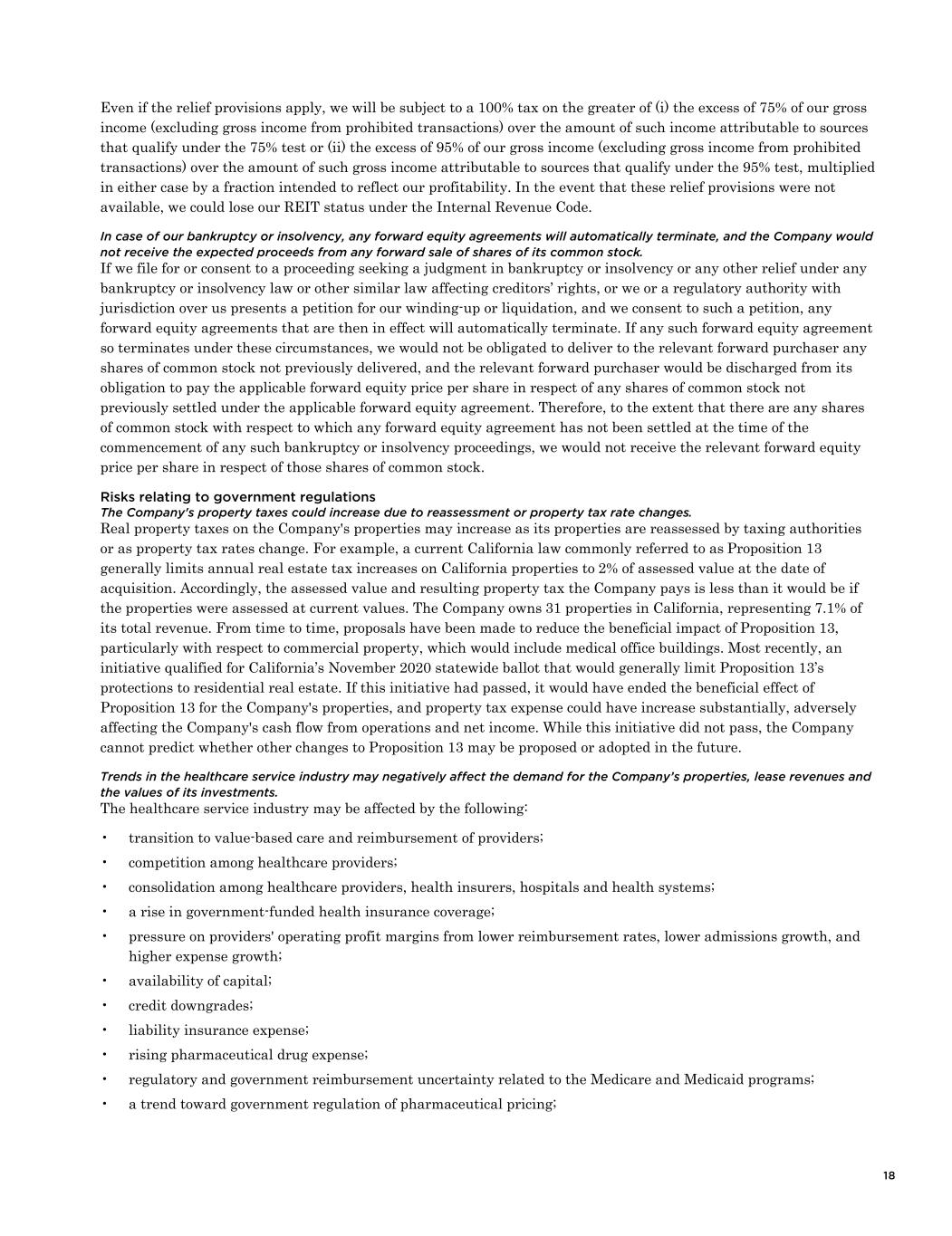 即使减免条款适用,我们将按(i)我们的毛收入(不包括来自禁止交易的毛收入)超过可归属于符合75%测试条件的来源的此类收入金额的75%或(ii)我们的毛收入(不包括来自禁止交易的毛收入)超过可归属于符合95%测试条件的来源的此类毛收入金额的95%,在任何一种情况下乘以旨在反映我们盈利能力的分数中的较高者,征收100%的税。如果无法获得这些救济条款,我们可能会根据《国内税收法》失去我们的房地产投资信托基金地位。如果我们破产或无力偿债,任何远期股权协议将自动终止,公司将不会收到任何远期出售其普通股股份的预期收益。如果我们根据任何破产法或破产法或其他影响债权人权利的类似法律申请或同意寻求破产或无力偿债判决或任何其他救济的程序,或者我们或对我们有管辖权的监管机构提出我们的清盘或清算申请,并且我们同意这样的申请,则任何当时有效的远期股权协议将自动终止。如果任何此类远期股权协议在这些情况下如此终止,我们将没有义务向相关远期买方交付任何先前未交付的普通股股份,并且相关远期买方将被解除就先前未根据适用的远期股权协议结算的任何普通股股份支付适用的每股远期股权价格的义务。因此,如果在启动任何此类破产或破产程序时,有任何远期股权协议尚未就任何普通股股份进行结算,我们将不会收到与这些普通股股份相关的每股远期股权价格。与政府法规有关的风险公司的物业税可能因重新评估或物业税率变化而增加。随着税务机关对公司物业进行重新评估或物业税率发生变化,对公司物业征收的房地产税可能会增加。例如,加州现行法律通常被称为第13号提案,通常将加州房产的年度房地产税增幅限制在购置之日评估价值的2%。因此,公司支付的评估价值和由此产生的财产税低于按当前价值评估财产的情况。该公司在加州拥有31处房产,占总收入的7.1%。不时有人提出建议,以减少第13号提案的有利影响,特别是在商业物业方面,其中将包括医疗办公楼。最近,一项倡议获得了加州2020年11月全州范围内投票的资格,该倡议将普遍限制第13号提案对住宅房地产的保护。如果这一举措获得通过,就会结束13号提案对公司物业的有利影响,物业税费用可能会大幅增加,对公司的经营现金流和净收入产生不利影响。虽然这一举措没有获得通过,但公司无法预测未来是否会提出或采纳对第13号提案的其他修改。医疗保健服务行业的趋势可能会对公司物业的需求、租赁收入和投资价值产生负面影响。医疗保健服务行业可能会受到以下影响:•向基于价值的护理和提供者的报销过渡;•医疗保健提供者之间的竞争;•医疗保健提供者、健康保险公司、医院和卫生系统之间的整合;•政府资助的医疗保险覆盖率上升;•较低的报销率、较低的入院人数增长对提供者的营业利润率造成压力,和更高的费用增长;•资本的可得性;•信用降级;•责任保险费用;•药品费用上升;•与医疗保险和医疗补助计划相关的监管和政府报销不确定性;•政府对药品定价进行监管的趋势;18