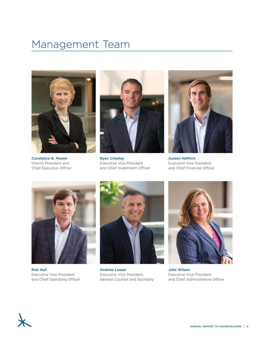 致股东的年度报告| 4管理团队Constance B. Moore临时总裁兼首席执行官Rob Hull执行副总裁兼首席运营官Ryan Crowley执行副总裁兼首席投资官Andrew Loope执行副总裁、总法律顾问兼秘书Austen Helfrich执行副总裁兼首席财务官 Julie Wilson执行副总裁兼首席行政官