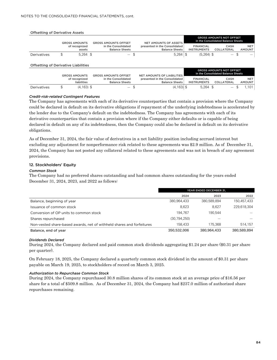 抵消衍生资产毛额确认资产毛额抵消合并资产负债表中列报的资产净额未抵消合并资产负债表中未抵消的资产毛额金融工具现金抵押净额衍生工具$ 5,264 $ — $ 5,264 $(5,264)$ — $ —抵消衍生负债毛额确认负债毛额抵消合并资产负债表中列报的负债净额毛额未抵消$ — $(4,163)$ 5,264 $ — $ 1,101与信用风险相关的或有特征公司与每个衍生交易对手都有协议,其中包含一项条款,如果由于公司对债务的违约,贷款人加速偿还基础债务,公司可能会被宣布对其衍生债务违约。公司与其每个衍生交易对手订立协议,其中包含一项条款,如果公司违约或能够被宣布对其任何债务违约,那么公司也可能被宣布对其衍生义务违约。截至2024年12月31日,净负债头寸中包括应计利息但不包括与这些协议相关的任何不履约风险调整的衍生工具的公允价值为290万美元。截至2024年12月31日,公司未发布与这些协议相关的任何抵押品,也未违反任何协议条款。12.股东权益普通股公司没有发行在外的优先股,截至2024年12月31日、2023年和2022年12月31日止年度的已发行普通股如下:截至2024年12月31日止年度20232022年度余额,年初380,964,433380,589,894150,457,433发行普通股8,6238,627229,618,304将OP单位转换为普通股194,767190,544 —回购股份(30,794,250)——非既得股份奖励,扣除扣留股份和没收158,433175,368514,157余额,年末350,532,006380,964,433380,589,8942024年期间宣布的股息,该公司宣布并支付了总计每股1.24美元的普通股股息(每季度每股0.31美元)。2025年2月18日,公司宣布向2025年3月3日登记在册的股东派发季度普通股股息,金额为每股0.31美元,将于2025年3月19日支付。授权在2024年期间回购普通股,该公司以每股16.56美元的平均价格回购了3080万股普通股,总额为5.098亿美元。截至2024年12月31日,公司剩余2.37亿美元的授权股票回购。合并财务报表附注,续。84