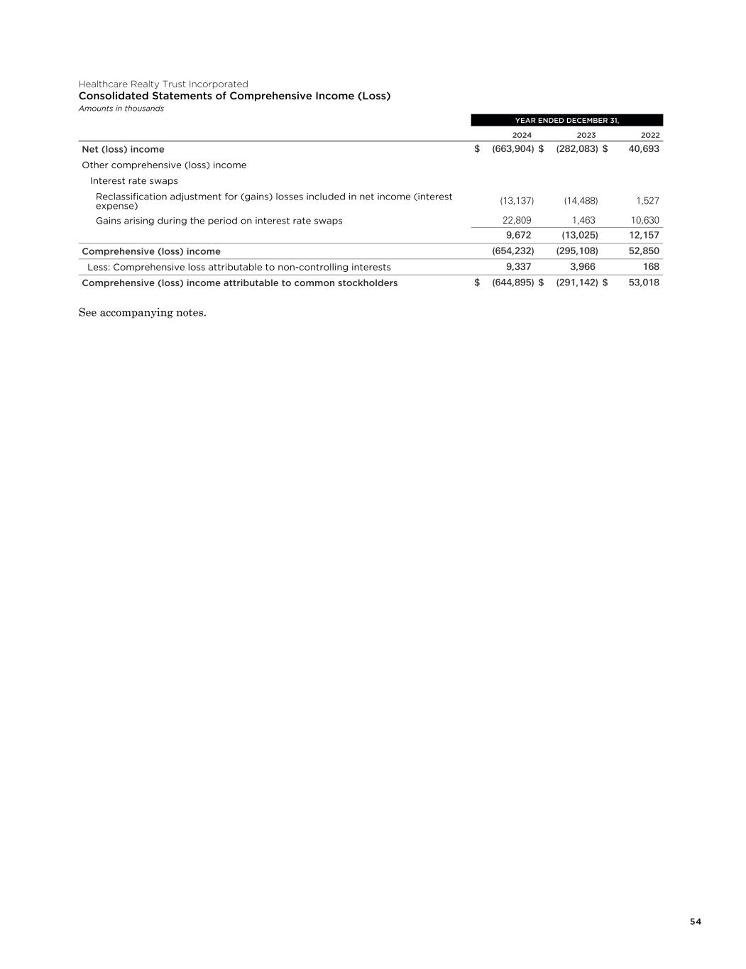 Healthcare Realty Trust Incorporated合并综合收益(亏损)表截至2024年12月31日止年度的千元金额20232022净(亏损)收入$(663,904)$(282,083)$ 40,693其他综合(亏损)收入利率掉期重分类调整计入净收益(利息支出)(13,137)(14,488)1,527利率掉期期间产生的收益22,8091,46310,6309,672(13,025)12,157综合(亏损)收入(654,232)(295,108)52,850减:归属于非控股权益的综合亏损9,3373,966168归属于普通股股东的综合(亏损)收益$(644,895)$(291,142)$ 53,018见附注。54