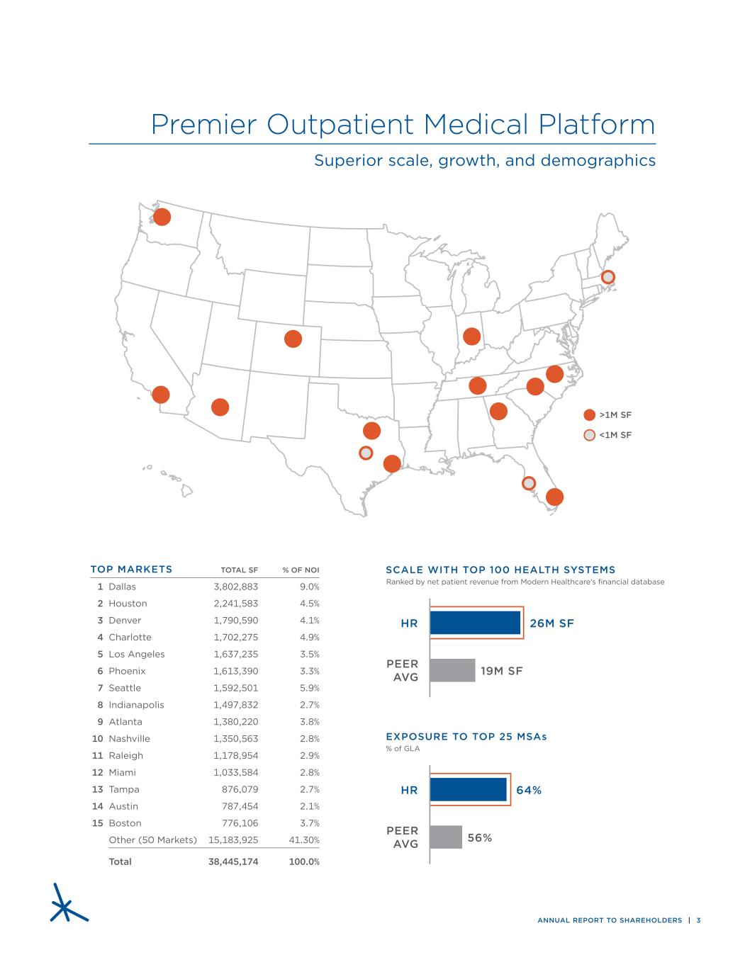 致股东的年度报告| 3个TOP Markets Total SF % of NOI 1 Dallas 3,802,8839.0% 2 Houston 2,241,5834.5% 3 Denver 1,790,5904.1% 4 Charlotte 1,702,2754.9% 5 Los Angeles 1,637,2353.5% 6 Phoenix 1,613,3903.3% 7 Seattle 1,592,5015.9% 8 Indianapolis 1,497,8322.7% 9 Atlanta 1,380,2203.8% 10 Nashville 1,350,5632.8% 11 Raleigh 1,178,9542.9% 12 Miami 1,033,5842.8% 13 Tampa 876,0792.7% 14 Austin 787,4542.1% 15 Boston 776,1063.7% Other(50 Markets)15,与TOP100健康系统的人口统计规模按来自Modern Healthcare财务数据库的患者净收入排名暴露于TOP25 MSAs %的GLA HR HR PEER AVG PEER AVG 26M SF 64% 19M SF 56%