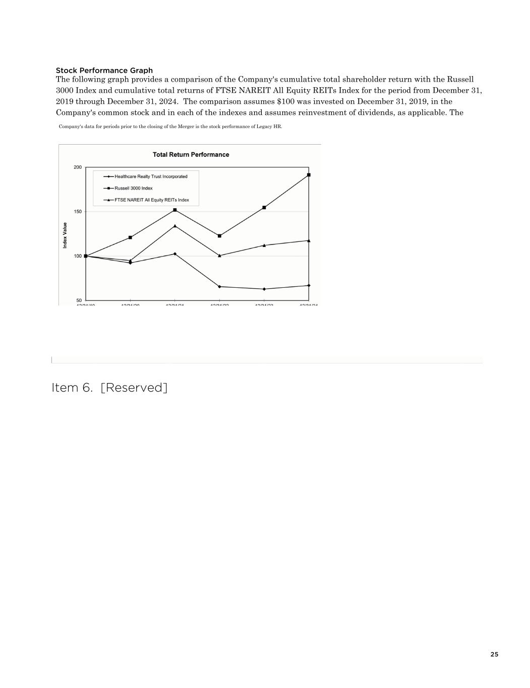 股票表现图下图提供了2019年12月31日至2024年12月31日期间公司与罗素3000指数的累计股东总回报率和富时NAREIT全股票REITs指数的累计总回报率的比较。比较假设100美元于2019年12月31日投资于公司普通股和每个指数,并假设股息再投资(如适用)。该公司在合并完成前一段时间的数据是Legacy HR的股票表现。项目6。【保留】股票表现图下图提供了2019年12月31日至2024年12月31日期间公司与罗素3000指数的累计股东总回报率和富时NAREIT全股票REITs指数的累计总回报率的比较。比较假设100美元于2019年12月31日投资于公司普通股和i各指数,并假设股息再投资(如适用)。CoPany在合并完成前的数据是Legacy HR的股票表现。项目6。【保留】股票表现图下图提供了2019年12月31日至2024年12月31日期间公司与罗素3000指数的累计股东总回报率和富时NAREIT全股票REITs指数的累计总回报率的比较。比较假设100美元于2019年12月31日投资于公司普通股和每个指数,并假设股息再投资(如适用)。该公司在合并完成前一段时间的数据是Legacy HR的股票表现。项目6。[保留] 25