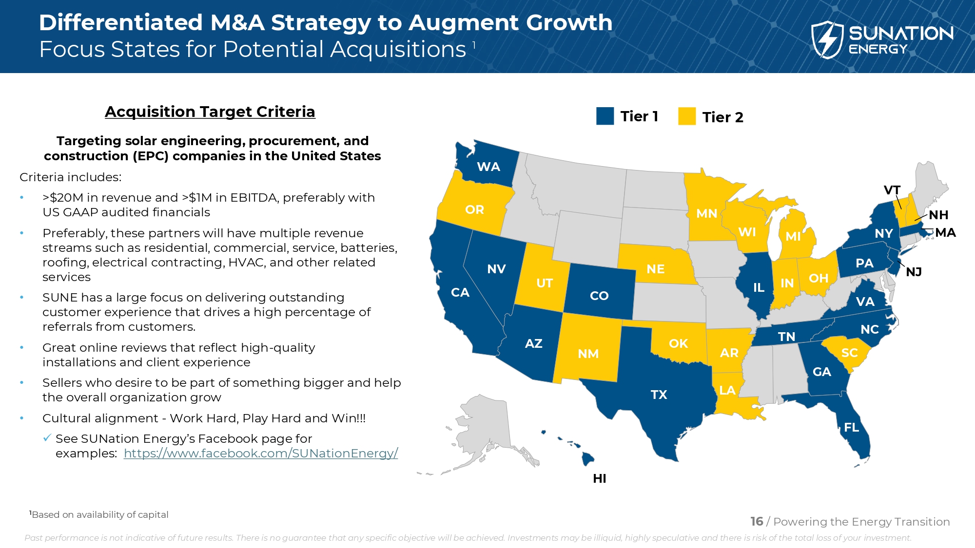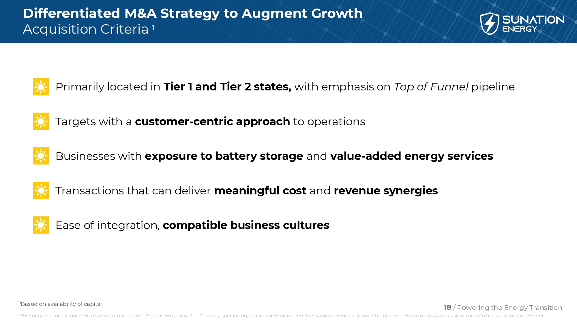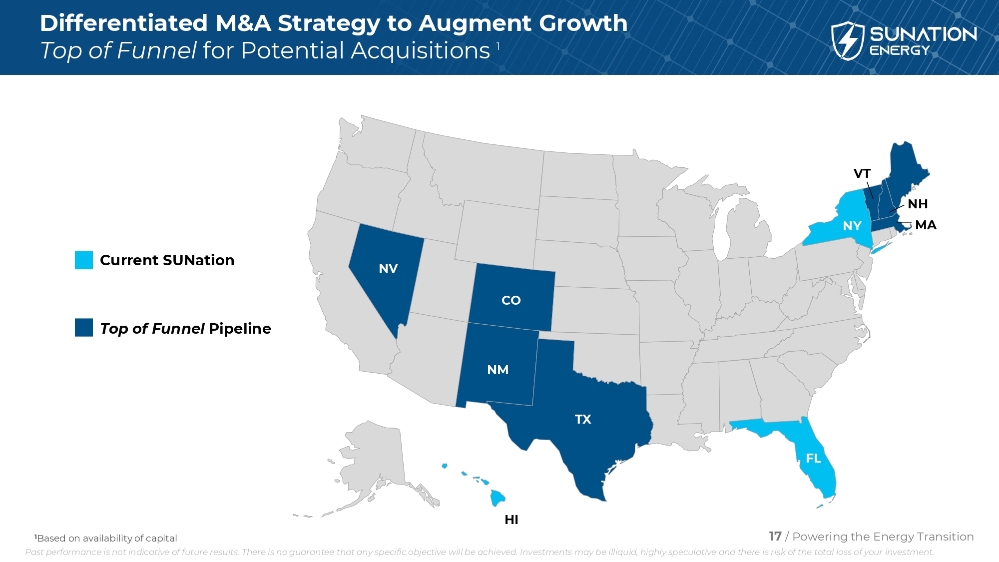 NV CO TX NM HI NY FL VT NH MA 17/Powering the Energy Transition差异化并购战略增强增长Funnel Top for Potential Acquisitions 1 Funnel Pipeline ME 1 current SUNation Top based on availability of capital past performance is not indicative of future results。不能保证任何具体目标都能实现。inv est ments可能缺乏流动性,投机性强,存在投资全损的风险。