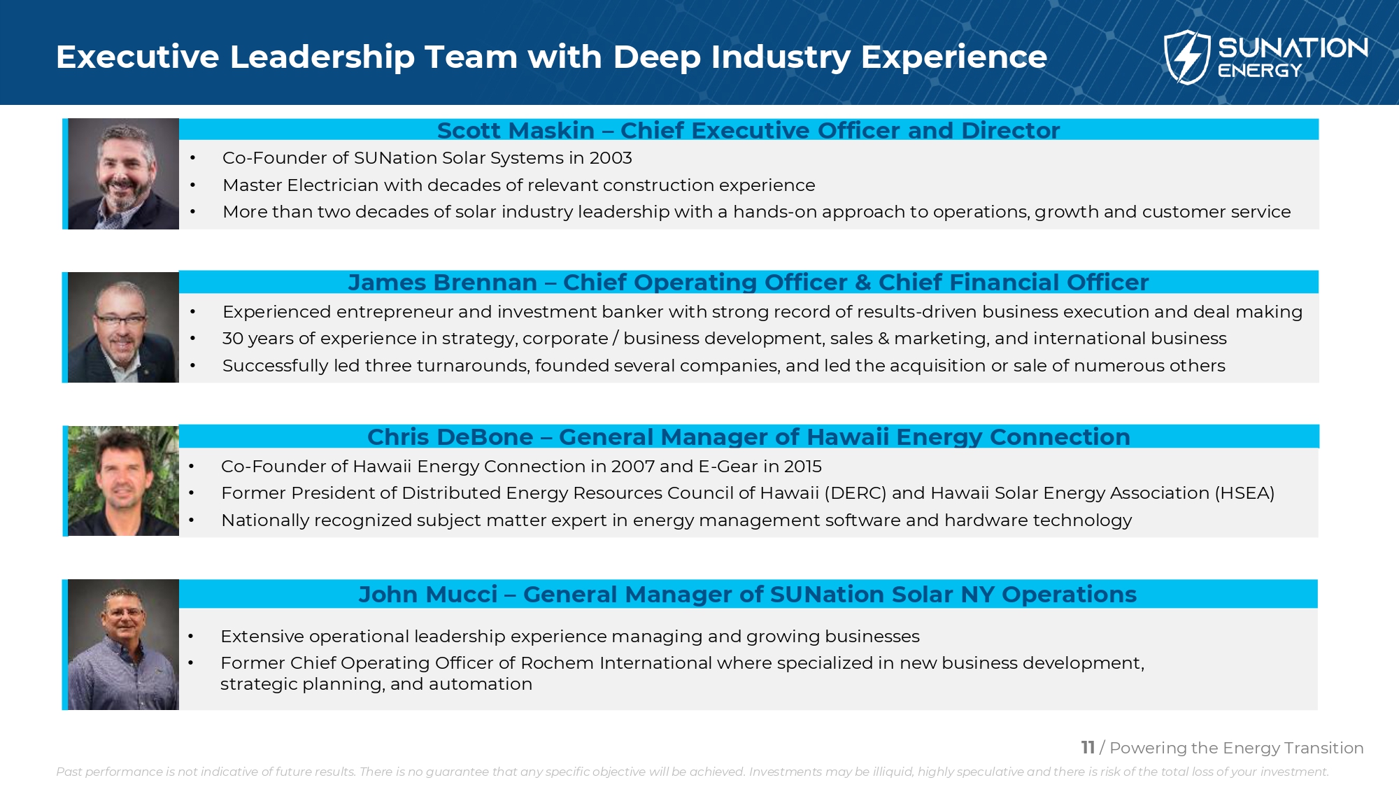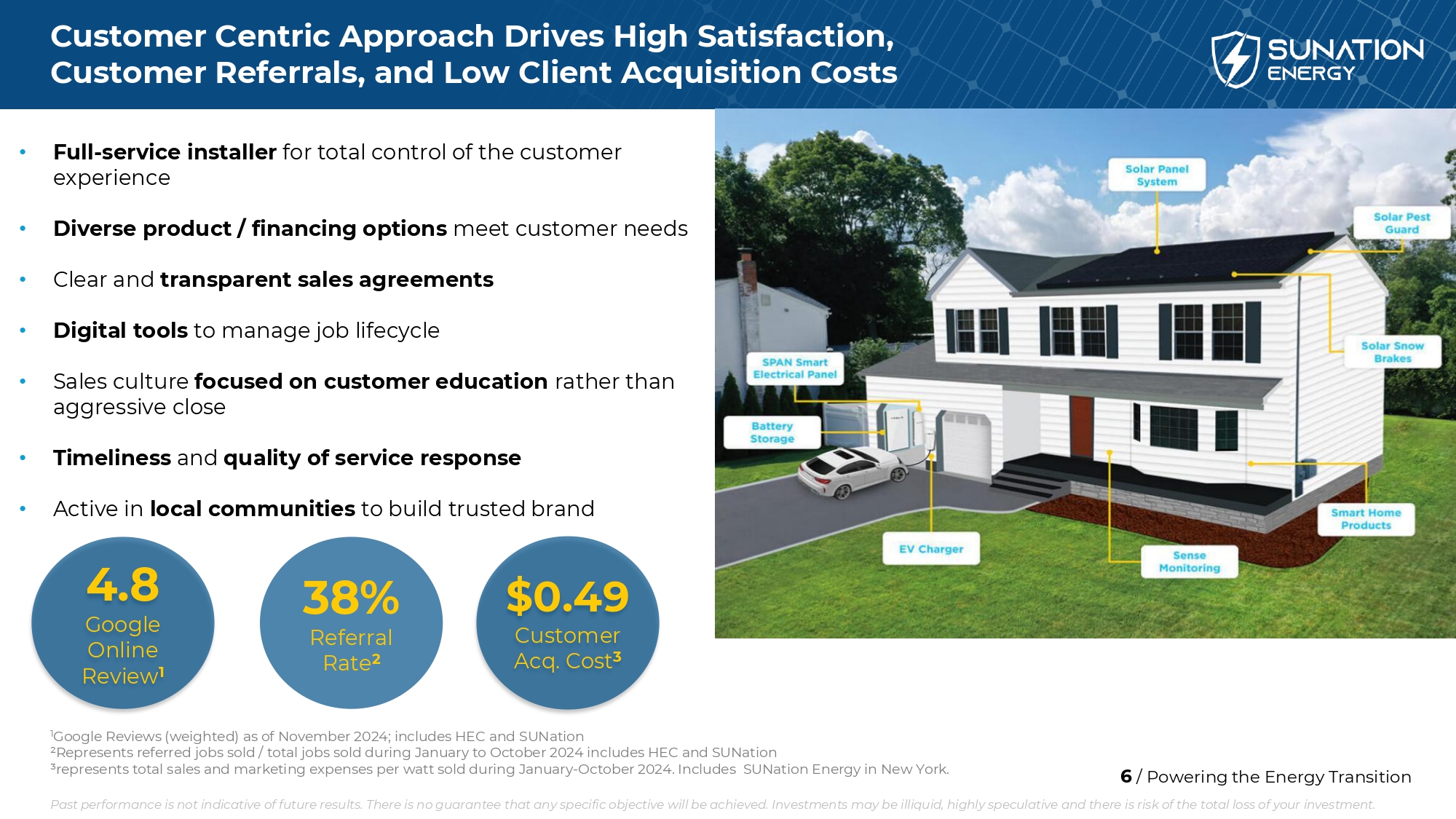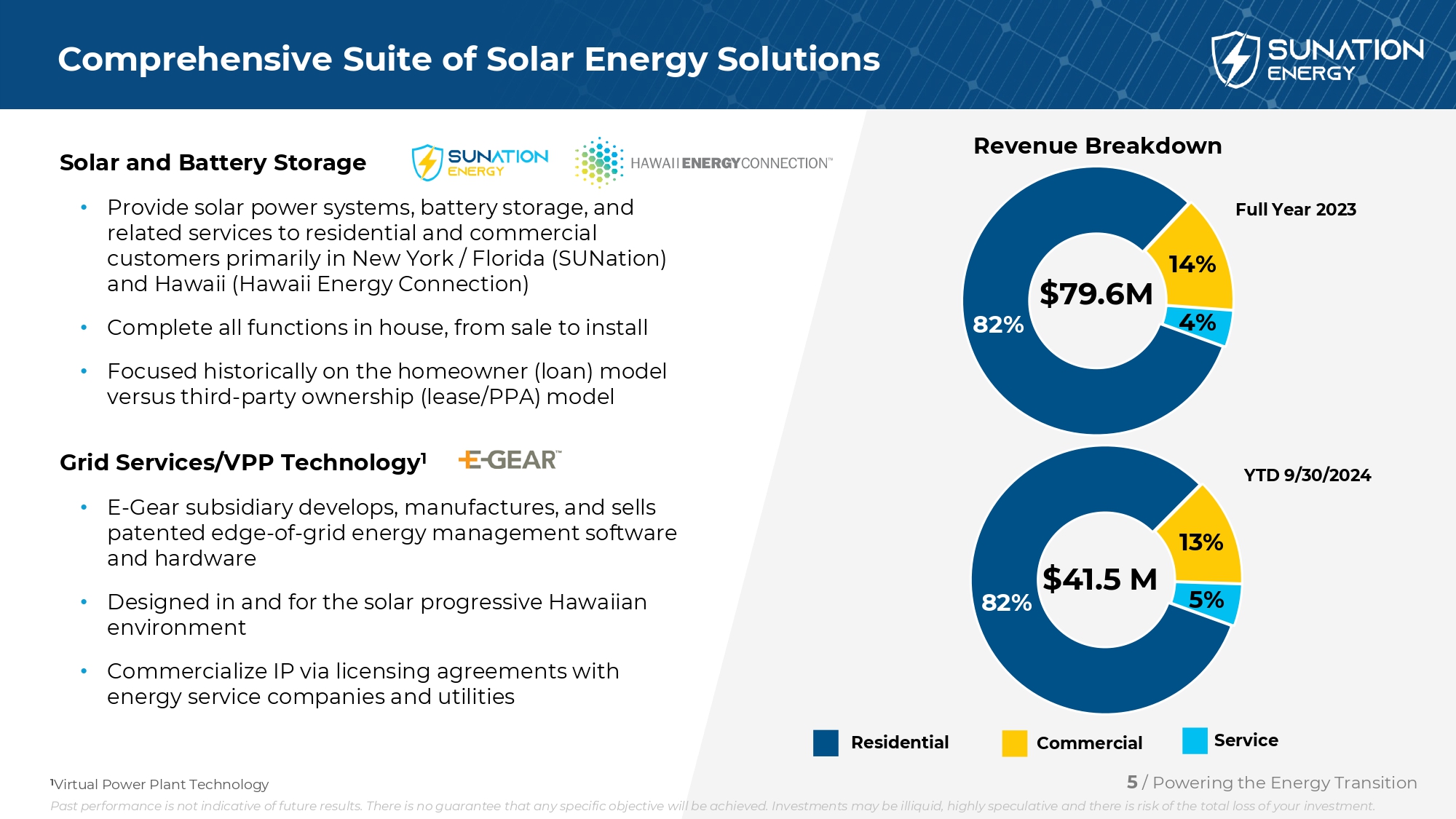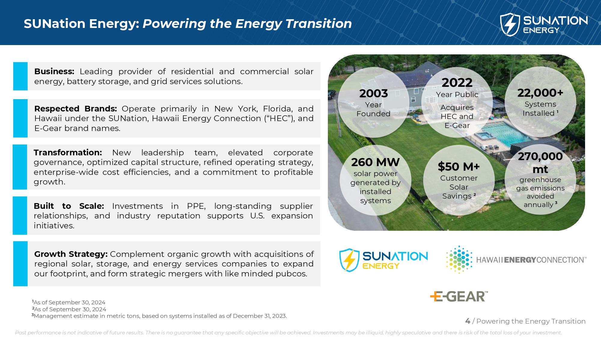 4/Powering the Energy Transition SUNation Energy:Powering the Energy Transition 2022 Year Public acquires HEC and E-Gear 22,000 + systems installed 12003 Year founded $ 50 m + customer solar savings 21 as of September 30,2024 2 as of September 30,2024 business:leading provider of residential and commercial solar energy,battery storage,and grid service solutions。转型:新的领导团队、提升的公司治理、优化的资本结构、精细化的运营战略、全企业的成本效率、对盈利增长的承诺。受尊敬的品牌:主要在纽约、佛罗里达和夏威夷运营SUNation、Hawaii Energy Connection(“HEC”)和E-Gear品牌名称。增长战略:通过收购区域太阳能、存储和能源服务公司来补充有机增长,以扩大我们的足迹,并与志同道合的pubcos形成战略合并。已安装系统产生的260兆瓦太阳能发电每年可避免270,000吨温室气体排放33管理层根据截至2023年12月31日已安装的系统估计,以公吨为单位。为规模而建:对PPE的投资、长期的供应商关系和行业声誉支持美国的扩张计划。过去的表现并不代表未来的结果。不能保证任何具体目标都能实现。inv est ments可能缺乏流动性,投机性强,存在投资全损的风险。