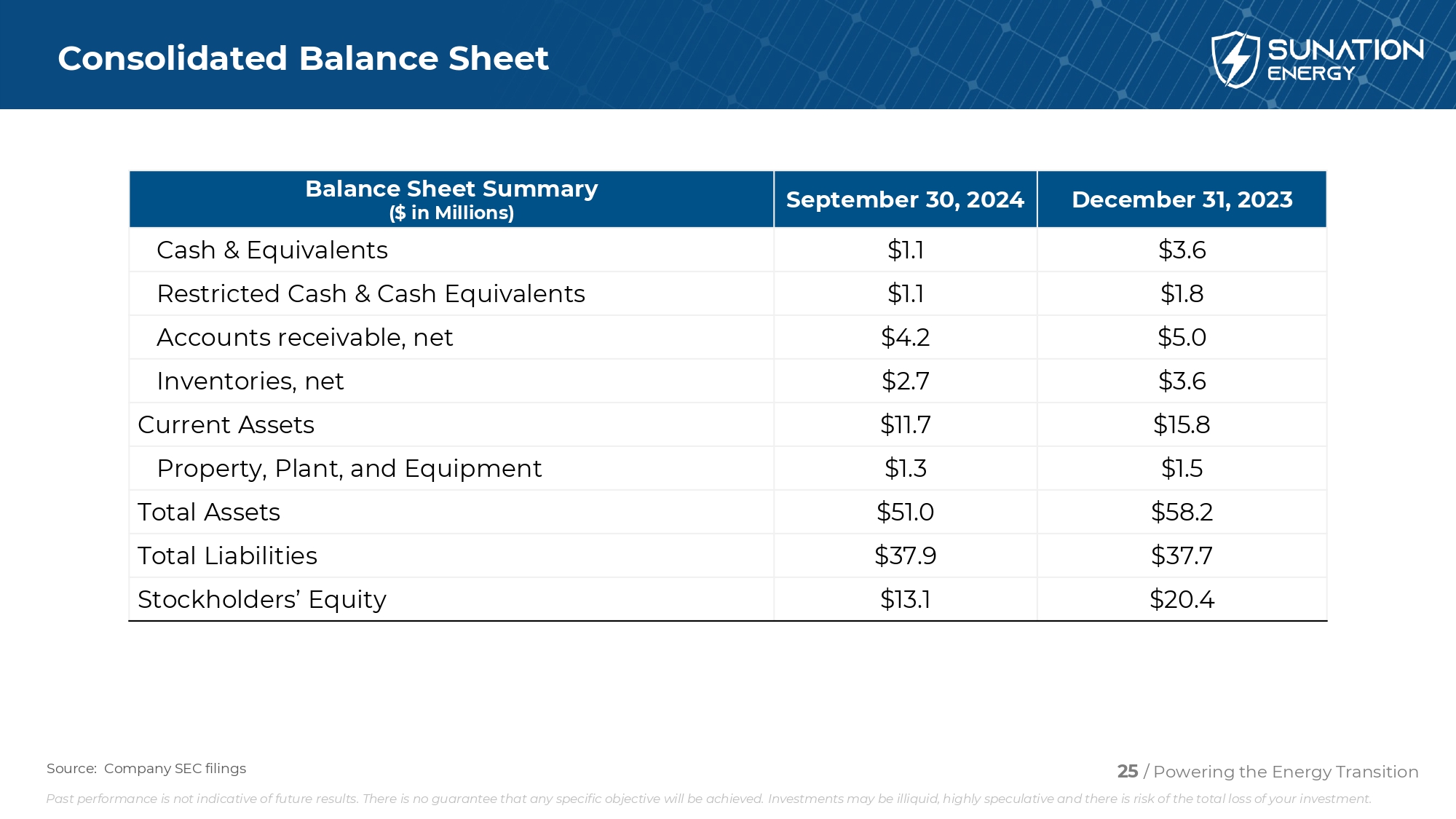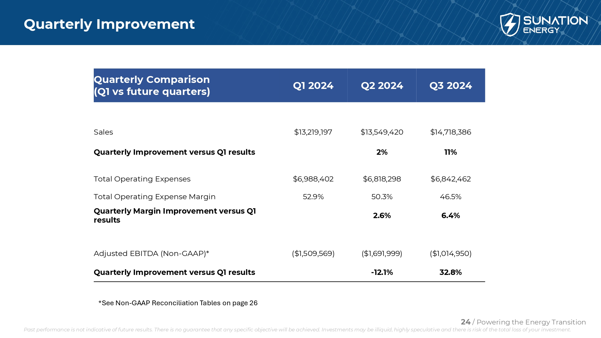季度改善2024年第三季度2024年第二季度2024年第一季度季度比较(第一季度与未来季度)14,718,386美元13,549,420美元13,219,197美元销售额11% 2%季度改善与第一季度业绩相比6,842,462美元6,818,298美元6,988,402美元总营业费用46.5% 50.3% 52.9%总营业费用利润率6.4% 2.6%季度利润率改善与第一季度业绩(1,014,950美元)(1,691,999美元)(1,509,569美元)调整后EBITDA(非公认会计原则)*32.8%-12.1%季度改善对比Q1业绩24/为能源转型提供动力*见第26页的非GAAP调节表过去的业绩并不代表未来的结果。不能保证实现任何具体目标。inv est ments可能缺乏流动性,投机性强,存在投资全损的风险。