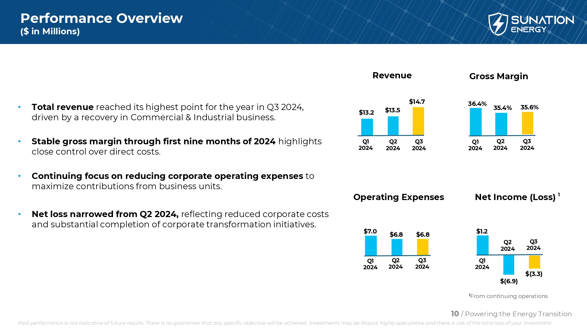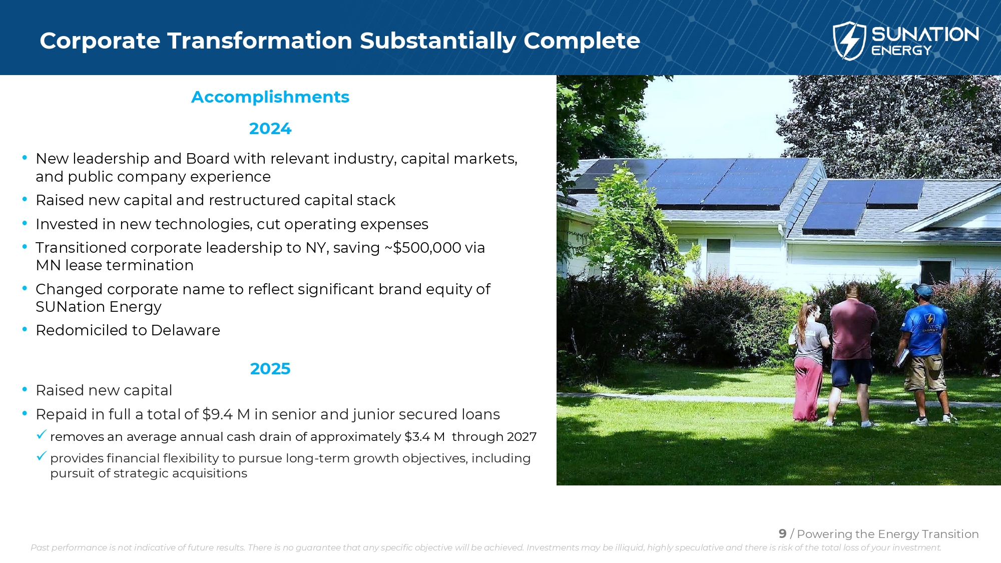 9/为能源转型提供动力企业转型基本完成•具有相关行业、资本市场、上市公司经验的新领导层和董事会•筹集新资本并重组资本堆栈•投资于新技术,削减运营费用•将企业领导层转移至纽约,通过终止MN租约节省约50万美元•更改公司名称以反映SUNation Energy的重要品牌资产•重新搬迁至特拉华州•筹集新资金•全额偿还高级和初级担保贷款总额940万美元x到2027年消除了平均每年约340万美元的现金流失x p rovides财务灵活性以追求长期增长目标,包括追求战略收购成就2024-2025年过去的业绩并不代表未来的结果。不能保证任何具体目标都能实现。inv est ments可能缺乏流动性,投机性强,存在投资全损的风险。