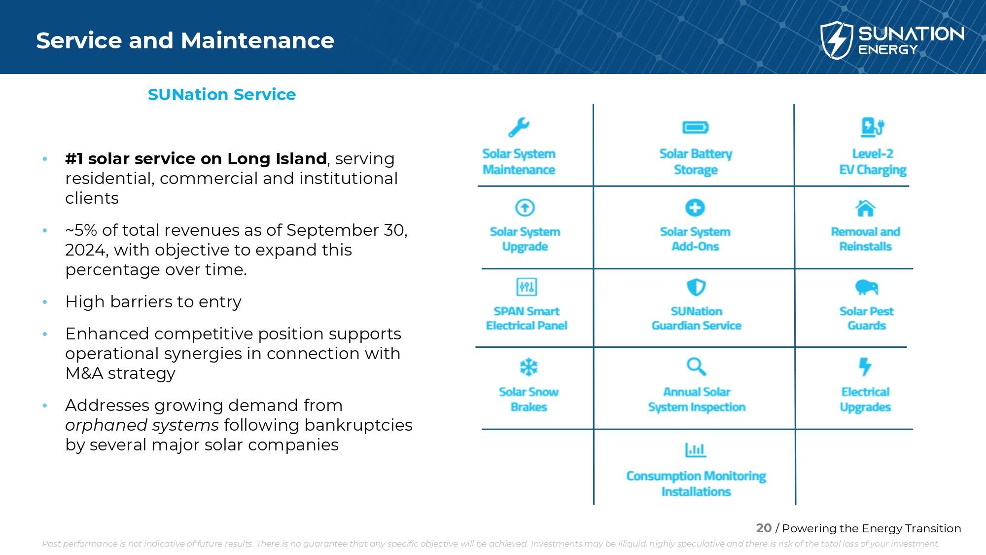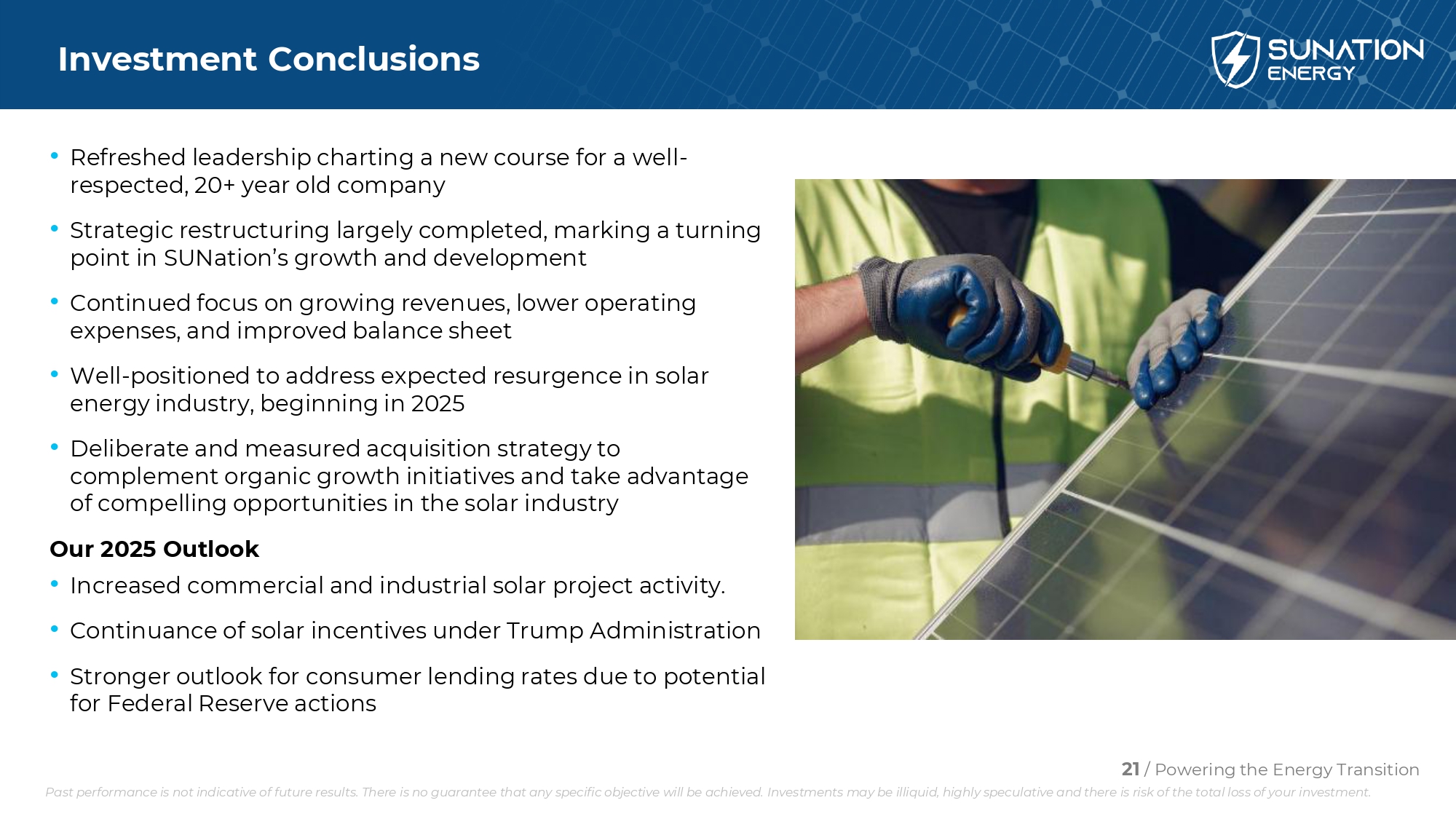 20/Powering the Energy Transition Service and Maintenance • # 1 solar service on Long Island,s erving residential,commercial and institutional clients •~截至2024年9月30日占总收入的5%,目标是随着时间的推移扩大这一百分比。•进入壁垒高•竞争地位增强支持与并购战略相关的运营协同效应•在几家主要太阳能公司破产后,解决孤儿系统不断增长的需求SUNation Service过去的业绩并不代表未来的结果。不能保证实现任何具体目标。inv est ments可能缺乏流动性,投机性强,存在投资全损的风险。