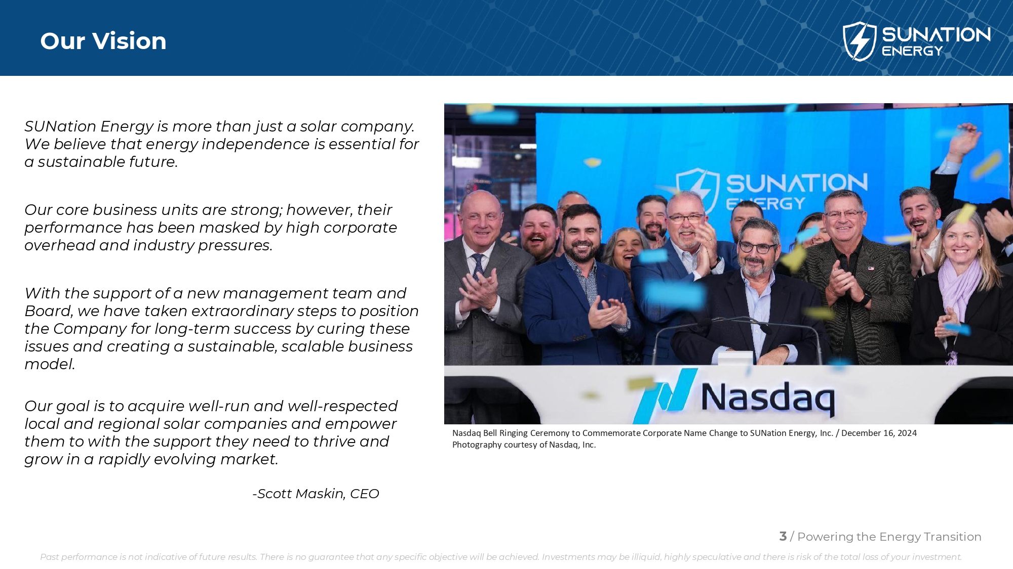 3/为能源转型提供动力我们的愿景SUNation Energy不仅仅是一家太阳能公司。我们认为,能源独立对于可持续的未来至关重要。我们的核心业务部门很强大;然而,它们的业绩被高昂的企业管理费用和行业压力所掩盖。在新的管理团队和董事会的支持下,我们采取了非凡的步骤,通过解决这些问题并创建一个可持续、可扩展的商业模式,为公司的长期成功定位。我们的目标是收购运营良好且受人尊敬的本地和区域太阳能公司,并赋予它们在快速发展的市场中蓬勃发展和增长所需的支持。-Scott Maskin,首席执行官,纳斯达克为纪念公司名称变更为SUNation Energy,Inc.而举行的敲钟仪式/2024年12月16日摄影由纳斯达克公司提供过往业绩并不代表未来业绩。不能保证任何具体目标都能实现。inv est ments可能缺乏流动性,投机性很强,存在投资全损的风险。