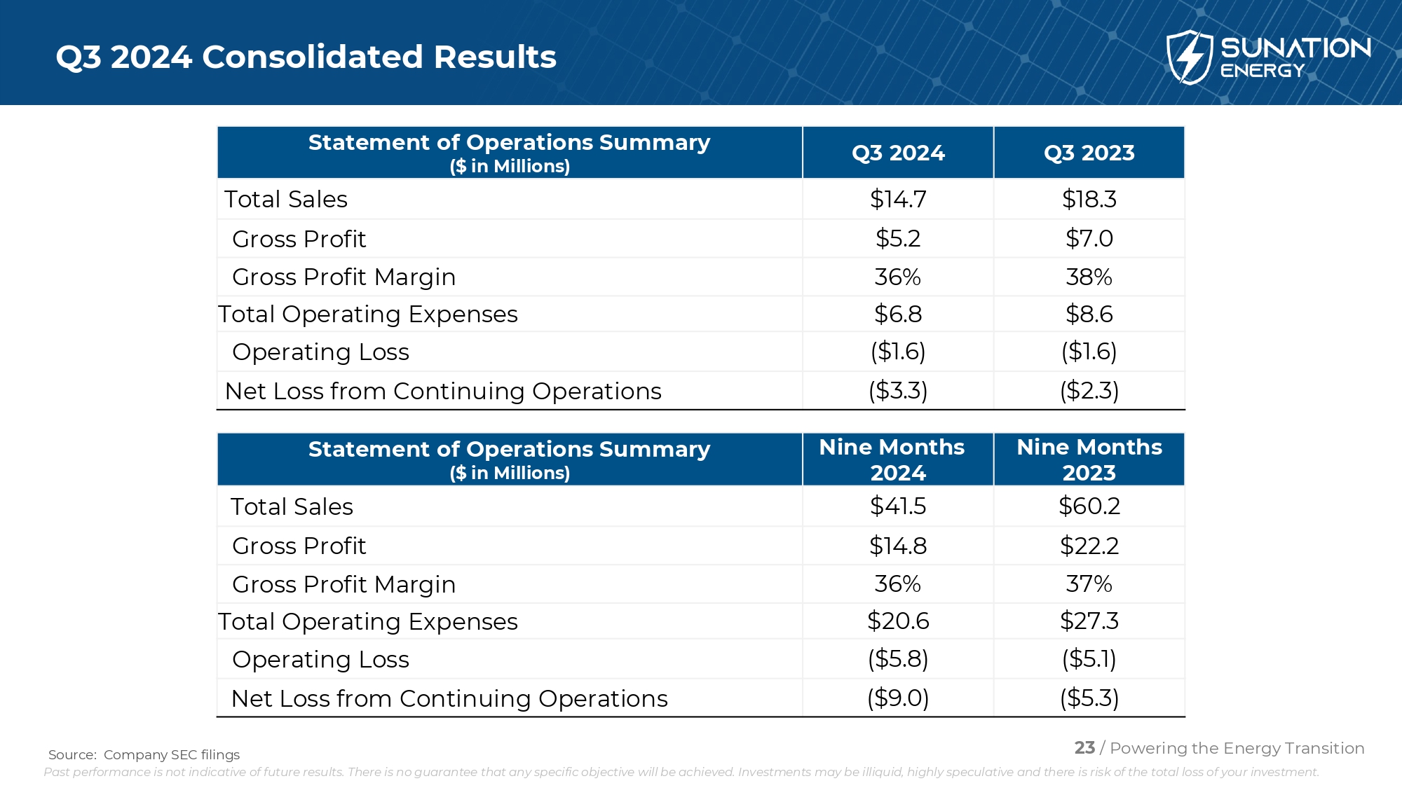 23/为能源转型提供动力2024年第三季度合并业绩2023年第三季度2024年运营报表摘要(百万美元)18.3美元14.7美元总销售额7.0美元5.2美元毛利润38% 36%毛利率8.6美元6.8美元总运营费用(1.6美元)(1.6美元)运营亏损(2.3美元)(3.3美元)2023年九个月持续运营净亏损2024年九个月运营报表摘要(百万美元)60.2美元41.5美元总销售额22.2美元14.8美元毛利润37% 36%毛利率27.3美元20.6美元总运营费用(5.1美元)(5.8美元)运营亏损(5.3美元)(9.0美元)持续运营净亏损来源:公司SEC文件过往业绩不指示未来的结果。不能保证任何具体目标都能实现。inv est ments可能缺乏流动性,投机性强,存在投资全盘亏损的风险。KH0