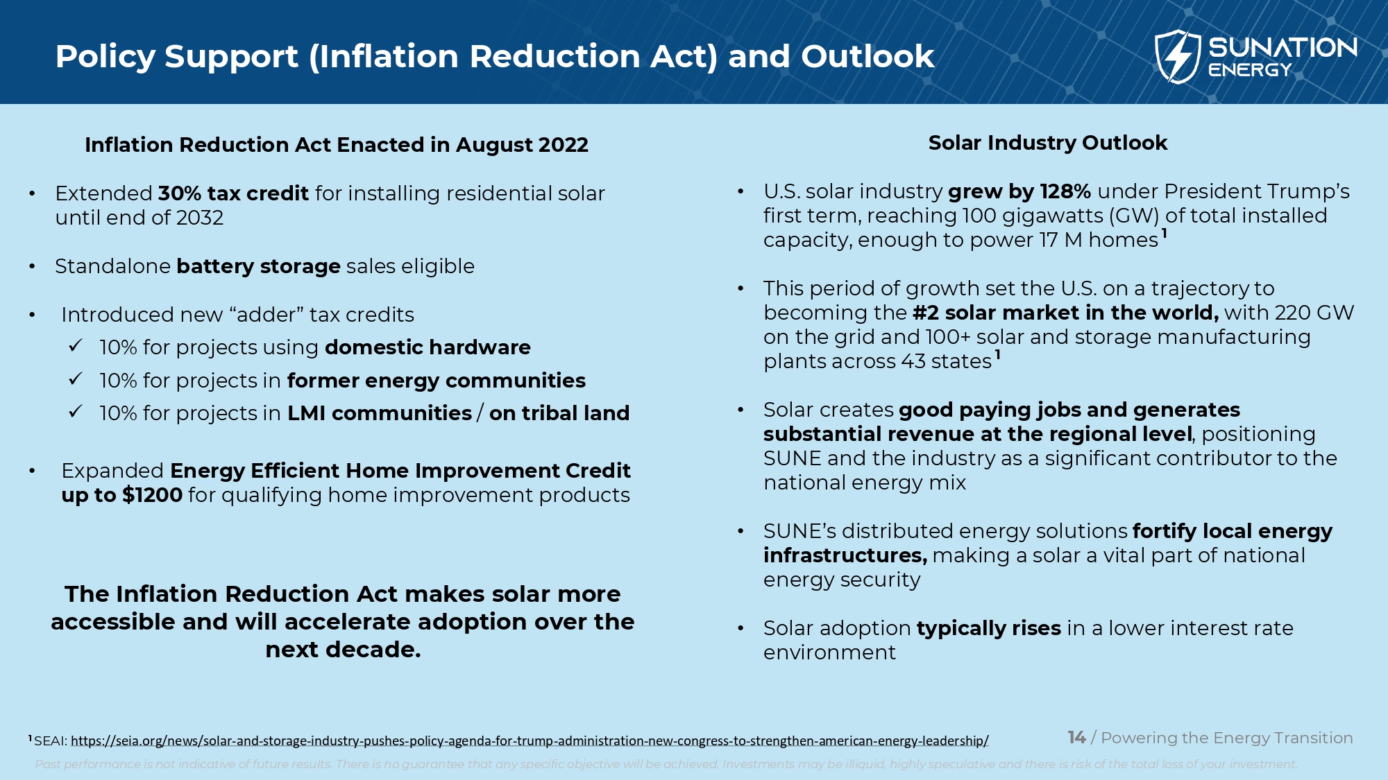 14/为2022年8月颁布的能源转型政策支持(通胀削减法案)和展望通胀削减法案提供动力•将安装住宅太阳能的30%税收抵免延长至2032年底•符合条件的独立电池存储销售•引入新的“加法器”税收抵免x对使用家用硬件的项目征收10% x对前能源社区的项目征收10% x对LMI社区/部落土地上的项目征收10% •对符合条件的家装产品扩大了高达1200美元的节能家装信贷《通胀削减法案》使太阳能更容易获得并将在未来十年加速采用。太阳能行业展望•美国太阳能行业在特朗普总统的第一个任期内增长了128%,总装机容量达到100千兆瓦(GW),足以为1700万户家庭供电1 •这一增长时期使美国走上了成为全球# 2太阳能市场的轨道,在43个州拥有220吉瓦的电网和100多家太阳能和存储制造工厂1 •太阳能创造了良好的薪酬就业机会,并在区域一级产生了可观的收入,将SUNE和该行业定位为国家能源结构的重要贡献者• SUNE的分布式能源解决方案加强了当地的能源基础设施,使太阳能成为国家能源安全的重要组成部分•太阳能采用率通常会在较低利率环境中上升1 SEAI:https://seia.org/news/solar-和-存储-行业-推动-政策-议程-为-特朗普-行政-新-国会-加强-美国-能源-领导地位/过去的表现并不代表未来的结果。不能保证任何具体目标都能实现。inv est ments可能缺乏流动性,投机性强,存在投资全损的风险。