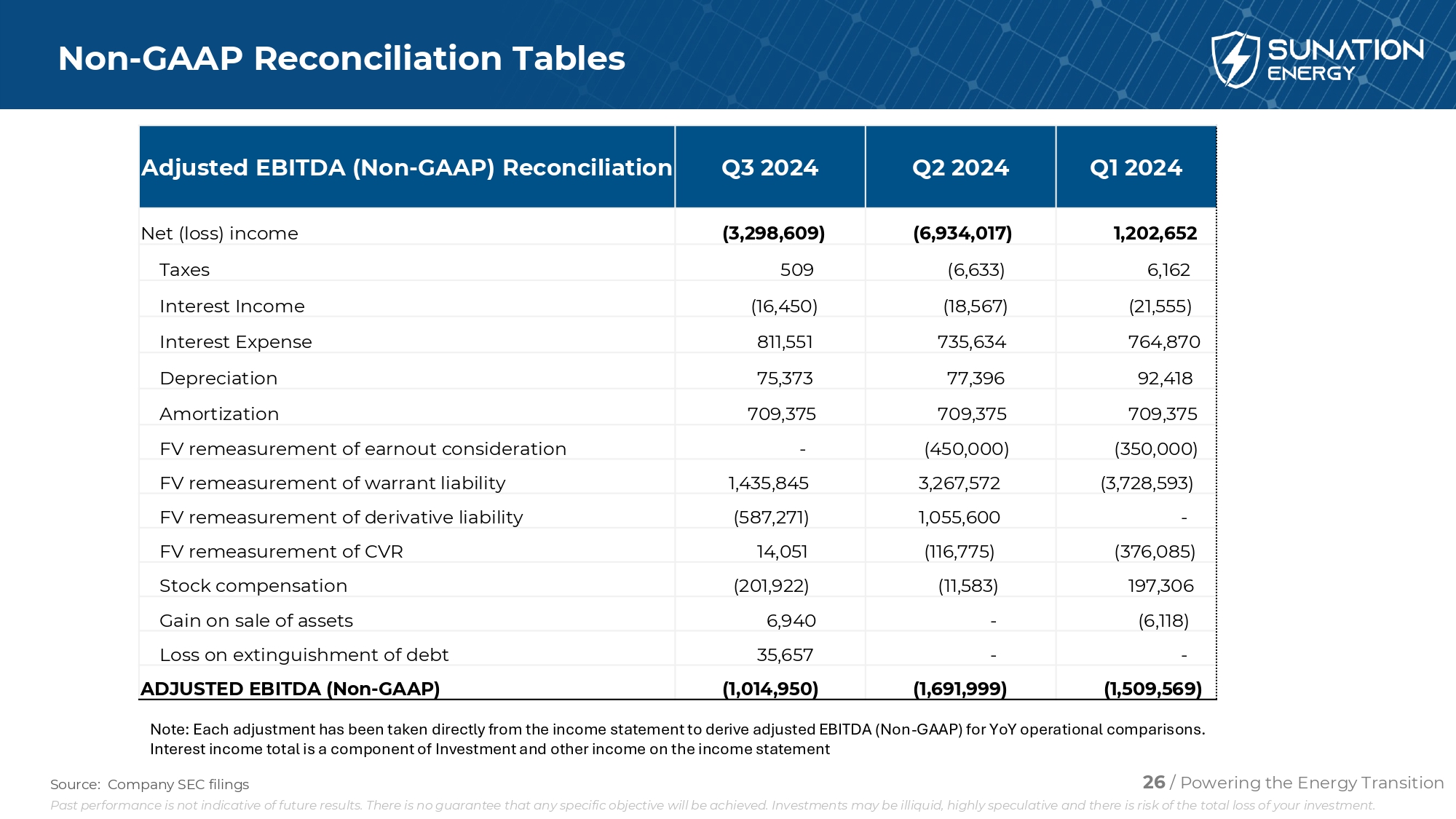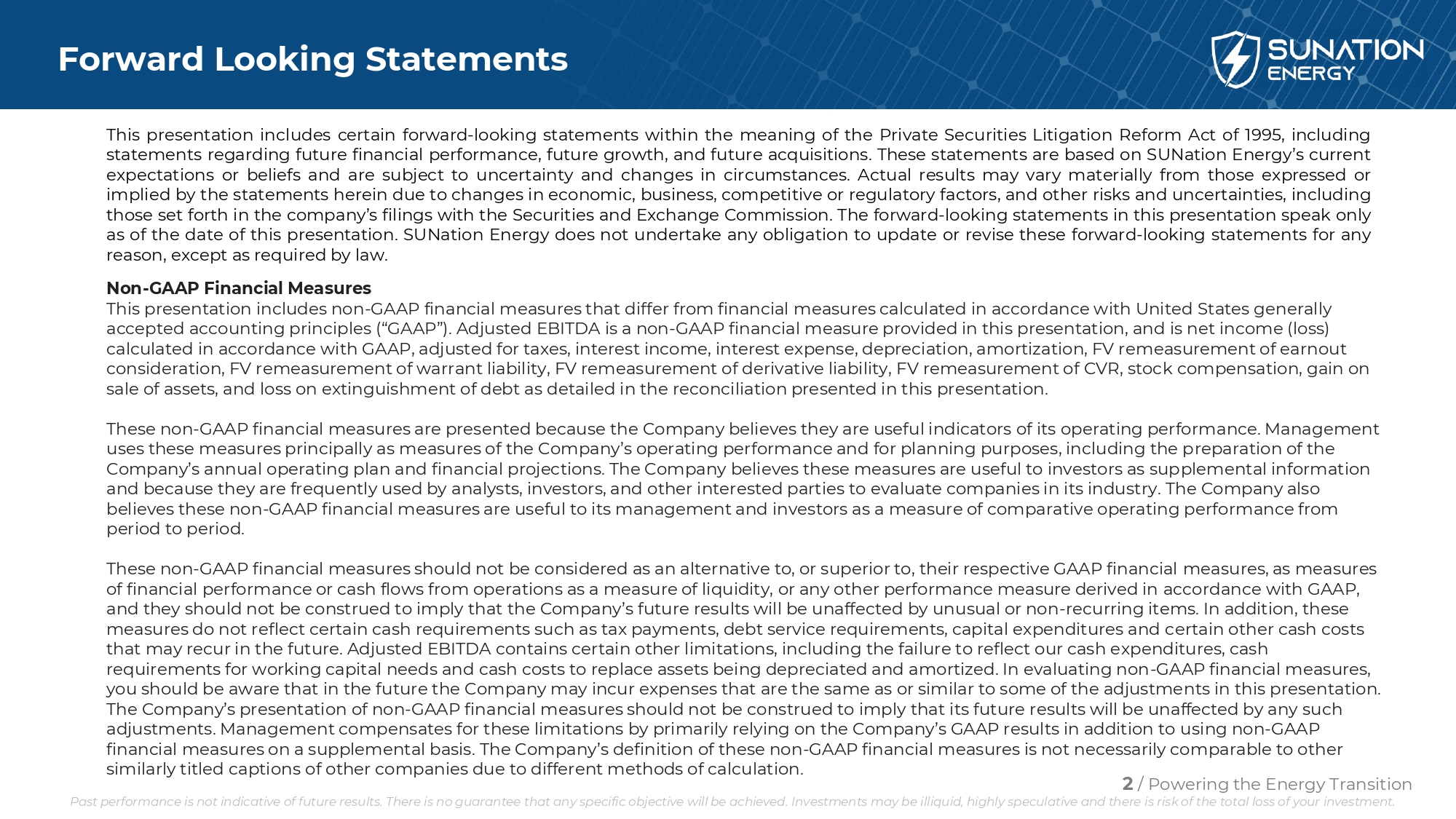 2/为能源转型提供动力前瞻性陈述本演示文稿包括1995年《私人证券诉讼改革法案》含义内的某些前瞻性陈述,包括有关未来财务业绩、未来增长和未来收购的陈述。这些陈述基于SUNation Energy当前的预期或信念,并受到不确定性和环境变化的影响。由于经济、商业、竞争或监管因素的变化以及其他风险和不确定性,包括公司提交给美国证券交易委员会的文件中所述的风险和不确定性,实际结果可能与本文陈述中明示或暗示的结果存在重大差异。本演示文稿中的前瞻性陈述仅在本演示文稿发布之日发表。SUNation Energy不承担任何义务以任何理由更新或修改这些前瞻性陈述,除非法律要求。非美国通用会计准则财务指标本演示文稿包括与根据美国公认会计原则(“GAAP”)计算的财务指标不同的非美国通用会计准则财务指标。调整后EBITDA是本演示文稿中提供的非GAAP财务指标,是根据GAAP计算的n et收入(亏损),经调整后的税项、利息收入、利息费用、折旧、摊销、FV REM EAS对盈利对价的计量、权证负债的FV重新计量、衍生负债的FV重新计量、CVR的TERM3重新计量、stoc k c补偿、资产出售收益和债务清偿损失,详见本演示文稿中的对账。之所以提出这些非公认会计准则财务指标,是因为该公司认为它们是衡量其经营业绩的有用指标。管理层主要将这些措施作为公司经营业绩的衡量标准,并用于规划目的,包括公司年度经营计划和财务预测的p rep aration。该公司认为,这些措施作为补充心理信息对投资者很有用,因为分析师、投资者和其他感兴趣的各方经常使用这些措施来评估其行业中的公司。该公司还认为,这些非公认会计准则财务指标对其管理层和投资者有用,可作为衡量不同时期的比较经营业绩的指标。这些非GAAP财务指标不应被视为其各自的GAAP财务指标的替代或优于其各自的GAAP财务指标,作为财务业绩或经营活动现金流量的衡量指标,或任何其他与GAAP一致的业绩衡量指标,也不应被解释为暗示公司未来业绩将不受不寻常或非经常性项目的影响。此外,这些措施并不反映某些现金需求,例如纳税、偿债要求、资本支出以及未来可能出现的其他现金成本。调整后的EBITDA包含某些其他限制,包括未能反映我们的现金e xpe nditures、营运资金需求的现金需求以及用于替换正在折旧和摊销的资产的现金成本。在评估非GAAP财务指标时,您应该意识到,未来公司可能会产生与本演示文稿中的某些调整NTS相同或相似的费用。该公司提出的非GAAP财务指标不应被解释为暗示其未来业绩将不受任何此类调整的影响。管理层主要依靠公司的GAAP业绩以及补充基础上的U sin g non-GAAP财务指标来弥补这些限制。由于计算方法不同,该公司对这些非公认会计准则财务指标的定义不一定与其他公司的其他类似标题的标题具有可比性。过去的表现并不代表未来的结果。不能保证任何具体目标都能实现。inv est ments可能缺乏流动性,投机性强,存在投资全损的风险。