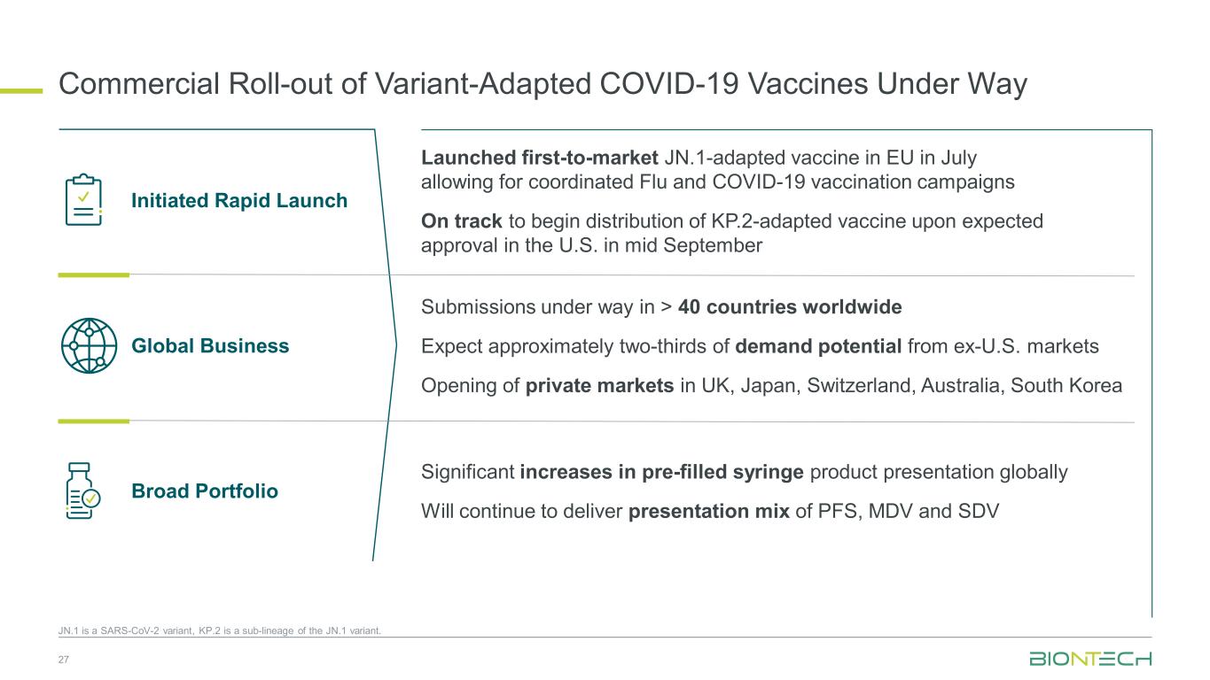 27 JN.1是一种SARS-CoV-2变异株,KP.2是JN.1变异株的一个亚谱系。已启动快速启动全球业务全球预充式注射器产品展示显着增加将继续提供PFS、MDV和SDV的展示组合正在全球超过40个国家进行提交,预计约三分之二的需求潜力来自美国以外地区。打开英国、日本、瑞士、澳大利亚、韩国的私人市场,于7月在欧盟推出了首个上市的JN.1适配疫苗,允许开展协调一致的流感和新冠疫苗接种活动,并有望于9月中旬在美国开始分发预期批准的KP.2适配疫苗广泛的产品组合