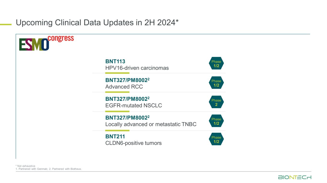 即将在2024年2月更新的临床数据 * *并非详尽无遗1。与Genmab合作;2。与Biotheus合作。BNT113HPV16驱动的癌症BNT327/PM80022晚期RCC BNT327/PM80022 EGFR突变的NSCLC BNT327/PM80022局部晚期或转移性TNBC BNT211 CLDN6阳性肿瘤1/2期1/2期1/2期2期1/2期