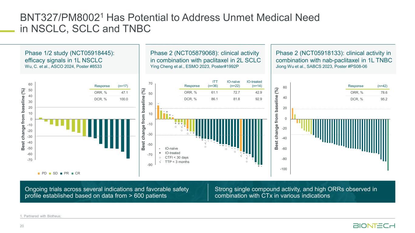 -90-70-50-30-10 10305070 2期(NCT05918133):联合NAB-紫杉醇在1L TNBC中的临床活性Jiong Wu等,SABCS2023,海报# PS08-06 2期(NCT05879068):联合紫杉醇在2L SCLC中的临床活性Ying Cheng等,ESMO 2023,海报# 1992P 1/2期研究(NCT05918445):1L NSCLC中的疗效信号Wu,C.等,ASCO 2024,海报# 8533 BNT327/PM80021有可能解决NSCLC、SCLC和TNBC 201中未满足的医疗需求。与Biotheus合作;基于超过600名患者的数据建立的跨多个适应症的正在进行的试验和有利的安全性,强大的单一化合物活性,以及在各种适应症中与CTX联合观察到的高ORR Be ST c ha ng e fro m bas el in e(%)-100 60400-20-40-80 20-60---+-+○ + √ ○ + ○-+ + +-√ ○--+-√ ○--+-○--√ +-√ ○-+-+-IO-na ï ve + IO-treated ○ CTFI < 30 days √ TTP < 3个月响应ITT(n = 36)IO-na ï ve(n = 22)IO-treated(n = 14)ORR,% 61.17 2.74 2.9 DCR,% 86.18 1.89 2.9 Response(n = 42)ORR,% 78.6 DCR,% 95.2 Be ST c ha ng e from m b as el in e(%)CRSDPD PR Be ST c ha ng e from m b as el in e(%)Response(n = 17)ORR,% 47.1 DCR,% 100.0-70-60-50-40-30-20-10 010203040506070